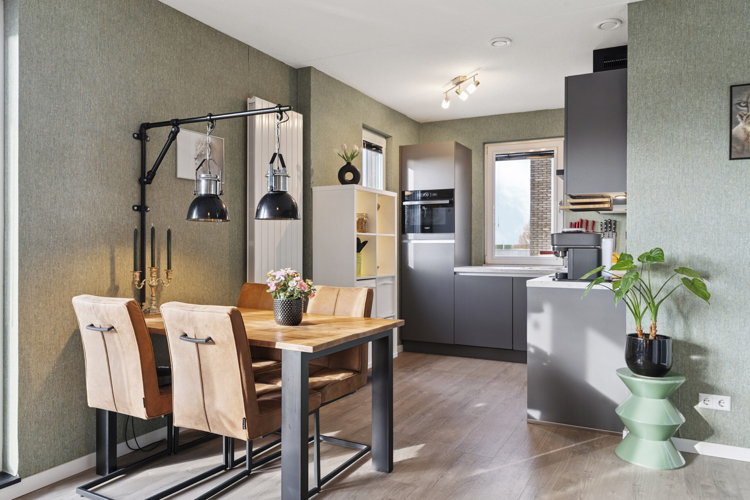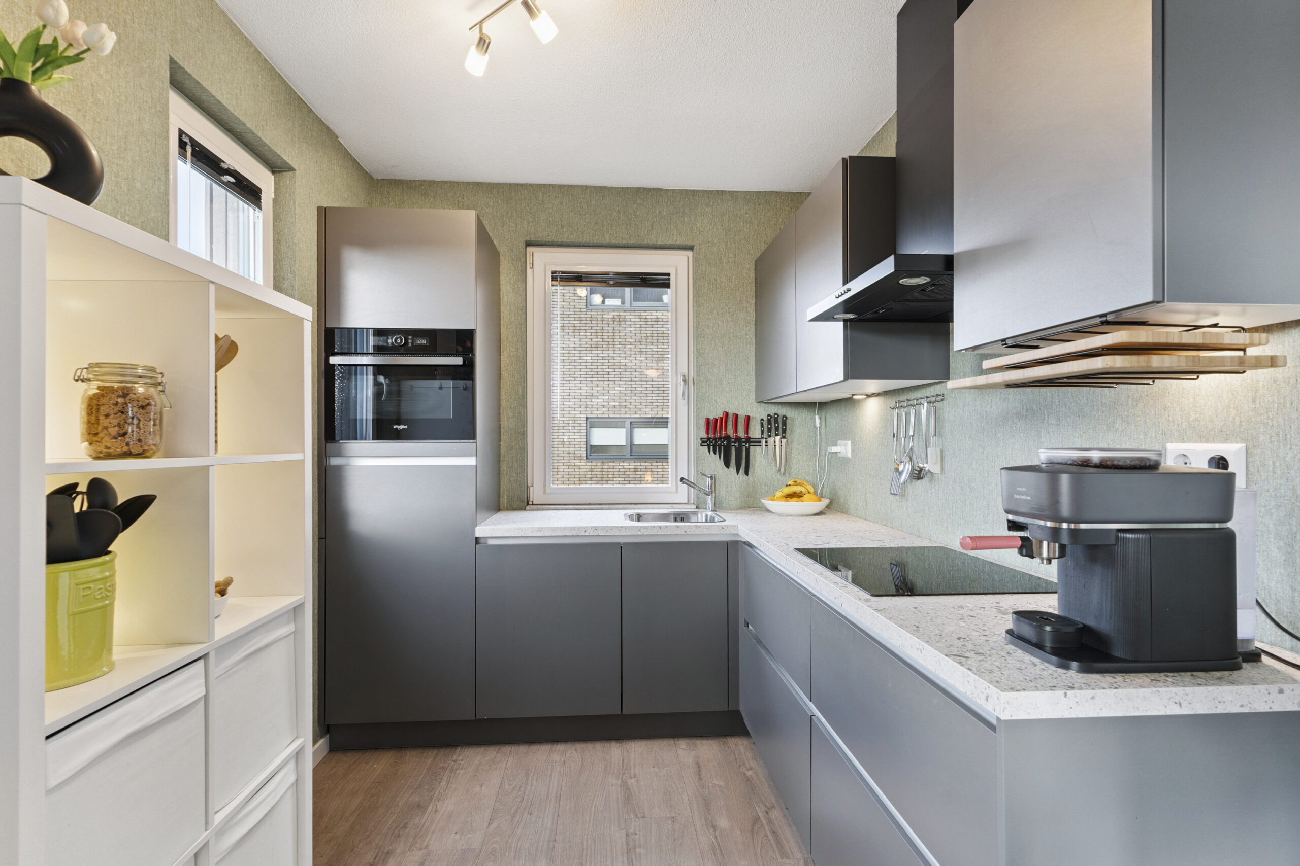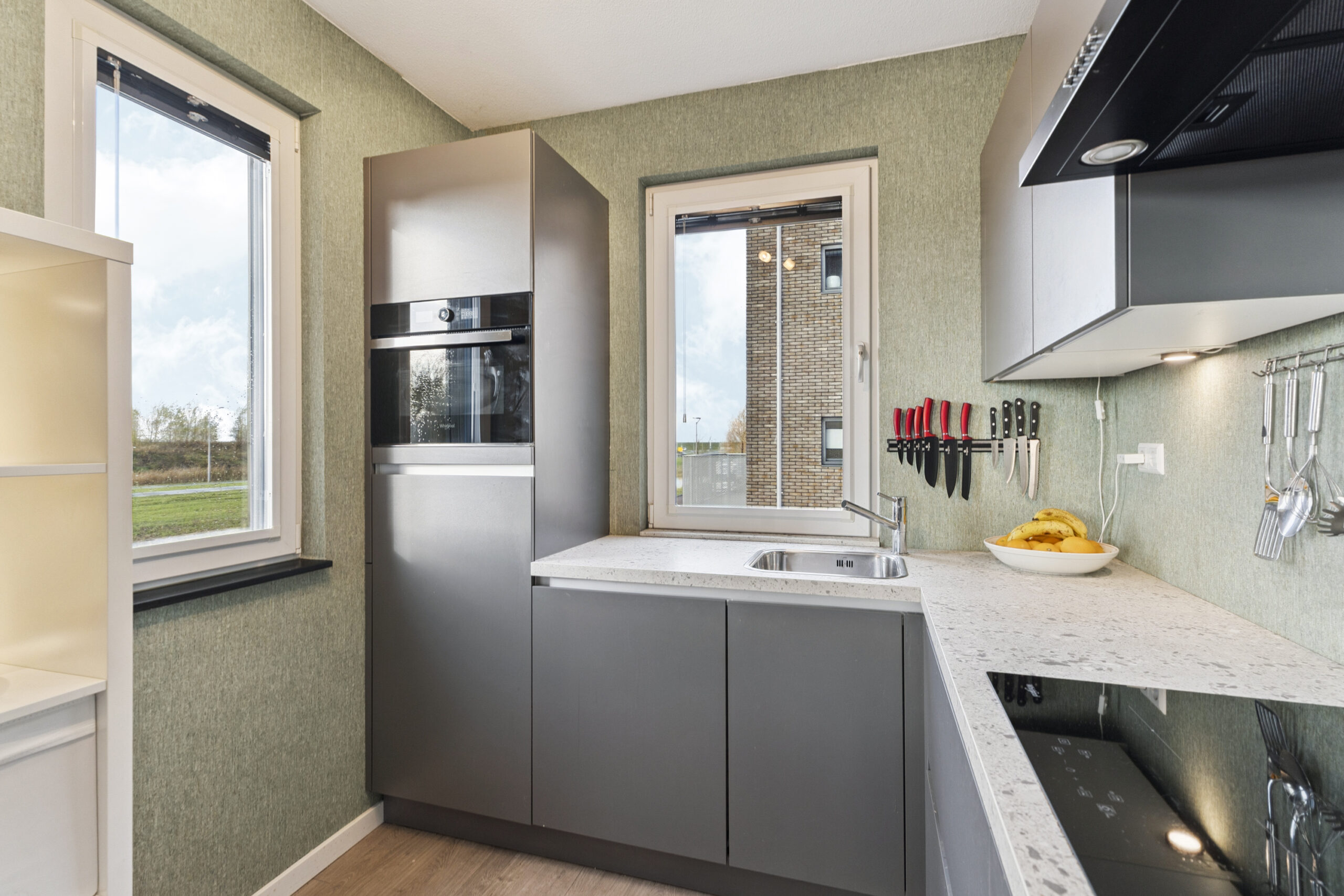 De moderne hoekkeuken biedt veel opbergruimte en is voorzien van een inductie kookplaat met afzuigschouw, een combi-oven/magnetron en een koel-vriescombinatie. Bovendien zorgt het keukenraam voor extra licht en een prettig zicht naar buiten. Er is daarnaast voldoende ruimte voor een gezellige eethoek. Via een deur in de woonkamer bereik je een afgesloten hal die toegang geeft tot de twee slaapkamers en de badkamer.