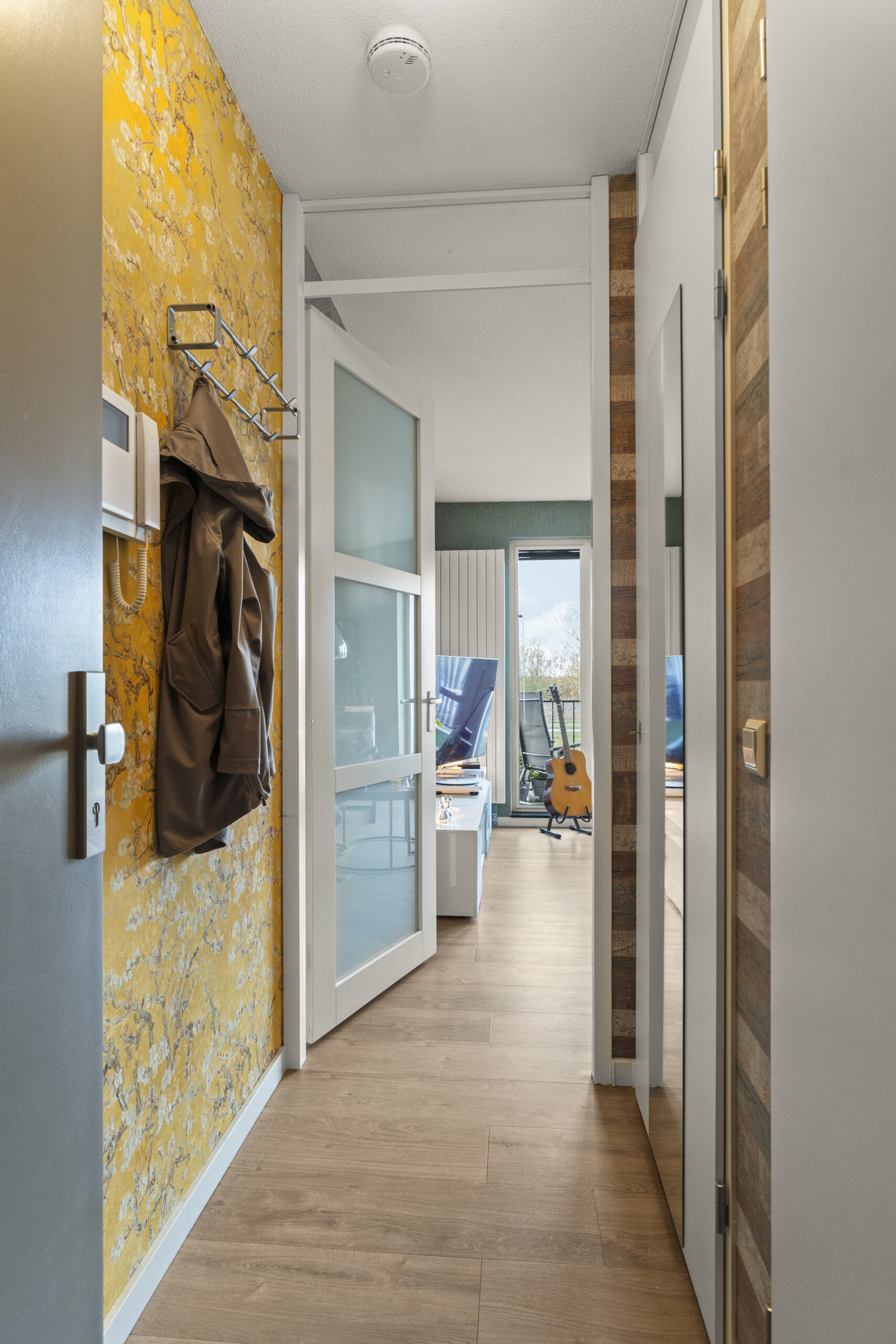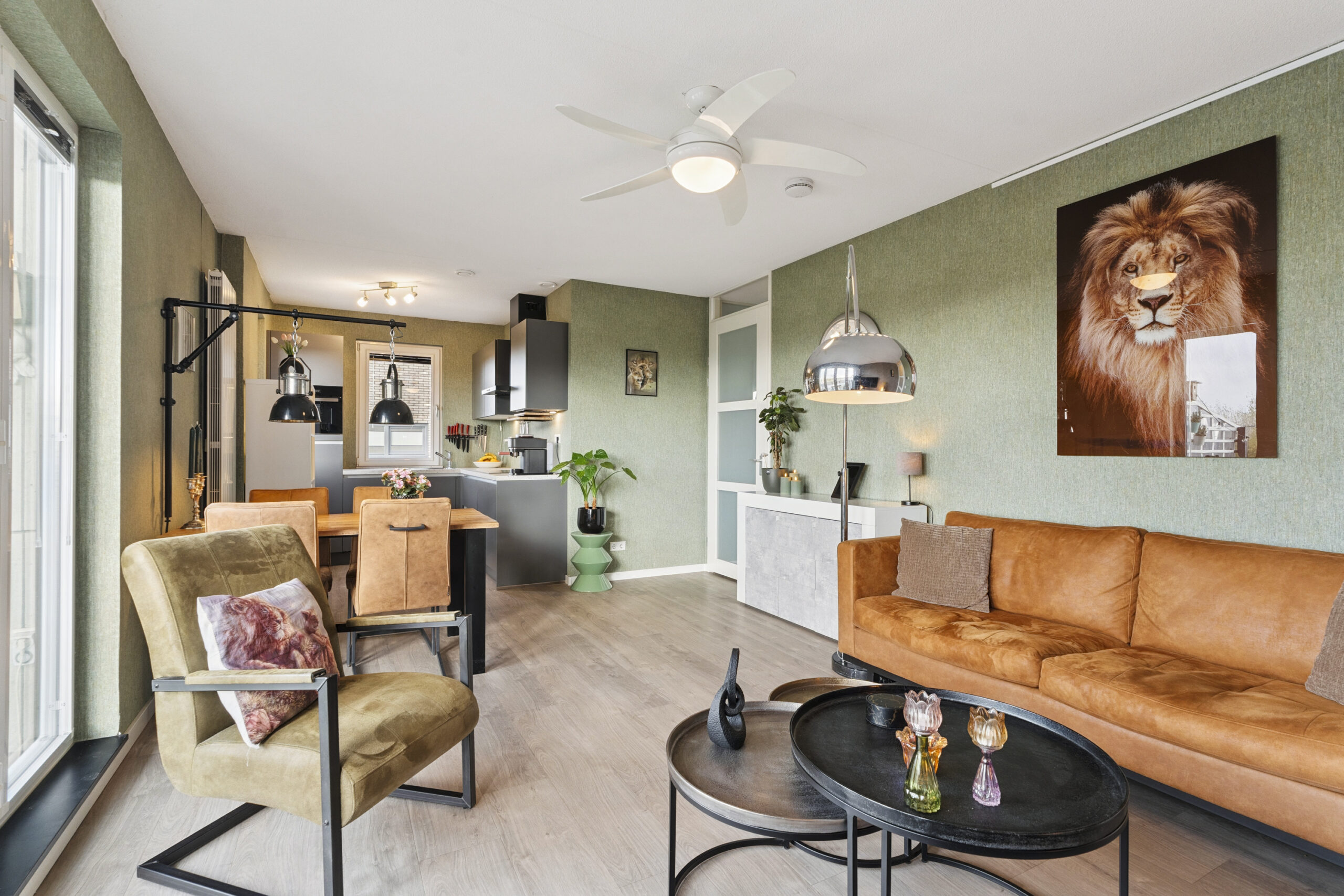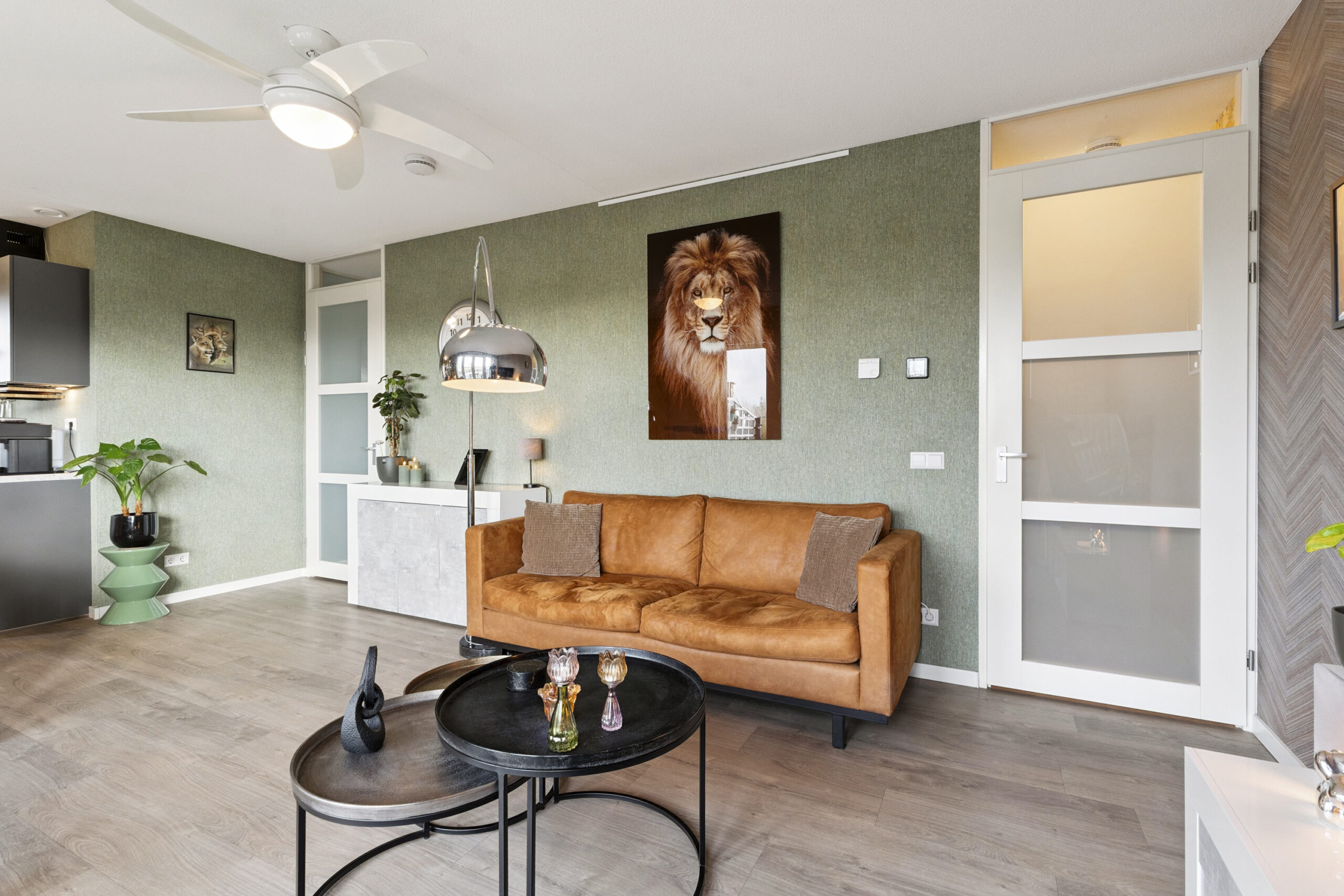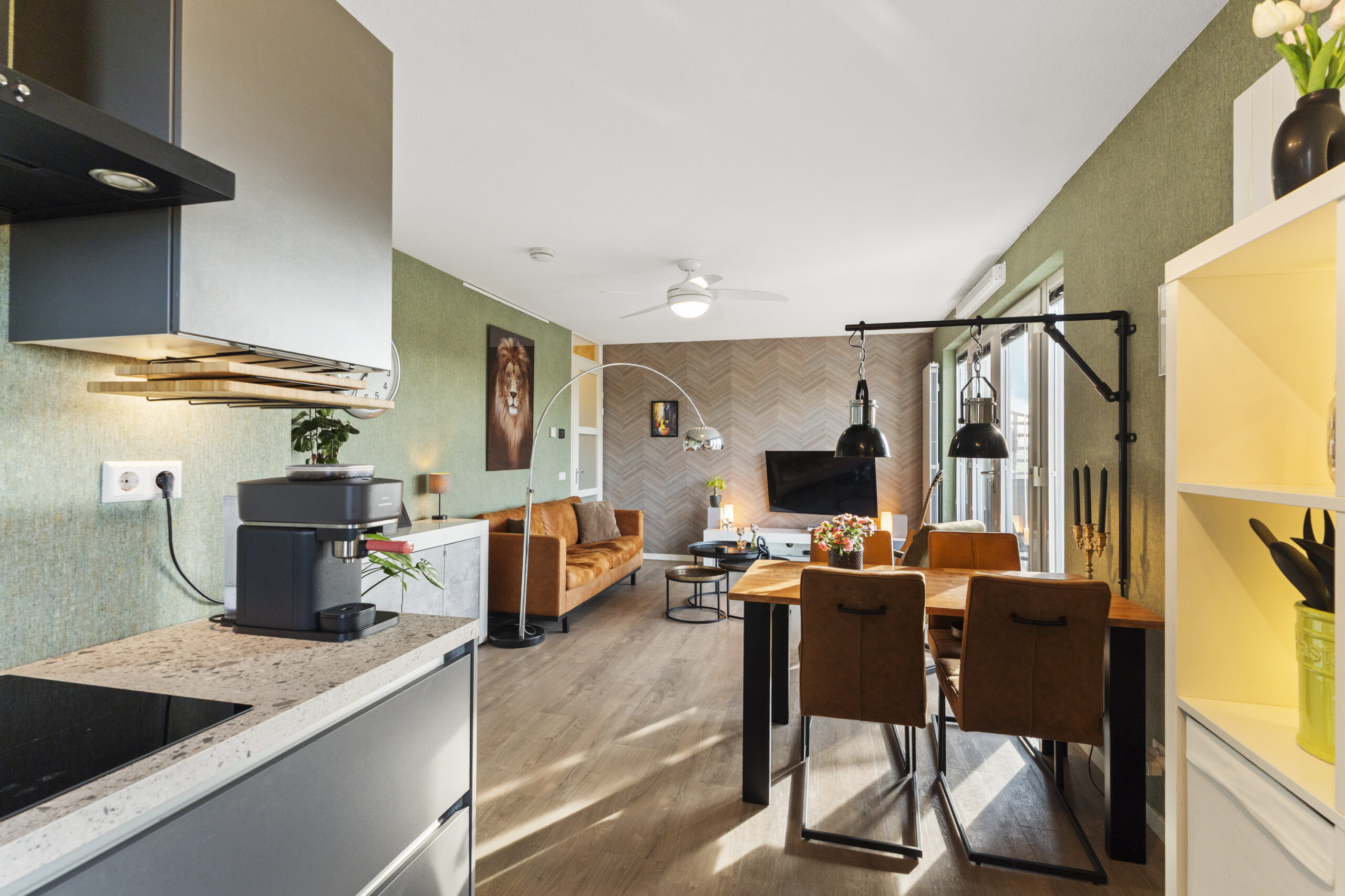 Via de entree heb je direct toegang tot de meterkast en een extra opbergruimte. Vervolgens stap je de moderne woonkamer binnen, die met een oppervlakte van circa 23 m² een fijne, lichte leefruimte vormt. Dankzij de grote ramen valt er volop daglicht naar binnen en geniet je van een vrij uitzicht. De muren zijn strak afgewerkt en de doorlopende laminaatvloer geeft de ruimte een warme en uitnodigende uitstraling.