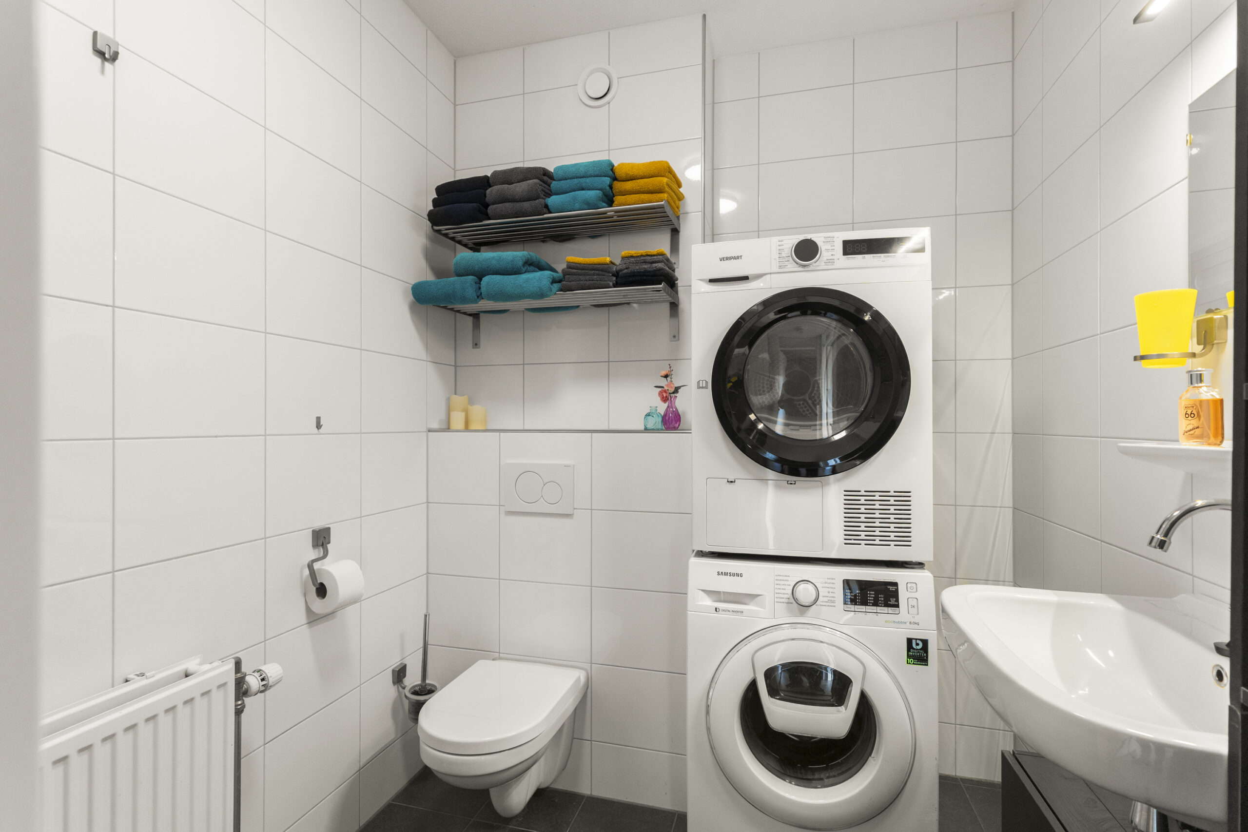 De volledig betegelde badkamer van circa 5 m² is functioneel ingericht. Deze ruimte is voorzien van een vrijhangend toilet, een wastafel en aansluitingen voor zowel wasmachine als droger.