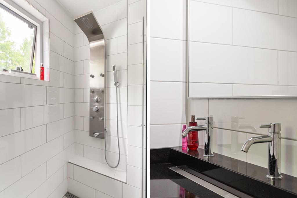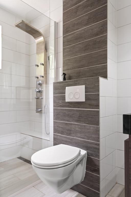 De badkamer is uitgerust met een keurige inloopdouche voorzien van een luxe douchepaneel, een toilet en een dubbele wastafel met bijpassend meubel. Een spiegel met verlichting en een raampje zorgen voor extra daglicht. De neutrale kleurstelling straalt rust en ruimte uit in deze verzorgde badkamer.