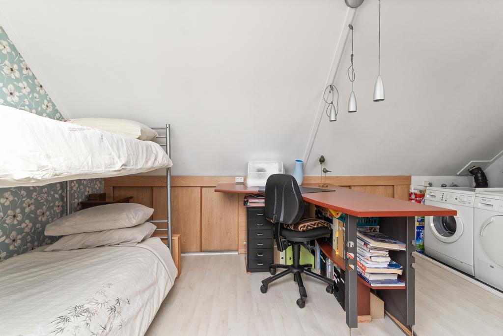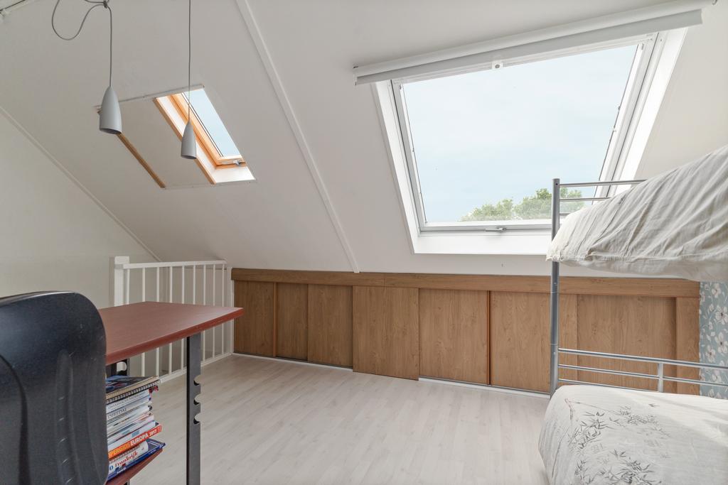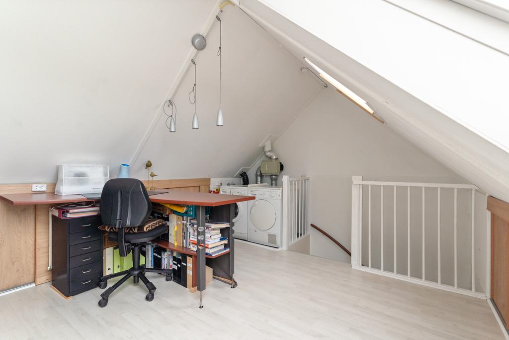 De open zolder, met veel bergruimte achter knieschotten en handige aansluitingen voor wasmachine en droger, biedt veelzijdigheid en praktische opslagmogelijkheden. Momenteel is de ruimte in gebruik als ruime slaapkamer, maar het is mogelijk om hier zelfs nog een extra vierde slaapkamer te realiseren.
