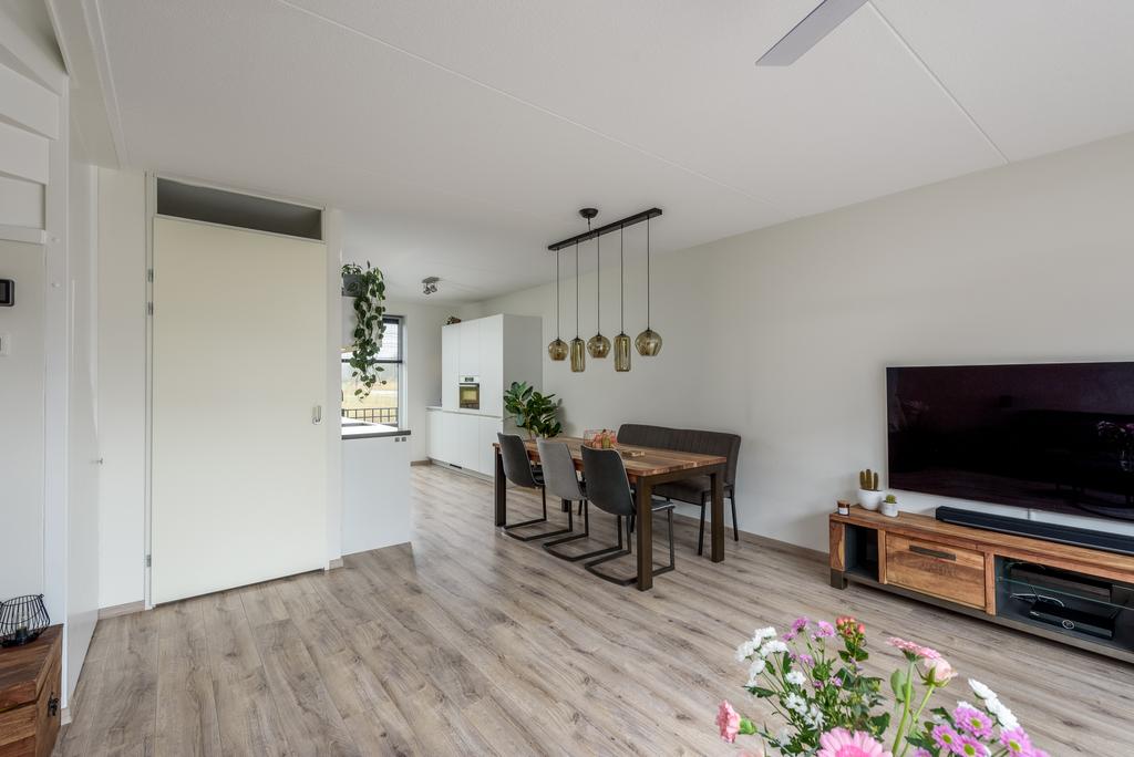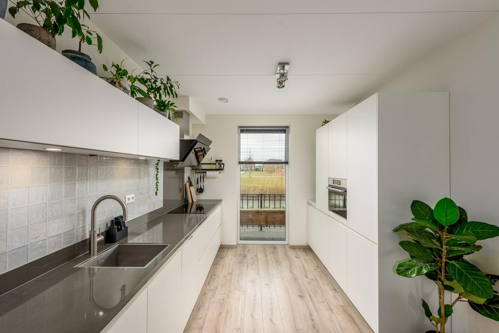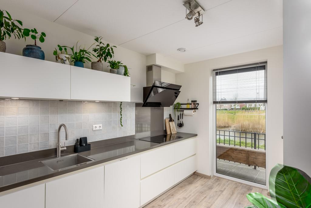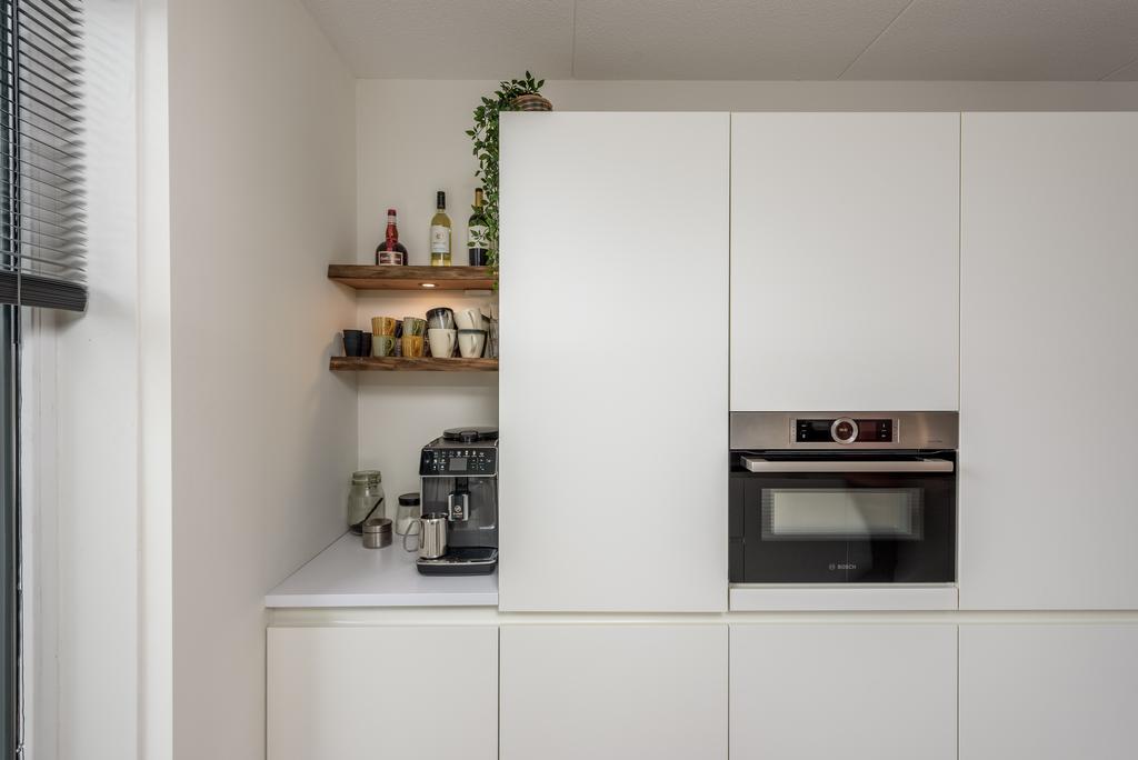 De woonkamer en keuken zijn strak, maar warm afgewerkt en voorzien van een mooie laminaatvloer met vloerverwarming. De open (gerenoveerde) keuken is van alle gemakken voorzien, waaronder een afzuigkap, spoelbak, Quooker, vaatwasser, luxe combi-oven met o.a. een zelfreinigende pyrolyse functie en inductie kookplaat, en biedt veel bergruimte.
