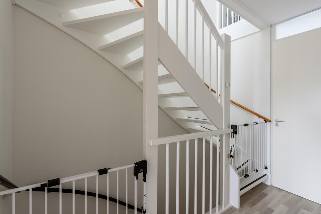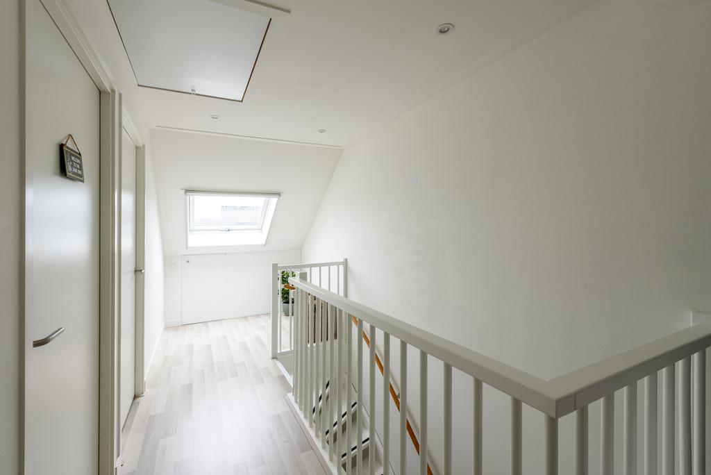 Als je de vaste, recent gerenoveerde trap (met verlichting) in de hal oploopt, kom je op de eerste verdieping. Hier bevinden zich drie slaapkamers van verschillende groottes en de badkamer. De badkamer en de grootste slaapkamer (ongeveer 14m²) liggen aan de voorkant van de woning, de andere twee slaapkamers (circa 13m² en 7m²) liggen aan de achterzijde en hebben zicht op de tuin. De hele verdieping is afgewerkt met nette, strakke wanden en een lichte laminaatvloer.