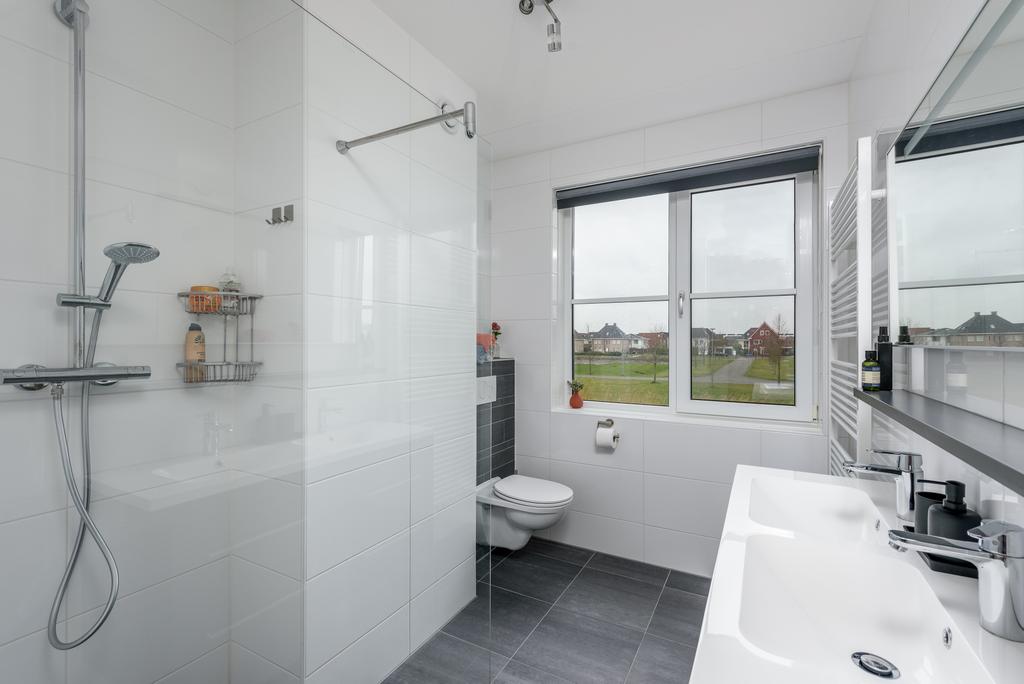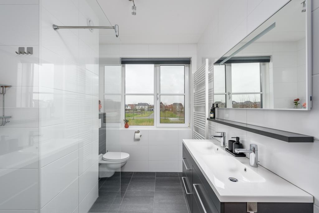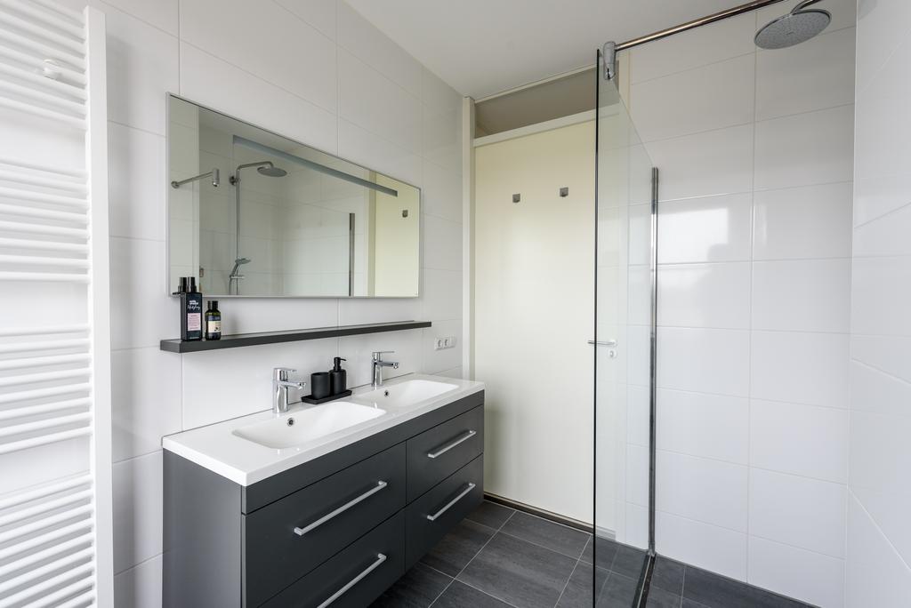 De badkamer is modern en heeft een frisse uitstraling. Je vindt hier een inloopdouche met regendouche én handdouche, dubbele wastafel met meubel, badkamerspiegel met licht & verwarming en planchet, designradiator en zwevend toilet. De hele badkamer is tot aan het plafond betegeld met grote, strakke tegels in lichte kleurstelling.