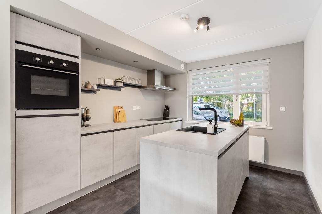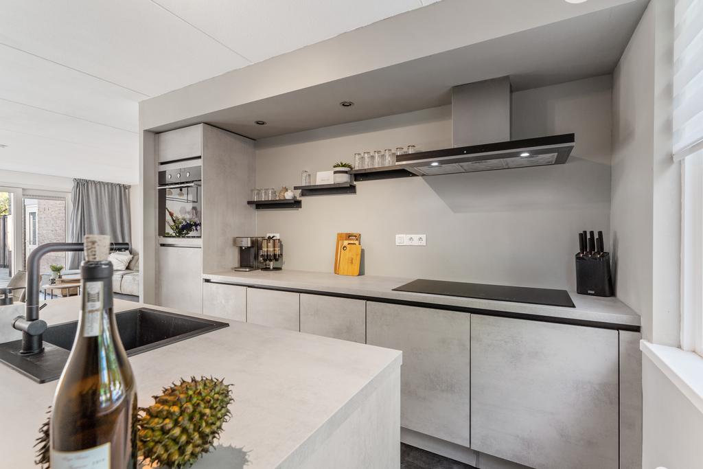 De keuken, gelegen aan de voorzijde van het huis, is een schitterend voorbeeld van modern design en optimaal gebruiksgemak. Het centrale kookeiland, met zijn eveneens strakke ontwerp en hoogwaardige afwerking, maakt van elke kookbeurt een feest en is een droom voor de kookliefhebber. De keuken is volledig uitgerust met een oven, inductiekookplaat, koelkast en een krachtige afzuigkap. De open indeling laat de keuken naadloos overgaan in de woonkamer, wat zorgt voor een gezellige en ruimtelijke sfeer. Kortom, een echte droomkeuken!