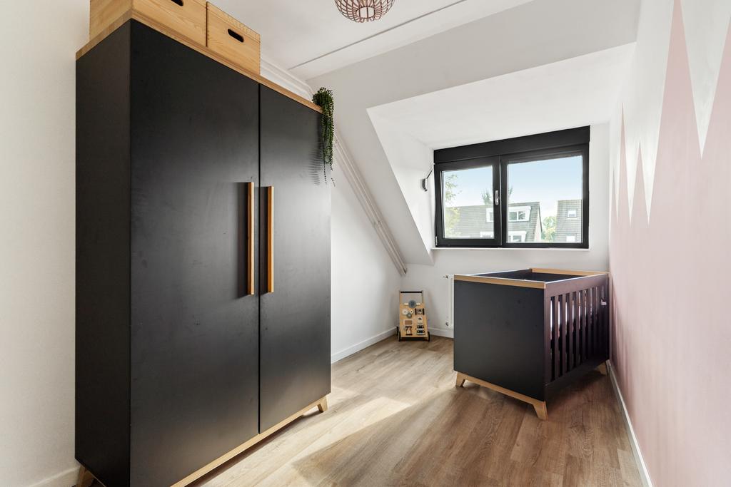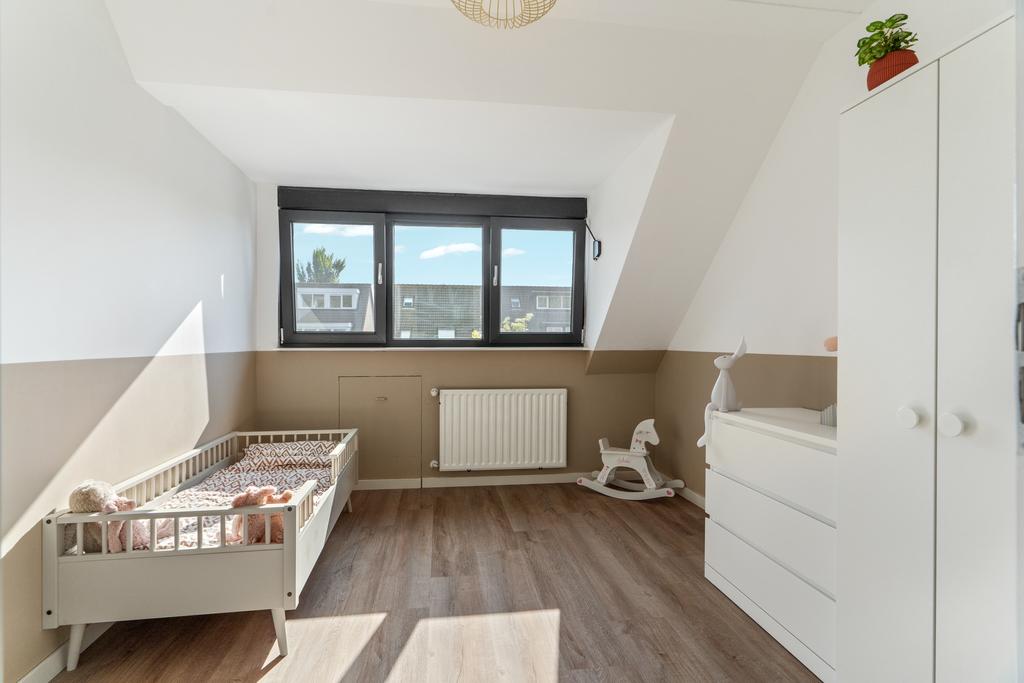 De vaste trap brengt je naar de eerste verdieping, waar je drie royale slaapkamers en de badkamer aantreft. De twee slaapkamers aan de achterzijde, beide voorzien van een stijlvolle dakkapel met rolluiken en horren, bieden volop ruimte en comfort. De eerste slaapkamer heeft een oppervlakte van circa 10 m², terwijl de tweede slaapkamer ongeveer 11m² meet. Dankzij de drie grote raampartijen geniet je hier van veel natuurlijk licht. Aan de voorzijde bevindt zich de derde slaapkamer, de ideale master bedroom, met een riante oppervlakte van zo’n 11m².