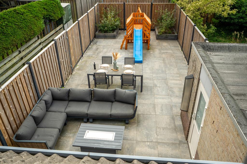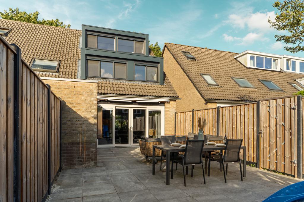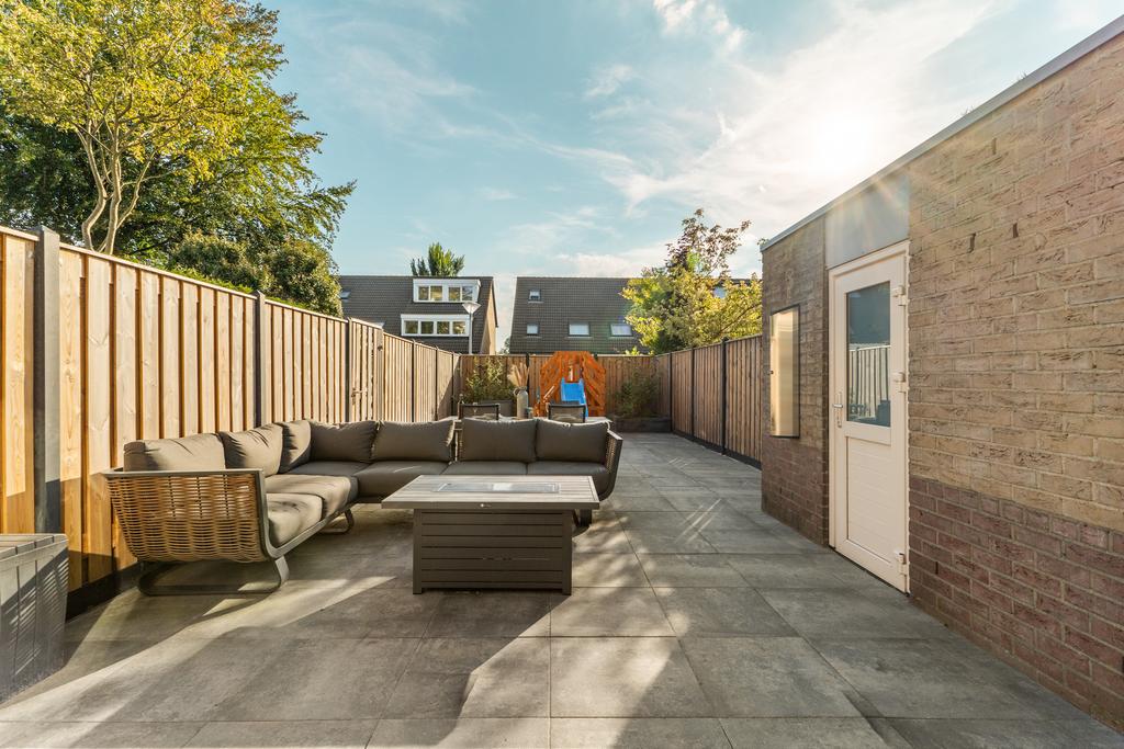 De achtertuin, gelegen op het zonnige zuidwesten, biedt volop mogelijkheden om te ontspannen en plezier te hebben. Of je nu wilt loungen op een comfortabele zithoek, gezellig dineren aan een lange tafel, je kinderen wilt zien rondrennen of gewoon wilt genieten van de frisse buitenlucht, deze tuin heeft het allemaal. Voorin de tuin vind je een praktische stenen berging met kunststof deur, ideaal voor het opbergen van tuinspullen en fietsen. Daarnaast is de tuin voorzien van een zonnescherm voor extra comfort op zonnige dagen en een achterom voor gemakkelijke toegang. Maak van deze zuidwestelijk gelegen tuin jouw eigen buitenparadijs!