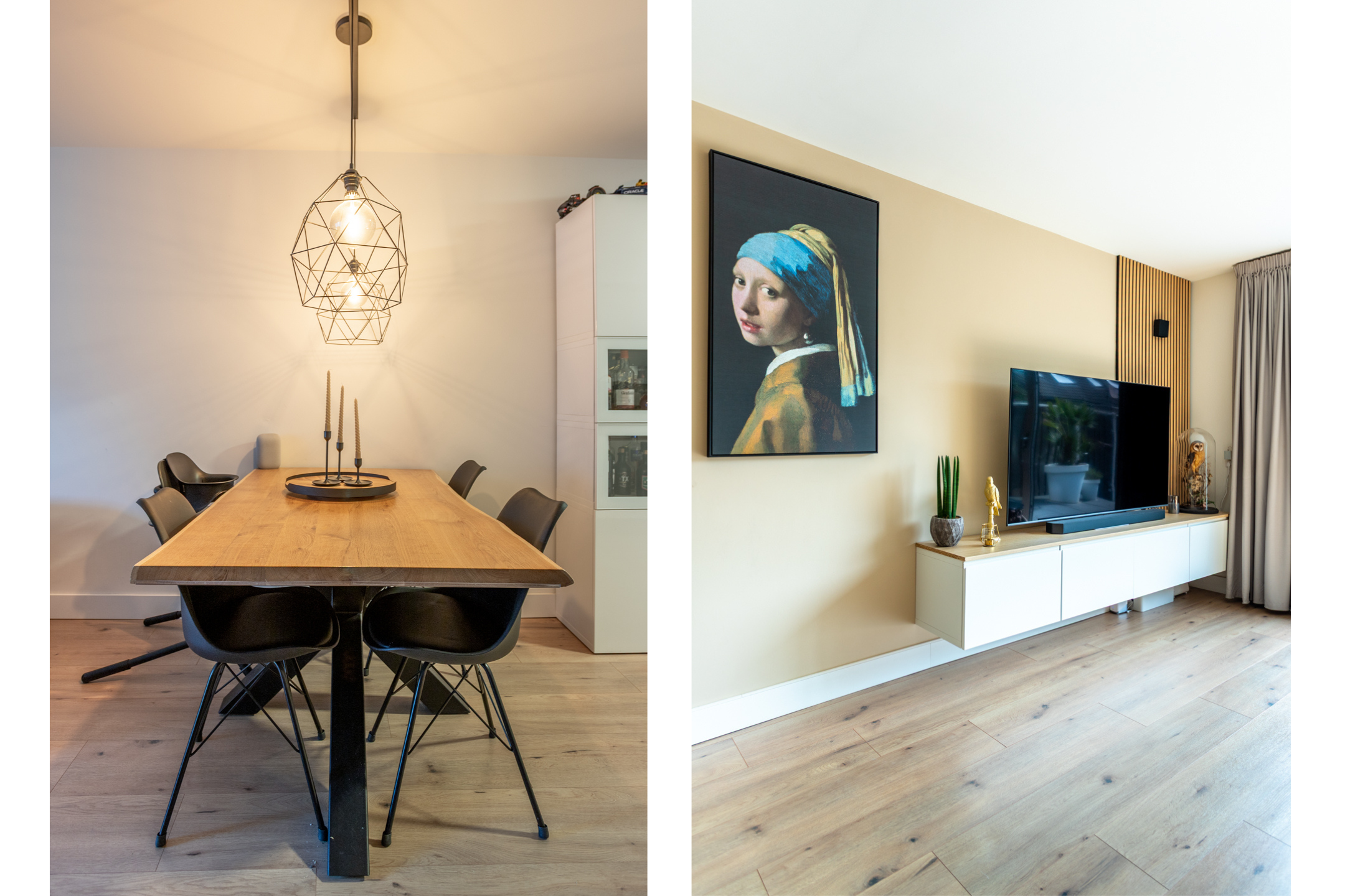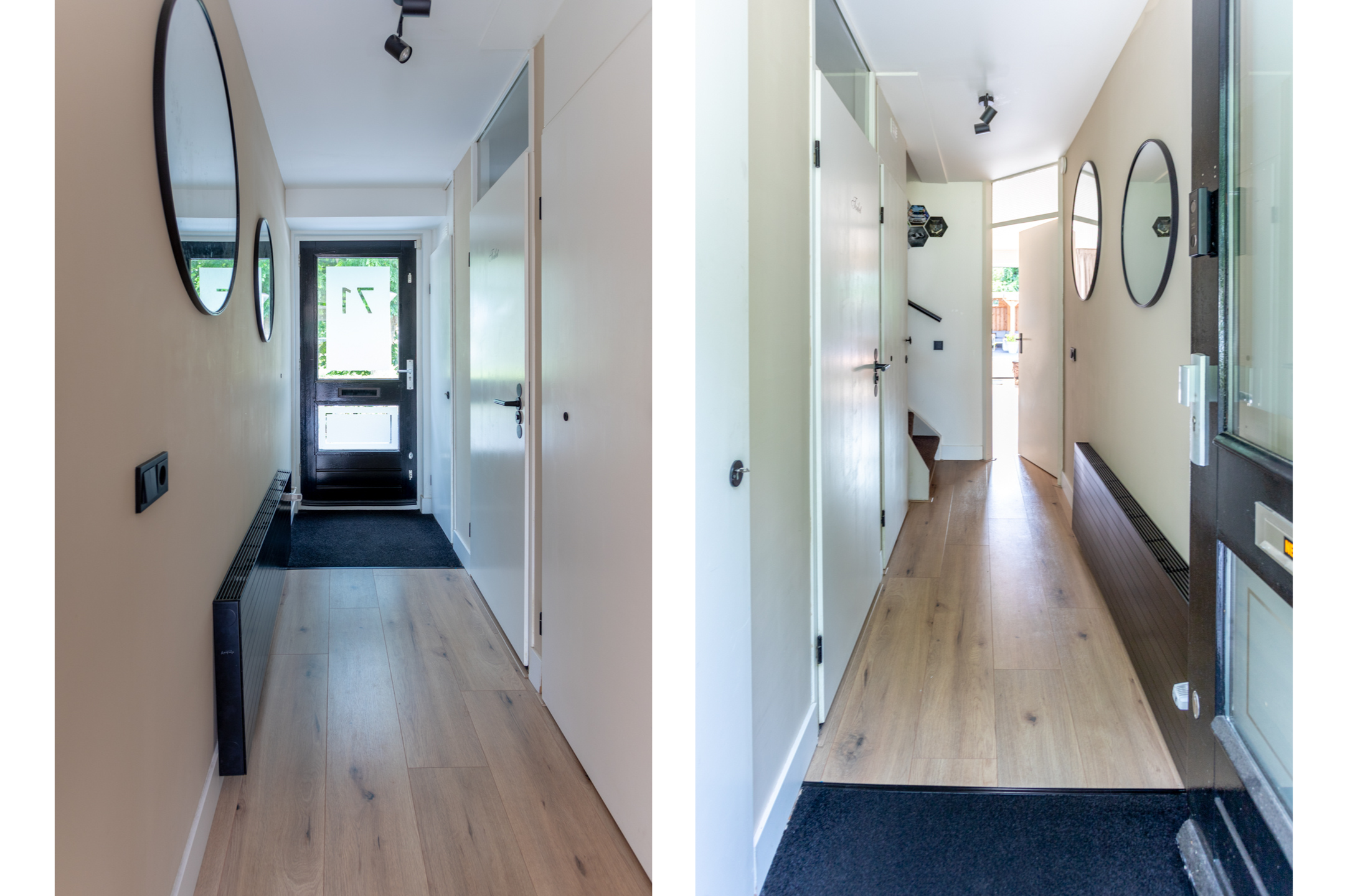 De wanden en het plafond van de begane grond zijn eind 2020 voorzien van glad stucwerk, en er ligt een stijlvolle laminaatvloer (gelijk aan die op de eerste verdieping).