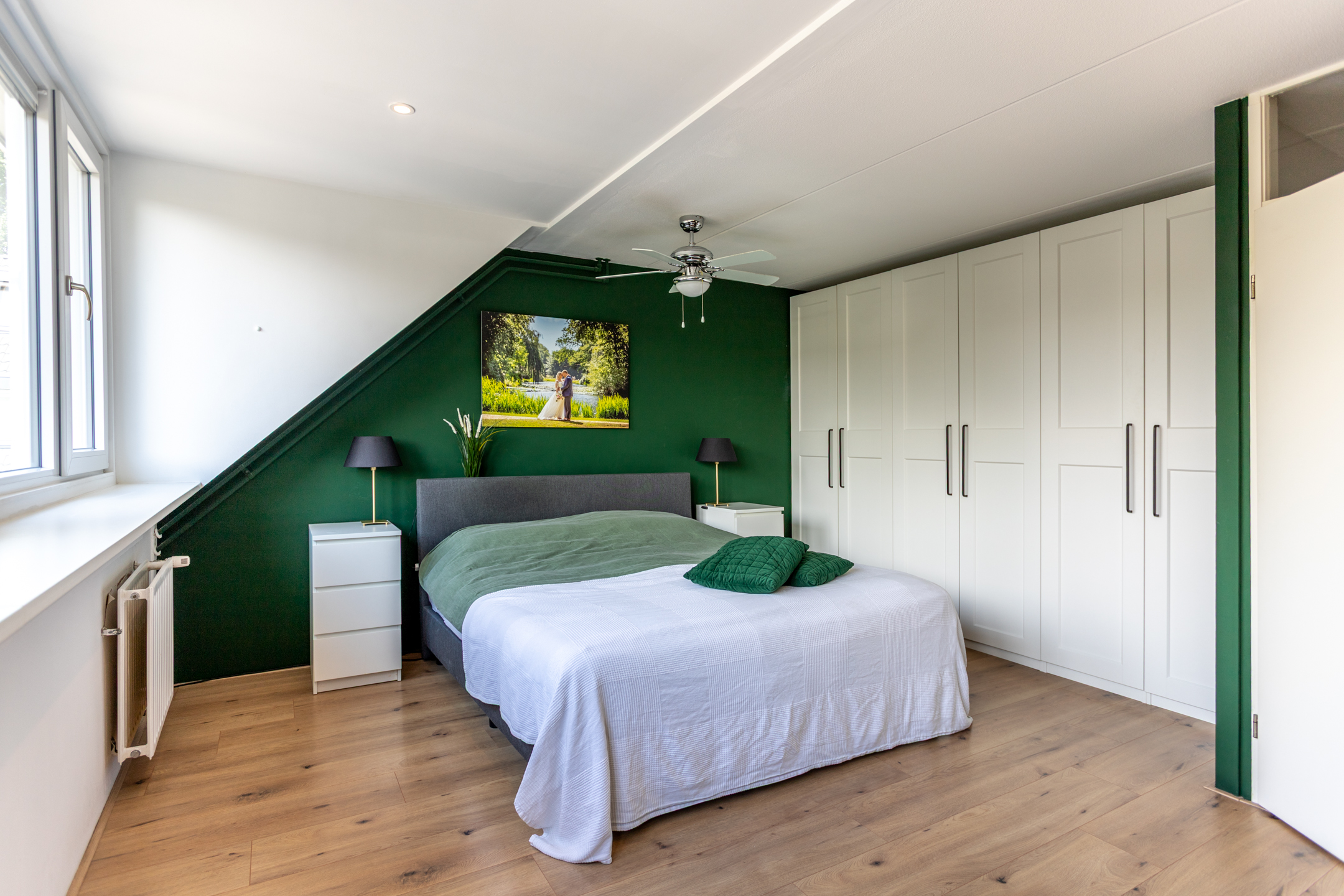 Beide slaapkamers zijn voorzien van strak geverfd renovliesbehang en een nette, doorlopende vloer, wat zorgt voor een rustige en verzorgde uitstraling. Onder de schuine kanten bevinden zich praktische knieschotten met veel opbergruimte. Op de overloop is daarnaast een handige opbergkast aanwezig.