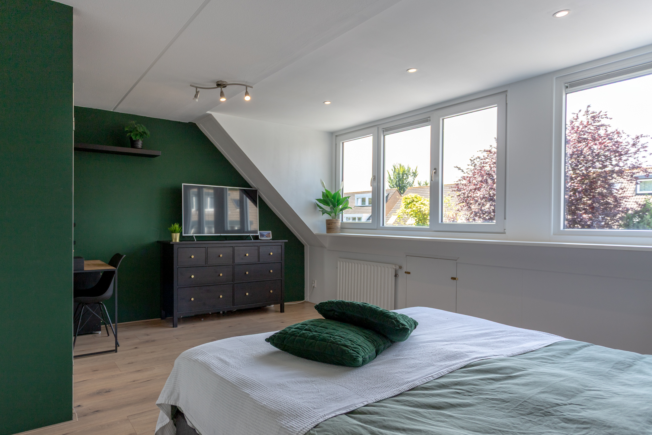 Aan de achterzijde bevindt zich de comfortabele master bedroom van ca. 20 m². Dankzij de dakkapel over de volledige breedte is de kamer extra ruim en licht, met voldoende plek voor een groot bed én een grote kledingkast. Deze ruimte kan desgewenst worden opgedeeld in twee kamers. De dakkapel is voorzien van twee geïntegreerde rolluiken. Aan de voorzijde ligt een tweede slaapkamer van ca. 11 m², ideaal als extra slaapkamer, logeerkamer, werkplek of hobbyruimte. Deze kamer is voorzien van een rolluik op zonne-energie.