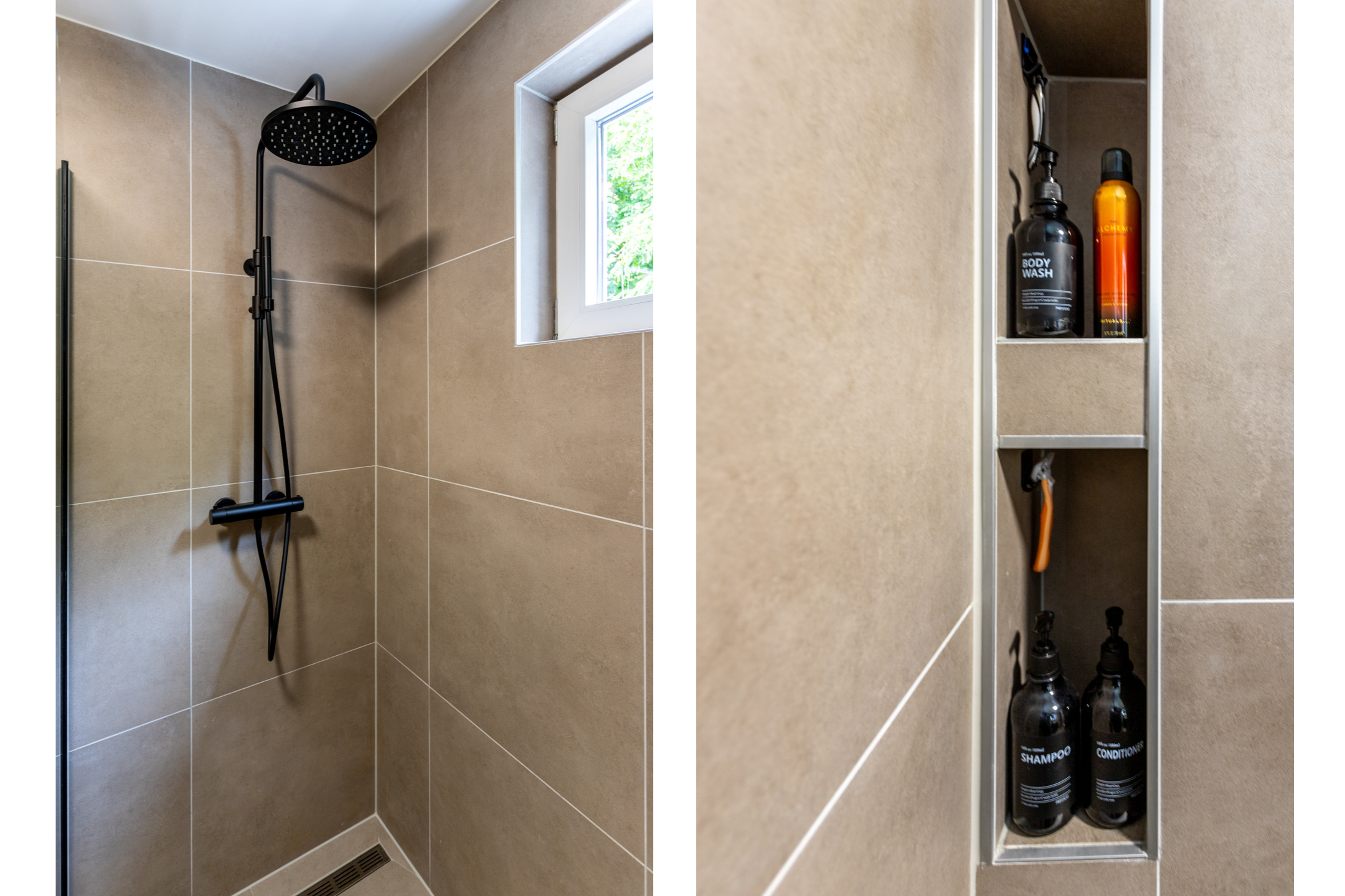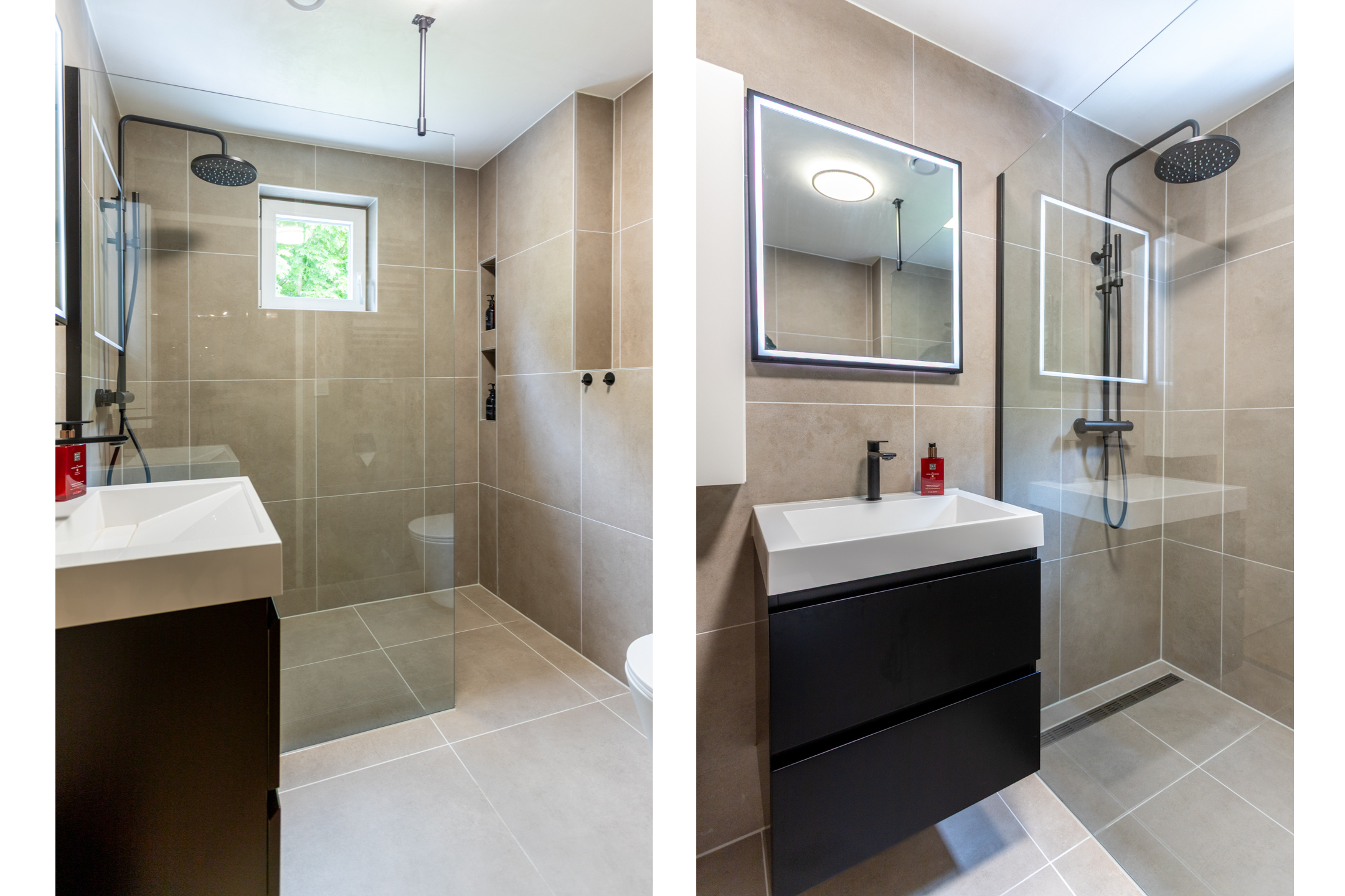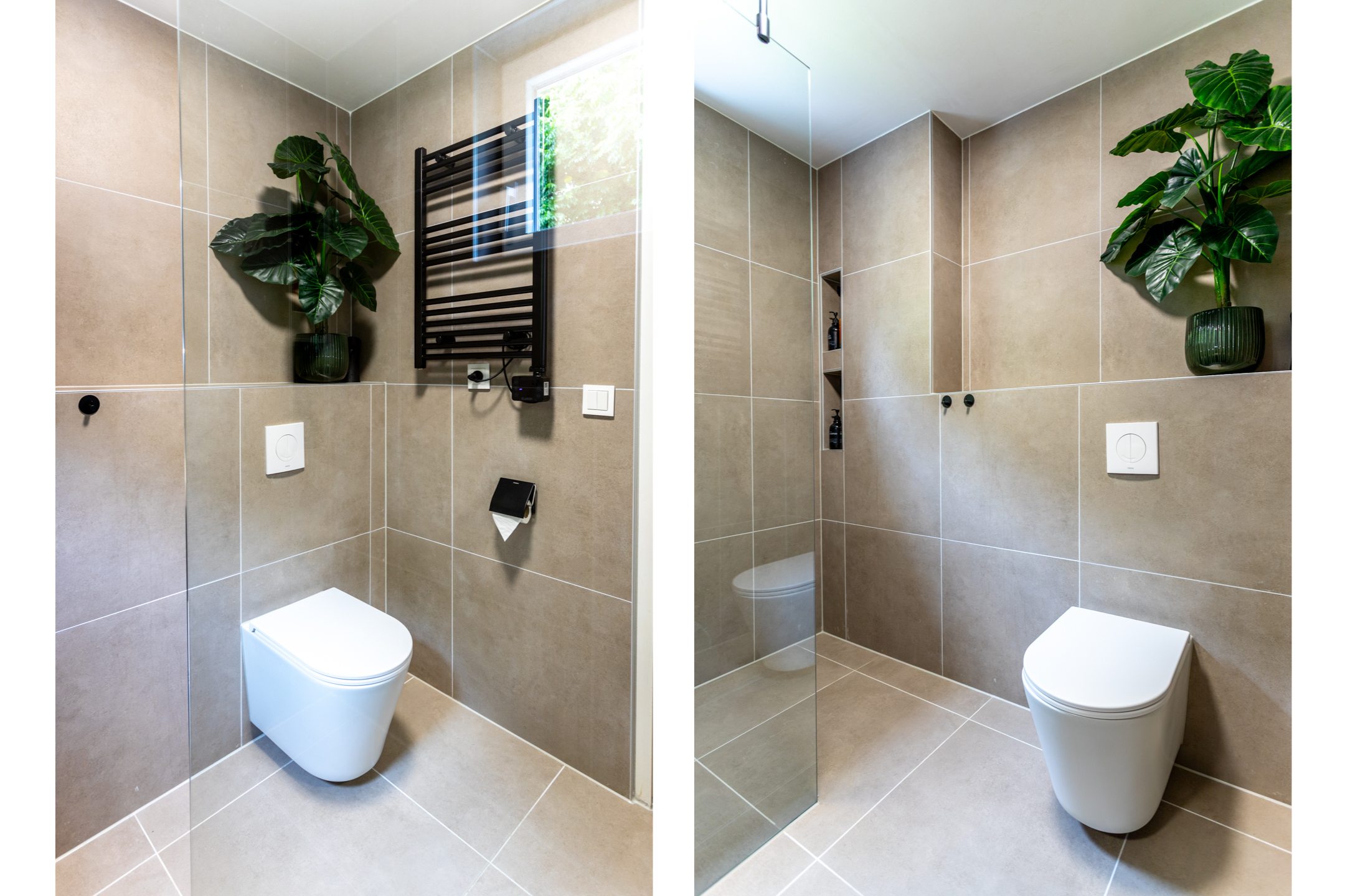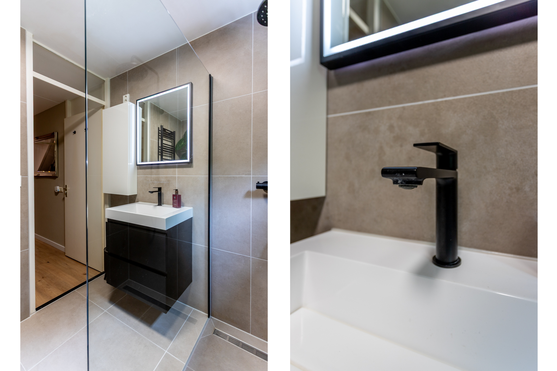 De badkamer op de eerste verdieping ca. 4 m² is in 2024 volledig vernieuwd, inclusief leidingwerk en afvoer. Deze modern en stijlvol afgewerkte ruimte beschikt over grote tegels in een warme, natuurlijke kleur, wat bijdraagt aan een rustige en luxe uitstraling. De praktische indeling omvat een inloopdouche met glazen wand, een toilet en een wastafel met extra opbergruimte. Zwarte kranen en een designradiator geven de badkamer een eigentijdse, luxe look. Boven de wasbak is een fraaie spiegel met geïntegreerde verlichting geplaatst. De badkamer biedt zo een verzorgde en comfortabele omgeving waar je elke dag prettig start en eindigt.
