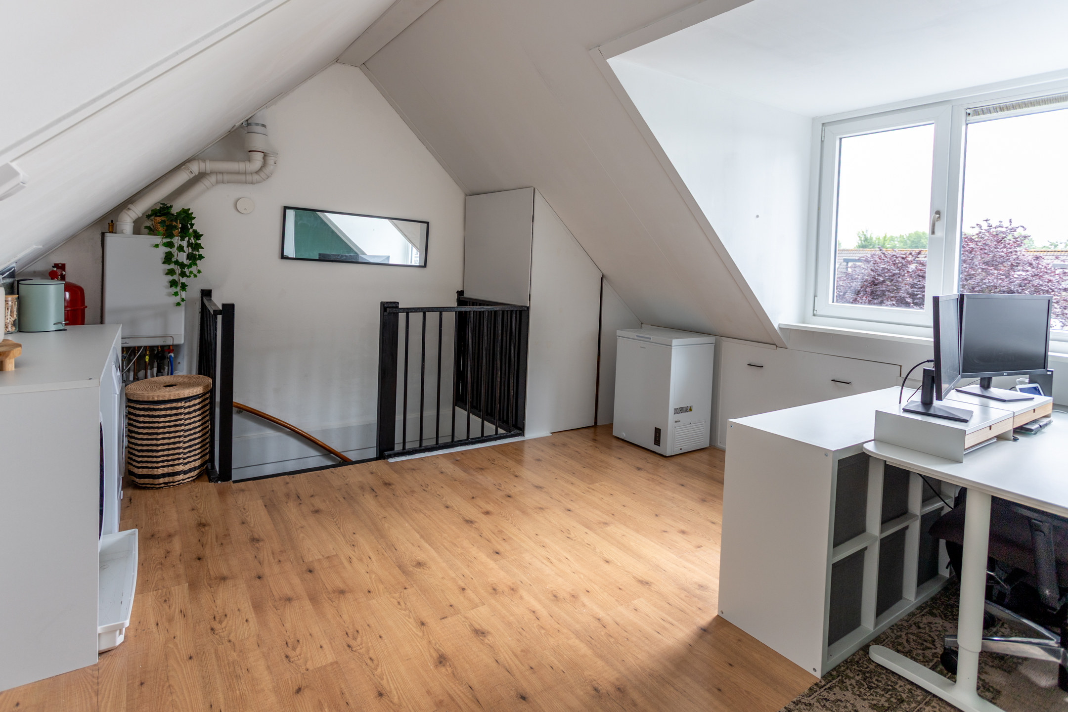 Met de vaste trap bereik je de tweede verdieping, die uitkomt op een open en nette zolderruimte van ca. 17 m². Momenteel in gebruik als werkkamer en wasruimte, maar eenvoudig om te bouwen tot een extra slaapkamer, hobbyruimte of kantoor.