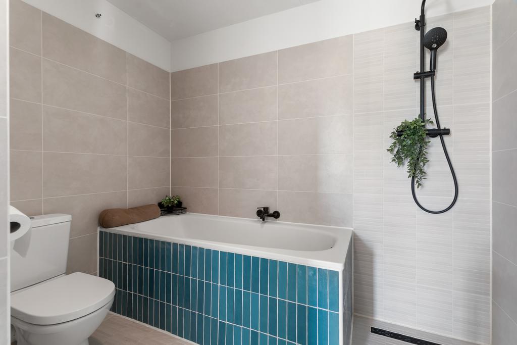 In deze stijlvolle badkamer van circa 6m² springt de moderne, rechthoekige badkuip direct in het oog. De blauwgroene tegels aan de buitenzijde geven het bad een unieke uitstraling en een verfrissend kleuraccent. De zwart afgewerkte douchekraan en handdouche voegen een chique, minimalistische touch toe. Met een mooi meubel, wastafel en toilet is deze badkamer zowel functioneel als perfect voor wie houdt van een modern interieur met een speelse twist. Naast de badkamer vind je een praktische opbergkast met aansluiting voor de wasmachine.