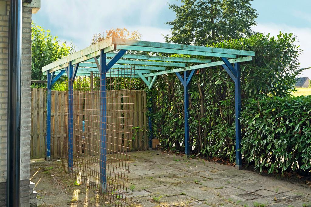 Aan de voorzijde van de woning bevindt zich de riante voortuin met zicht op de vaart voorzien van o.a. een haag, hekwerk en een pergola. Hier zou ook goed een ruime carport gerealiseerd kunnen worden met ruimte voor maar liefst twee parkeerplaatsen. Hou je van sleutelen aan auto’s? Dan is het terug te brengen van de oorspronkelijke garage voor jou misschien wel een perfecte optie.