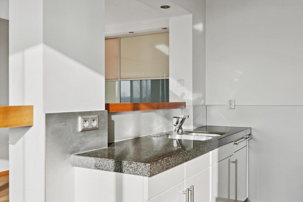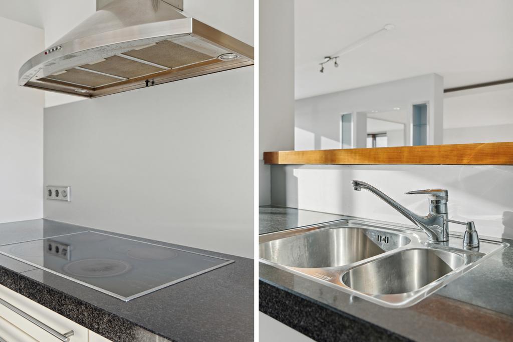 De lichte keuken voorzien van een granieten blad is uitgerust met diverse inbouwapparatuur, waaronder een keramische kookplaat met afzuigkap, een koelkast, vaatwasser en een combi-magnetron.