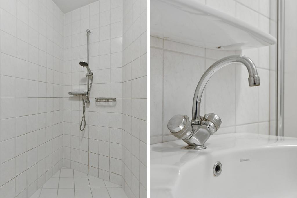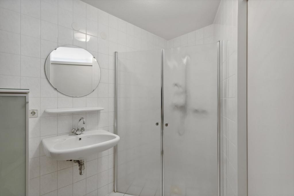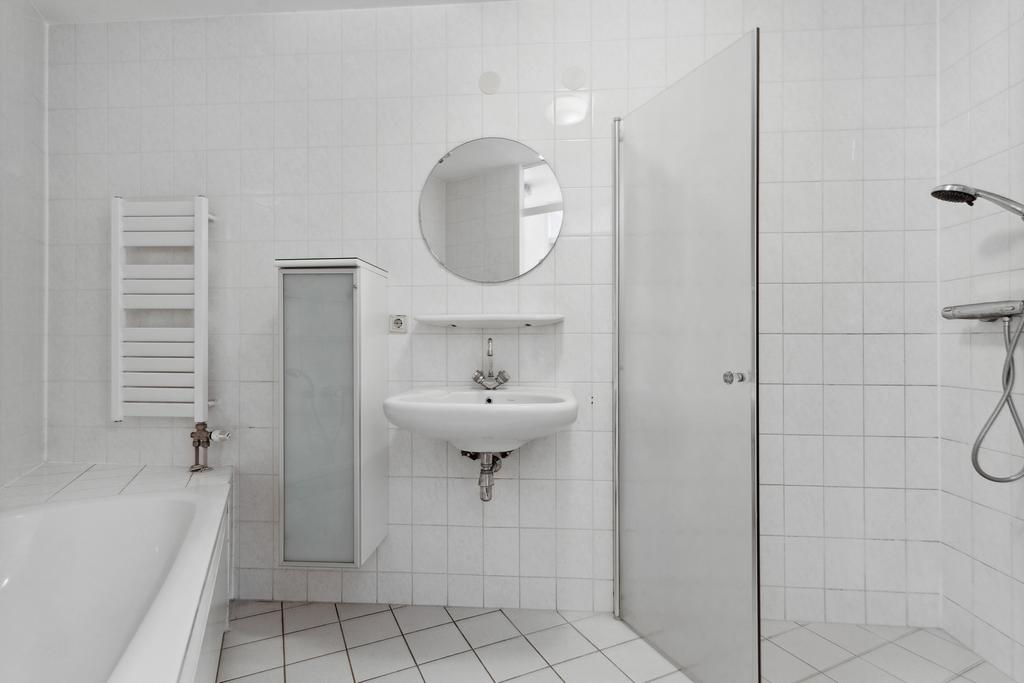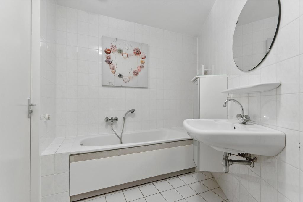 De badkamer van dit appartement is volledig betegeld en voorzien van een ligbad, een wastafel en een inloopdouche.