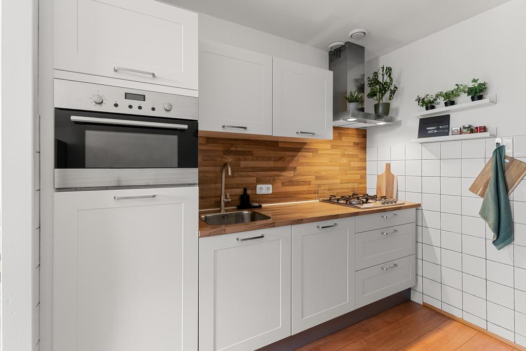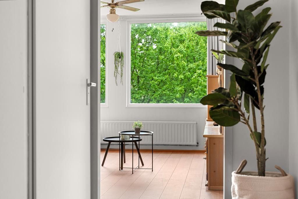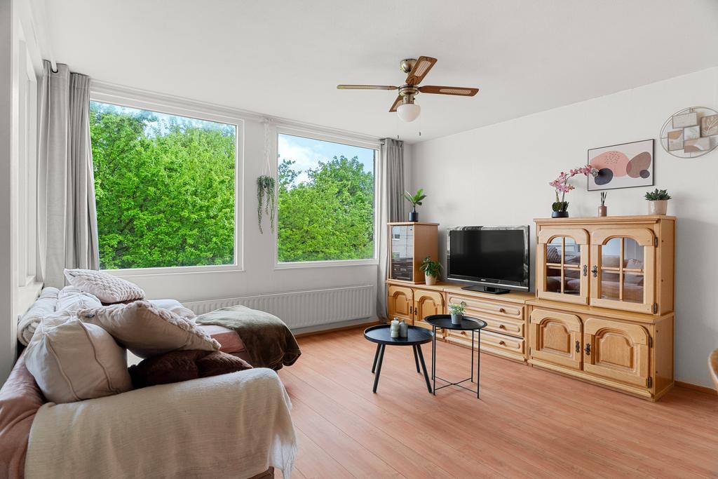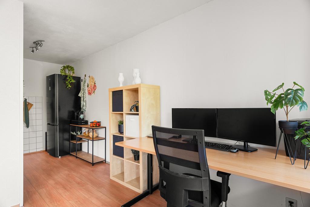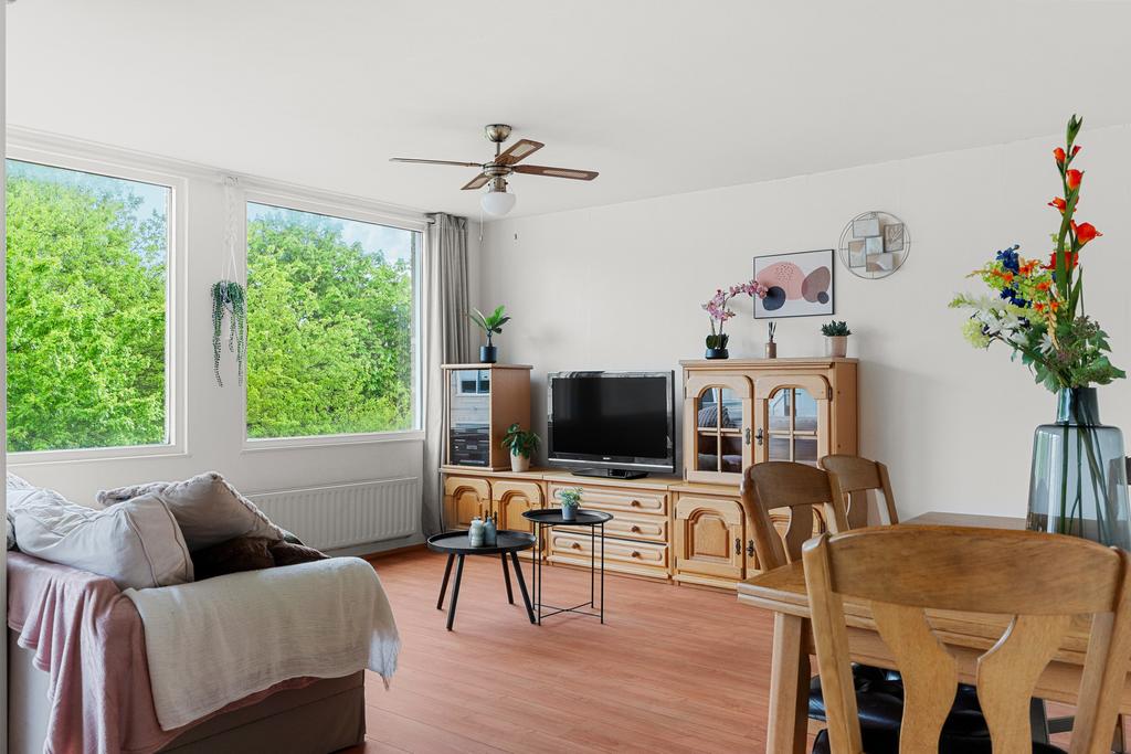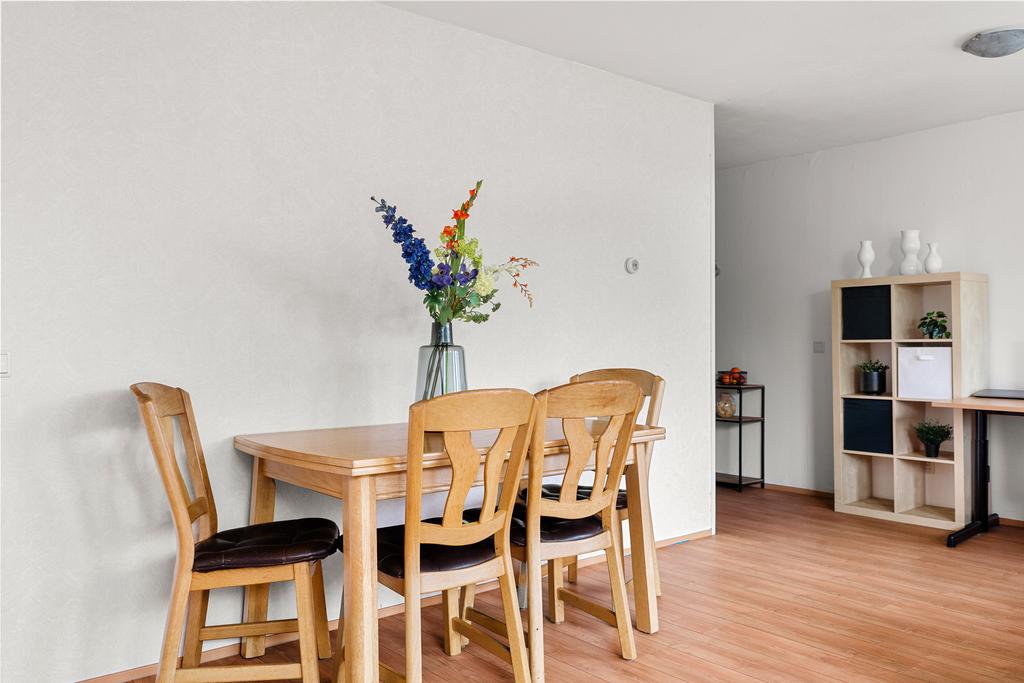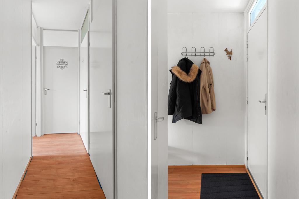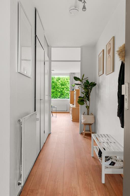 Stap binnen in het appartement via de ruime hal, waar je direct toegang hebt tot de berging, meterkast en het toilet. Vanuit deze centrale ruimte zijn alle vertrekken gemakkelijk bereikbaar. De gang biedt voldoende ruimte voor een kapstok en eventueel een stijlvol schoenenrek of een handig opbergmeubel. Loop rechtdoor en je komt uit in de woonkamer.