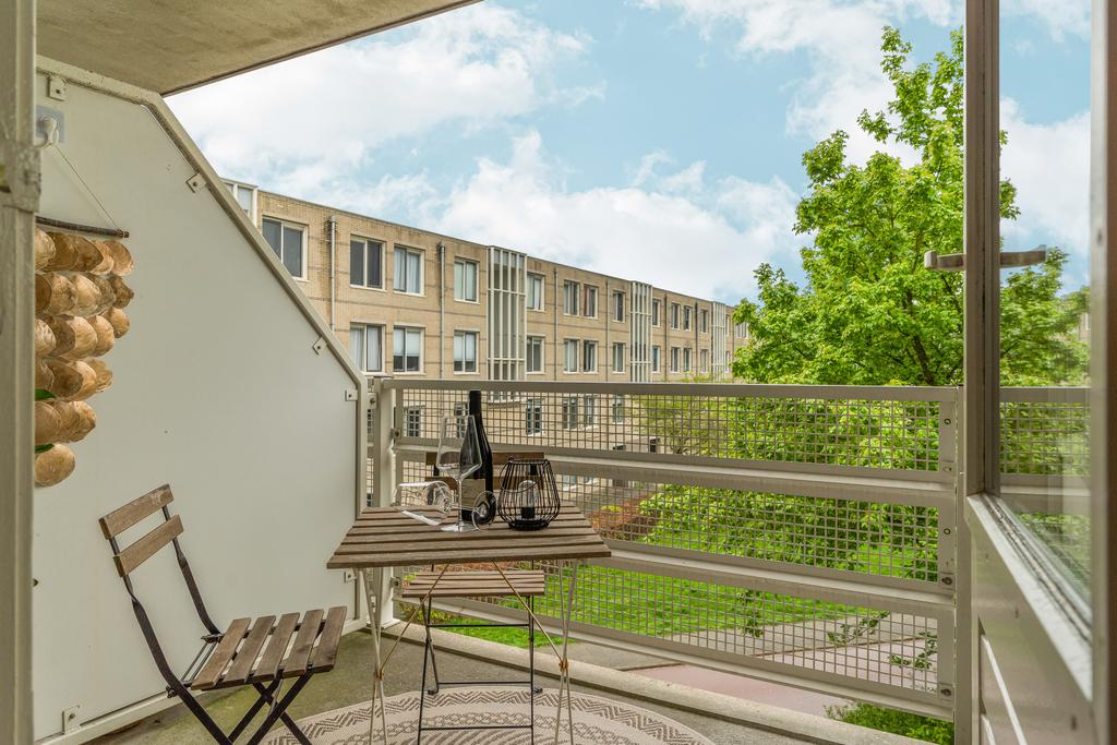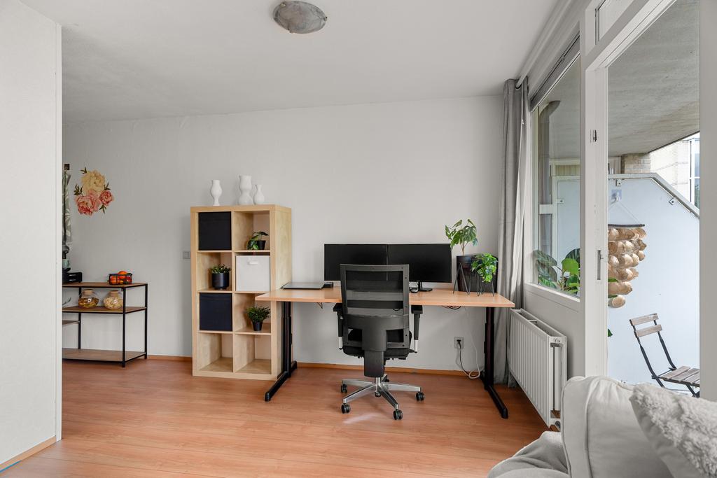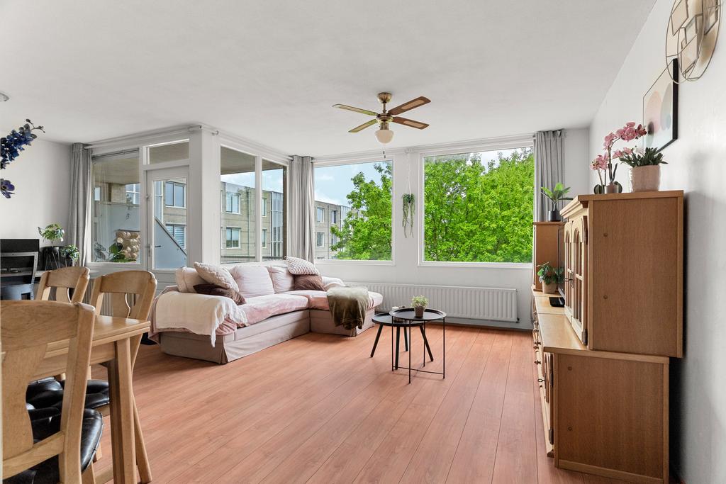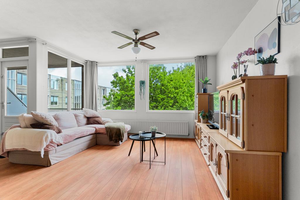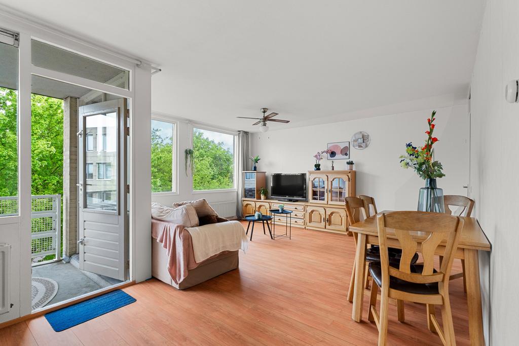 De woonkamer is met circa 26 m² licht en praktisch ingedeeld. Er is voldoende plek voor een comfortabele zithoek en daarnaast ruimte voor een eettafel waar je met gemak met meerdere personen aan kunt zitten. De half open keuken sluit direct aan op de woonkamer, wat zorgt voor een ruimtelijk gevoel en een fijne verbinding tussen koken en wonen. Vanuit de woonkamer heb je toegang tot het balkon op het zuid westen. Een prettige plek om even buiten te zitten.