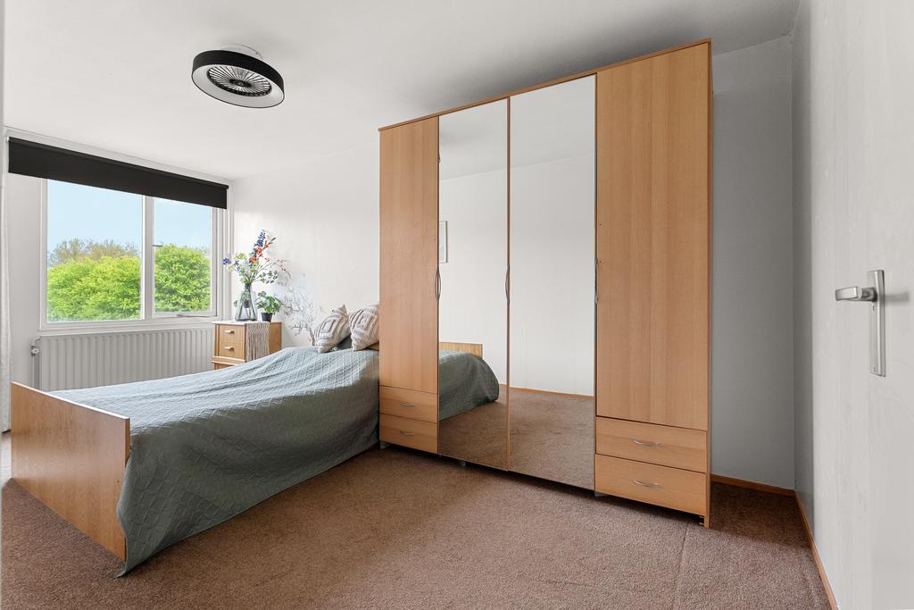 De tweede slaapkamer is verrassend ruim ca. 9 m² en ideaal te gebruiken als kinderkamer, logeerkamer of een rustig thuiskantoor. Dankzij de rechthoekige indeling is de kamer praktisch in te richten, zelfs met een bed of bureau blijft er voldoende ruimte over.