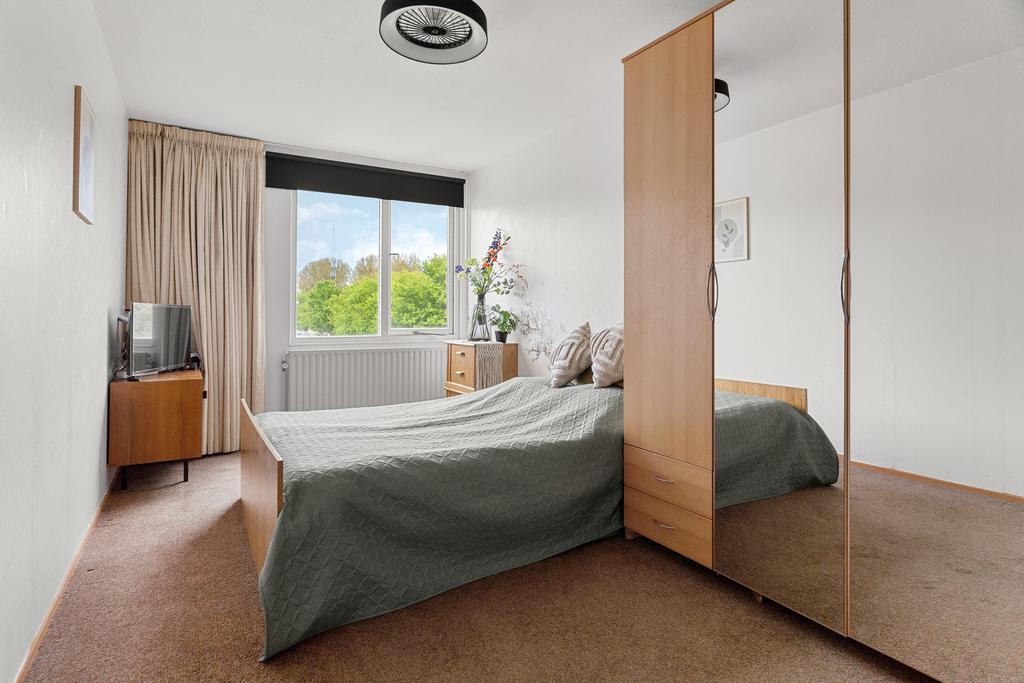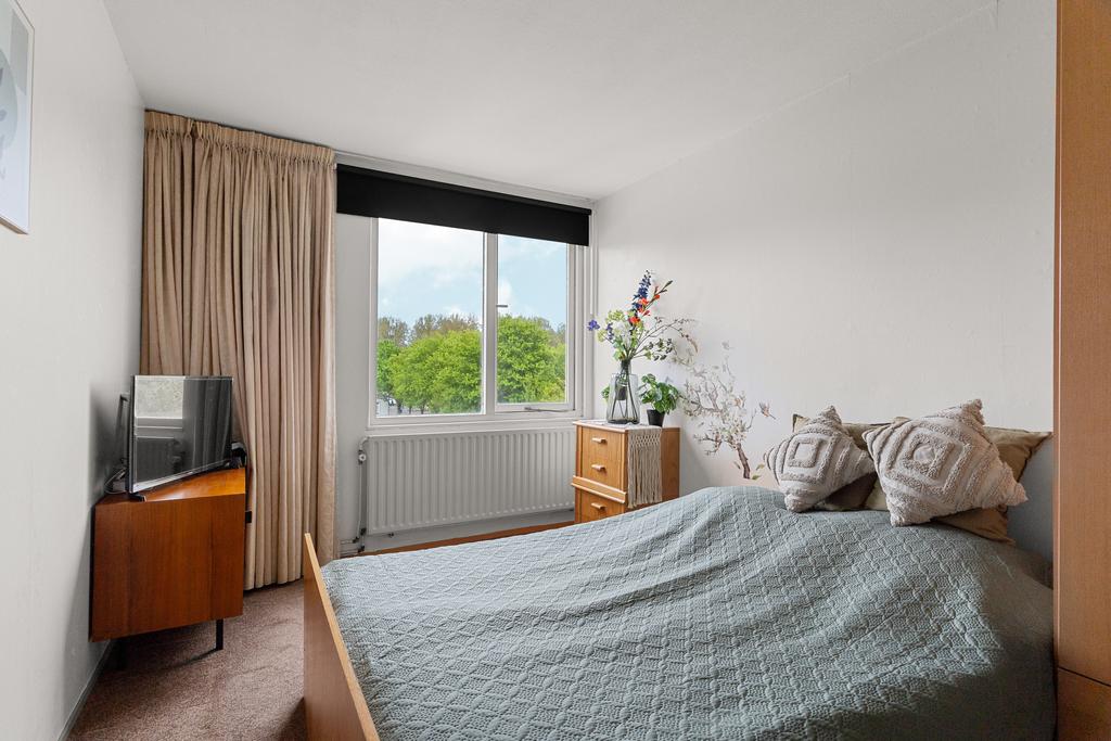 De hoofdslaapkamer is met circa 14 m² royaal van formaat en biedt moeiteloos plaats aan een tweepersoonsbed, een grote kledingkast en eventueel een klein zitje of extra opbergmeubel. Een fijne, lichte kamer die je geheel naar eigen smaak kunt inrichten.
