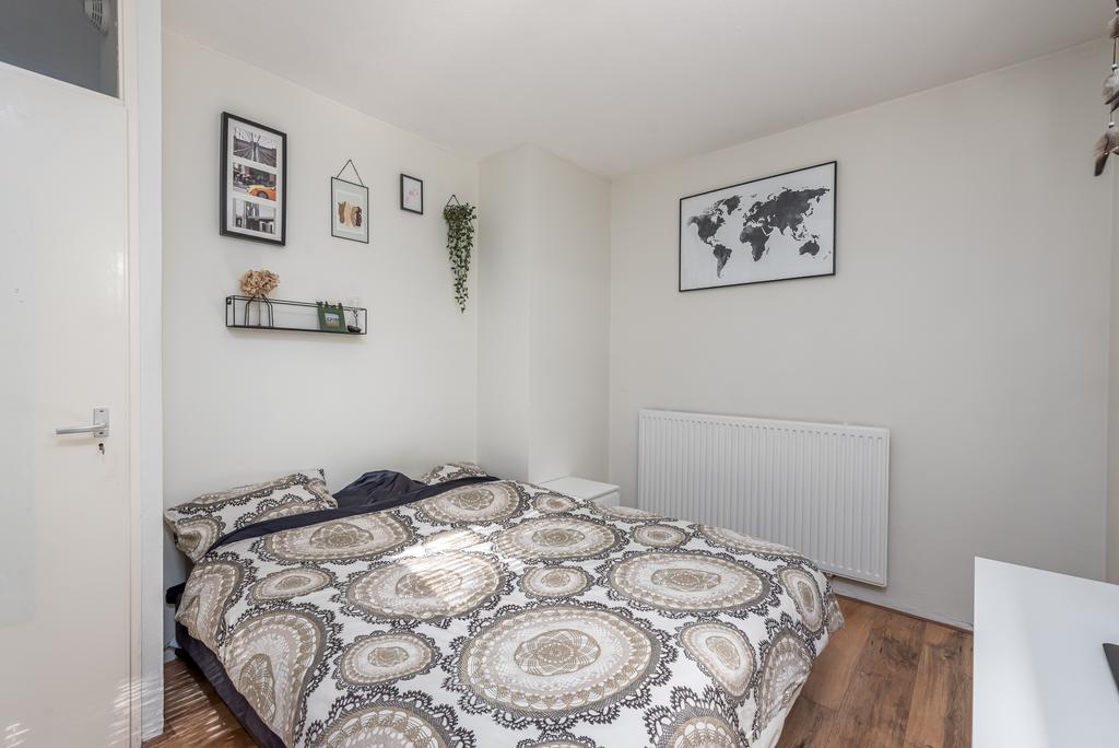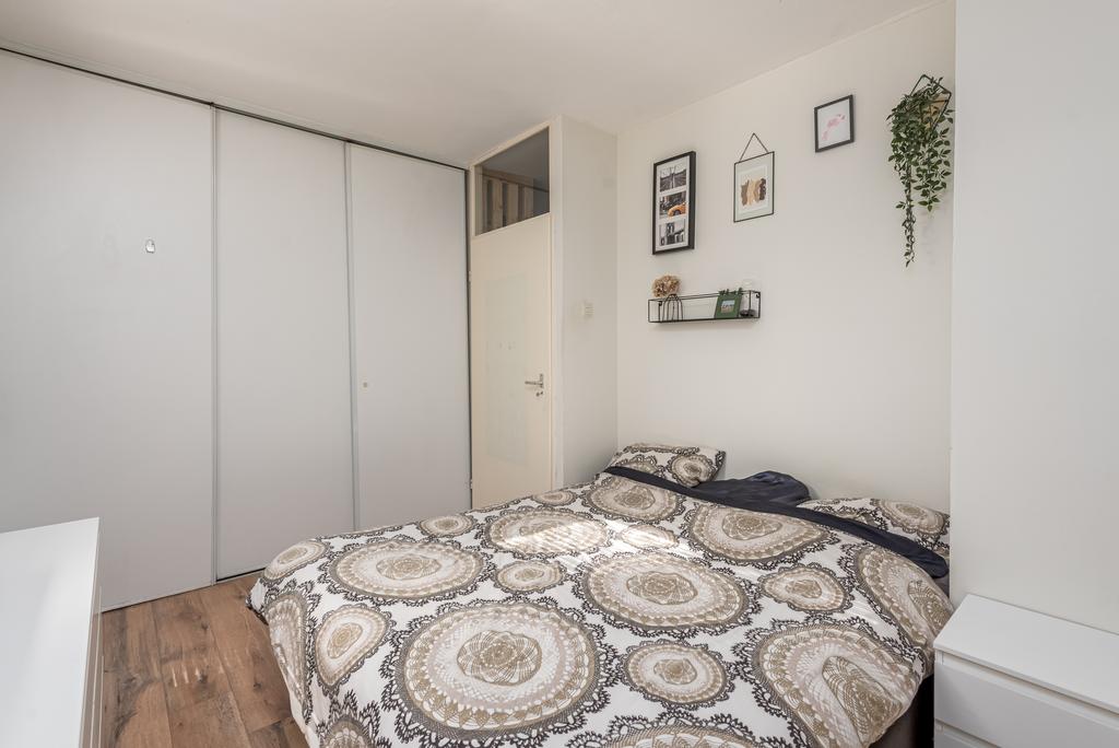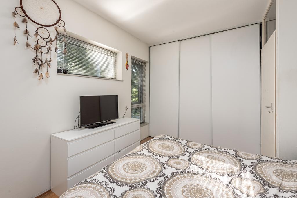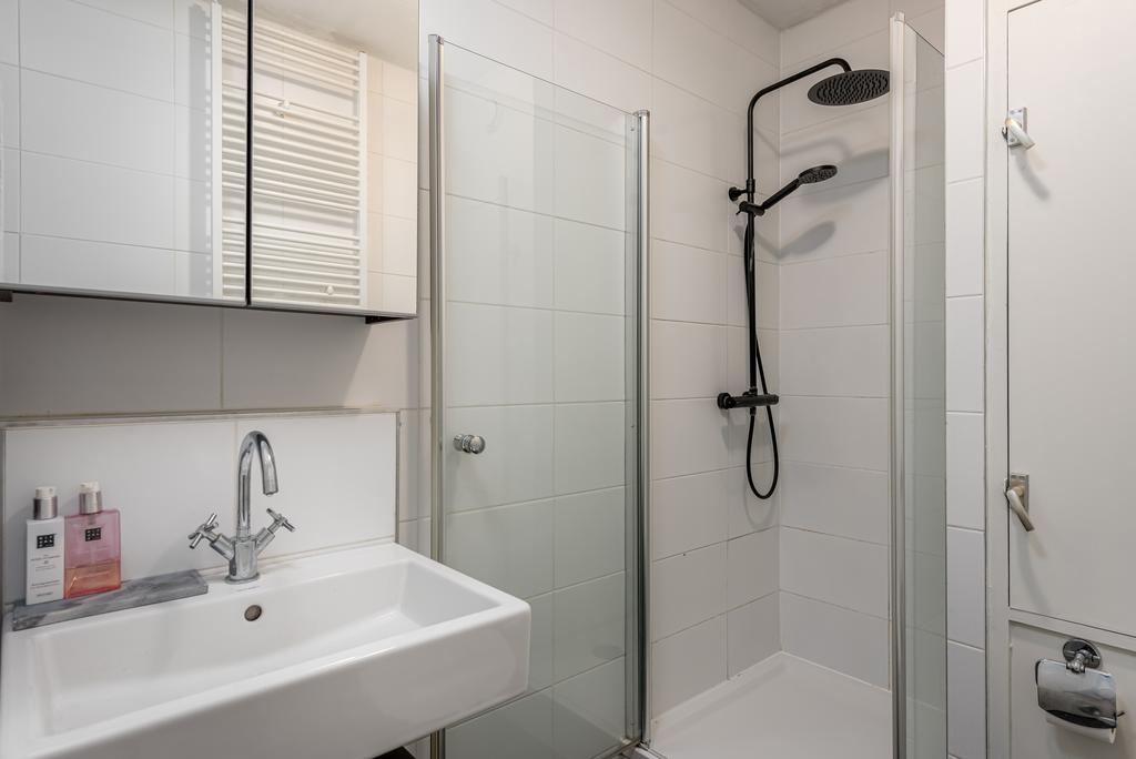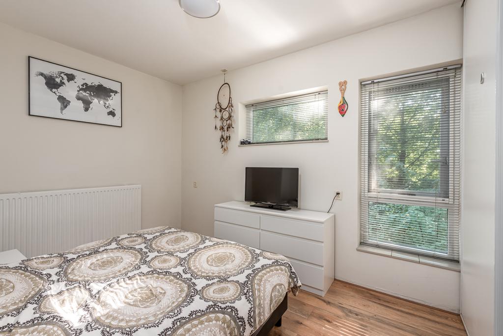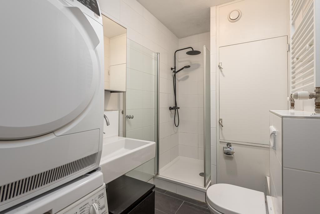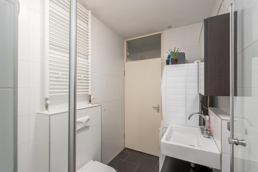 De ruime slaapkamer van circa 9 m² ligt aan de voorzijde van het appartement en is voorzien van een ruime inbouwkast. De badkamer bevindt zich naast de slaapkamer en is voorzien van een douchecabine, toilet, wastafel met meubel en aansluiting voor de wasmachine. De vernieuwde C.V.-combiketel (2021) is weggewerkt in een vaste kast.