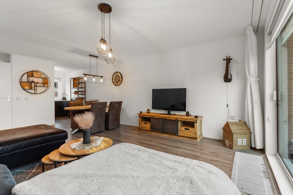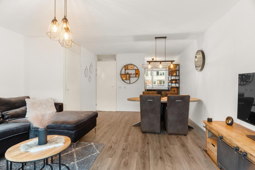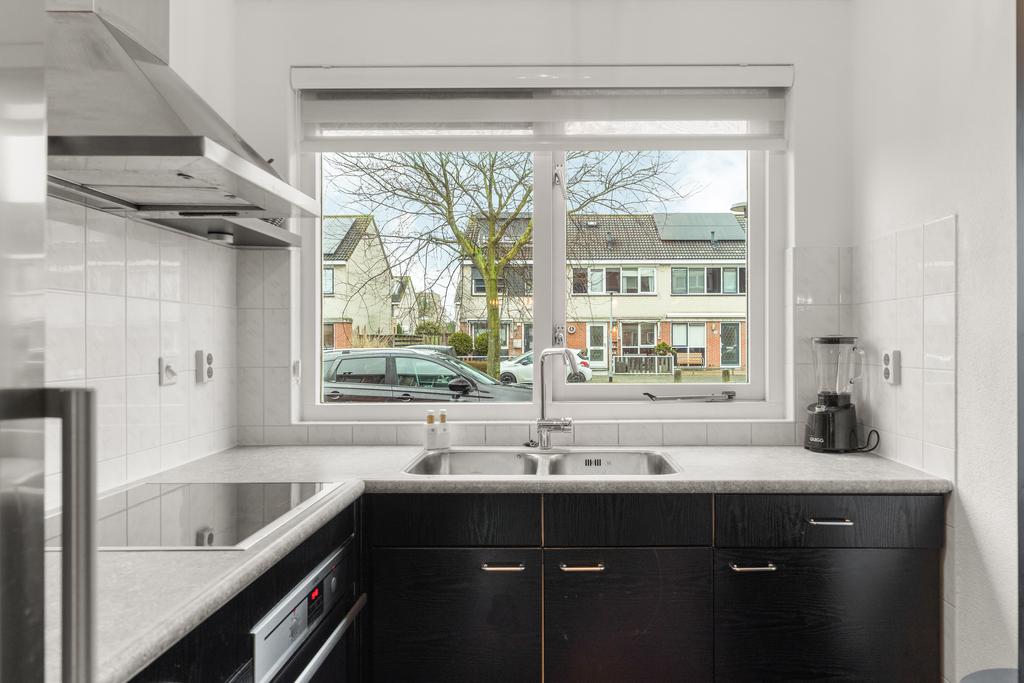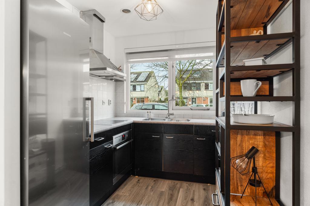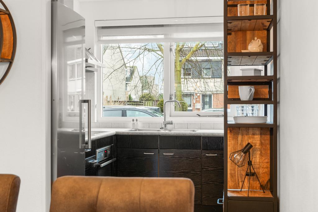 De half open keuken aan de voorzijde is geplaatst in een L-opstelling en is voorzien een inductie kookplaat, afzuigkap en inbouwoven. Leuk detail is het raam aan de voorzijde, waar de ochtendzon heerlijk doorheen schijnt
