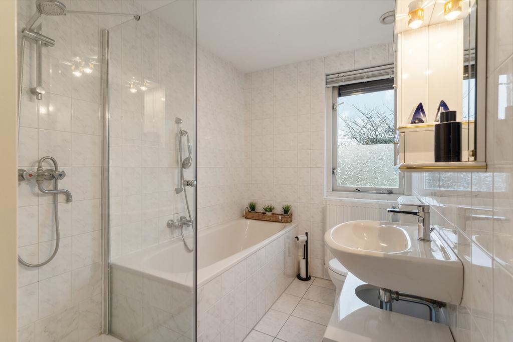 De badkamer is functioneel ingericht, met een douchecabine, ligbad, een wastafel met meubel en een toilet. In de badkamer is ook een groot raam aanwezig voor natuurlijk daglicht.