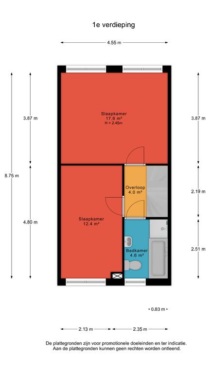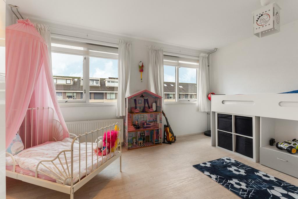 Op de eerste verdieping bevinden zich twee slaapkamers en de badkamer. De slaapkamers zijn allebei erg ruim van formaat, aangenaam licht en verzorgd afgewerkt met een laminaatvloer. De grootste slaapkamer beslaat ongeveer 18m². De tweede slaapkamer is ook ruim bemeten, met zo'n 12m² aan ruimte.