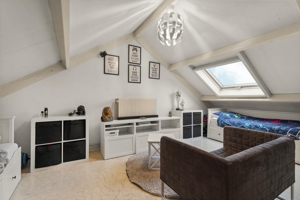 Via de tweede trap bereik je de ruime zolder, waar je de aansluiting voor de wasmachine en droger vindt. Op deze woonetage is voldoende ruimte voor een ruime derde slaapkamer. De zolderverdieping kan naar eigen wens vrij worden ingedeeld.