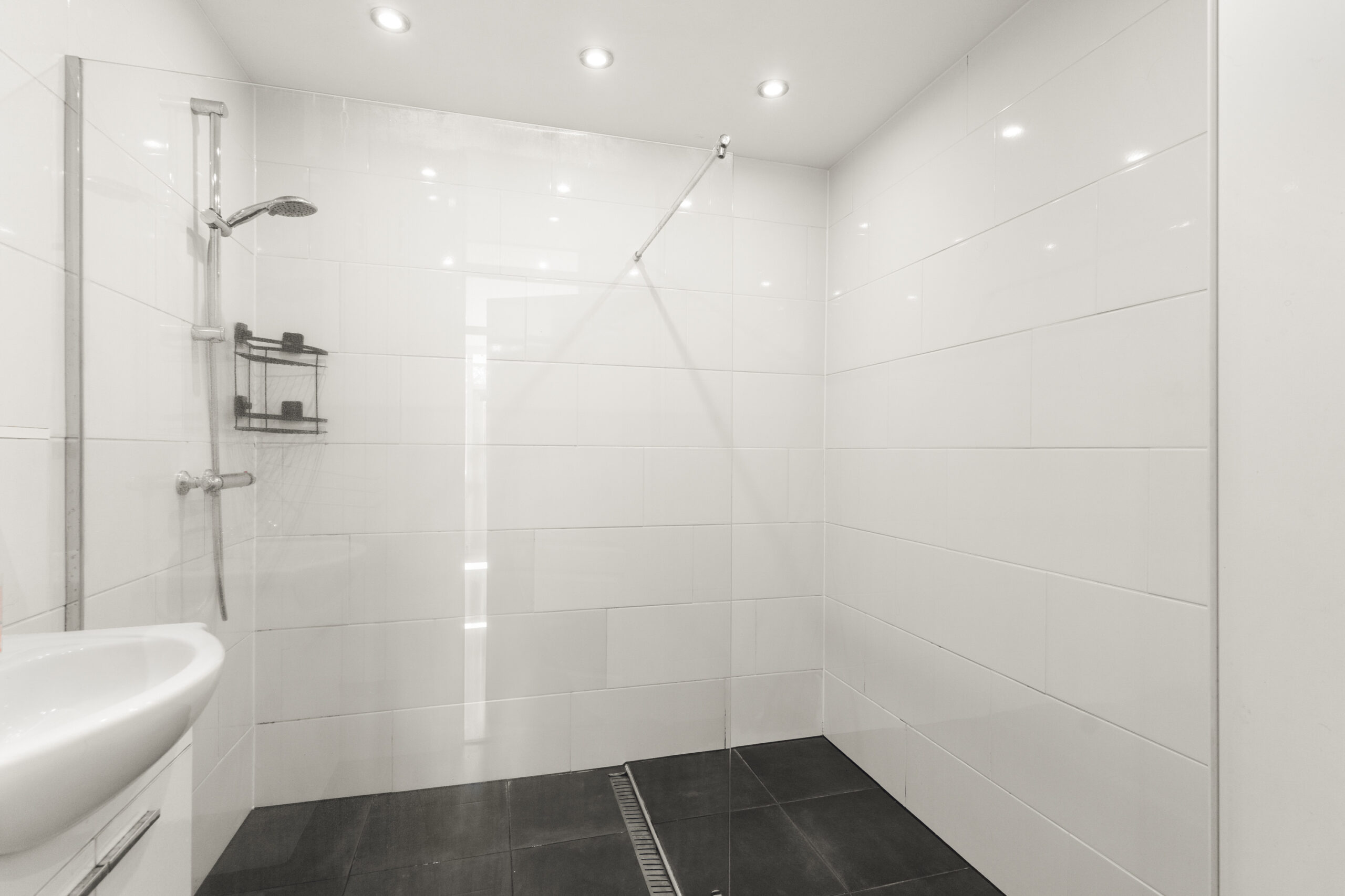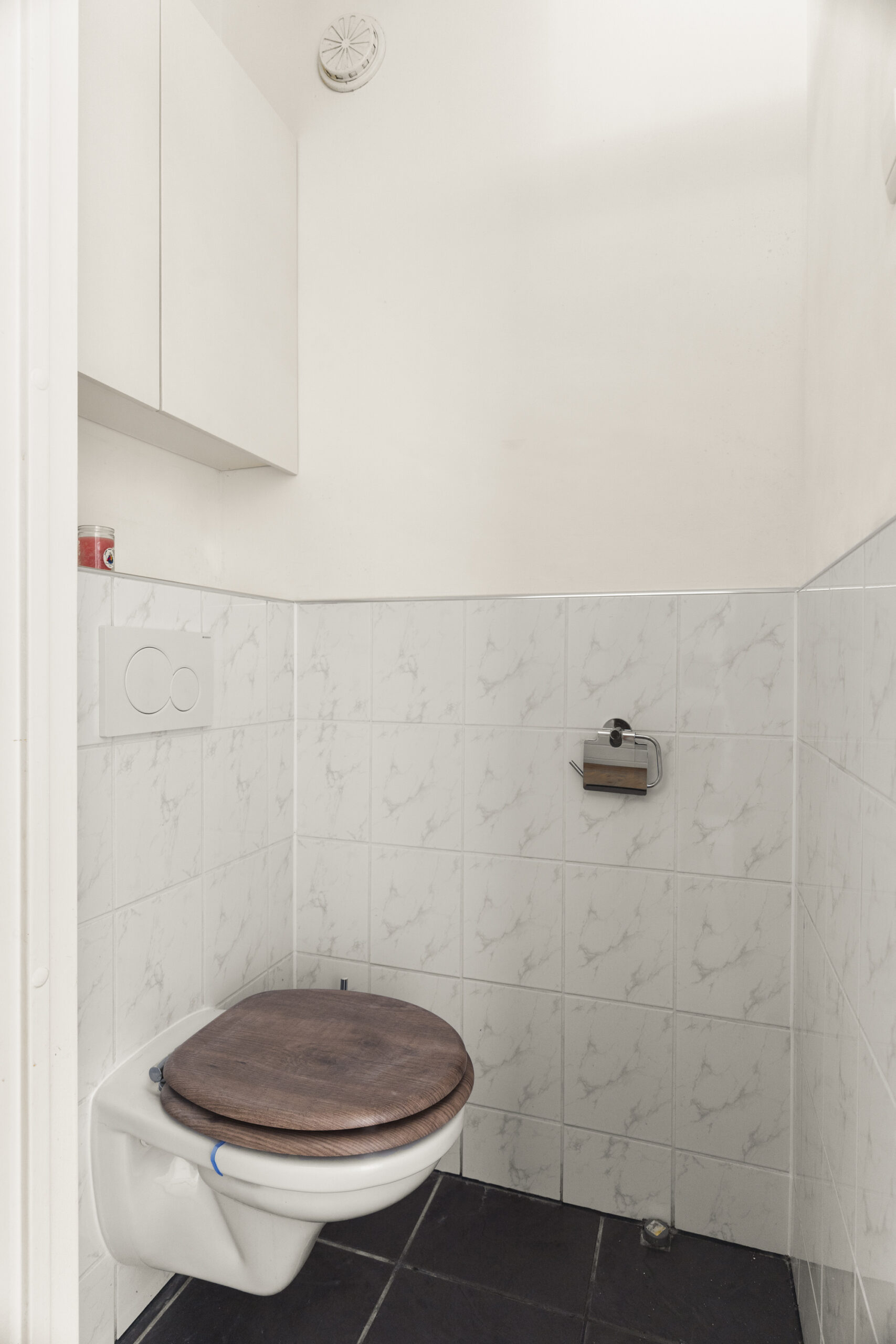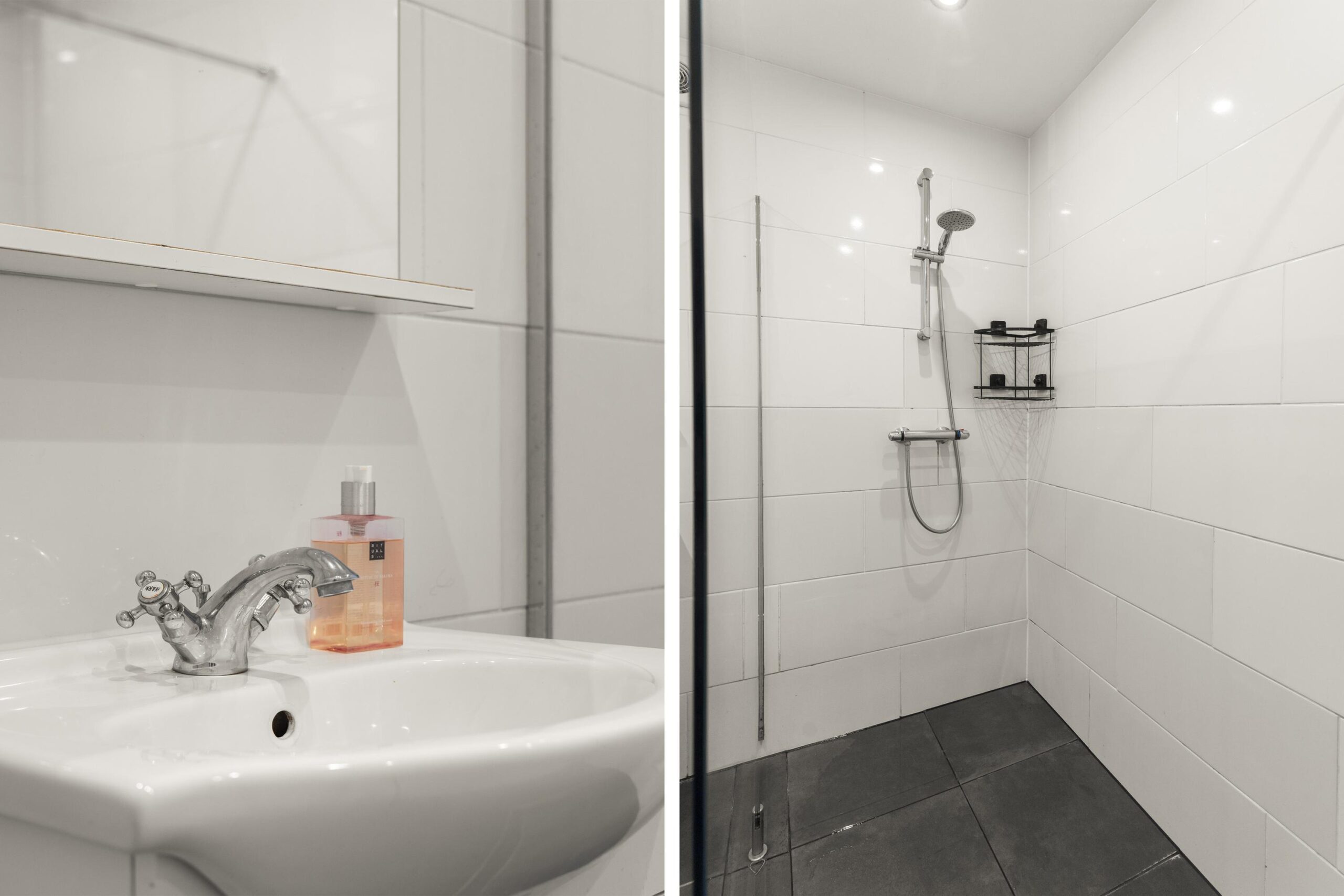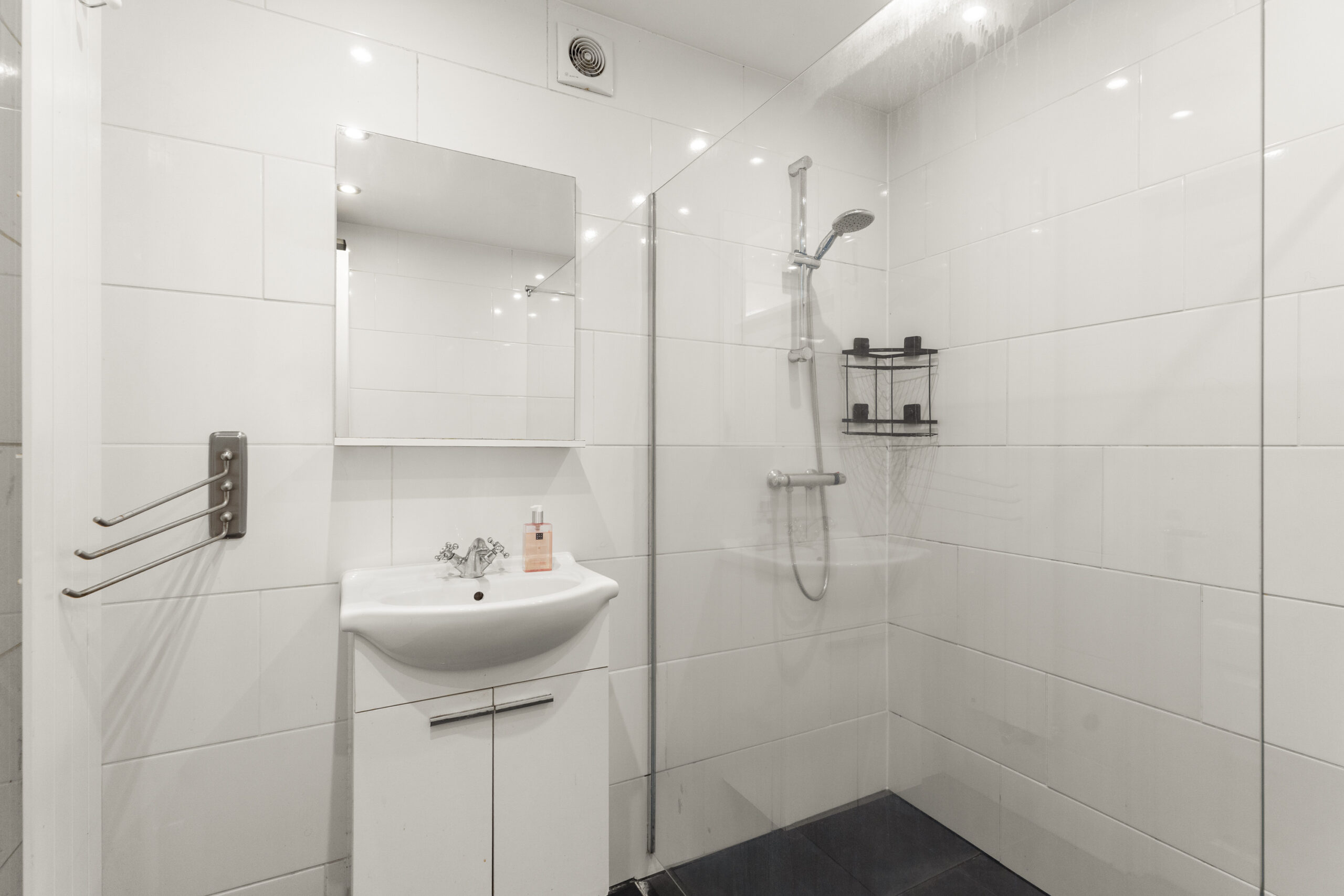 De moderne badkamer, geheel betegeld en is voorzien van een douche, wastafel, hoge kast en handdoek radiator. Naast de badkamer is een apart toilet in dezelfde uitvoering als de badkamer. Er is een fijne grote inpandige ruimte voor opslag; hier zit ook de aansluiting voor zowel de wasmachine als droger.