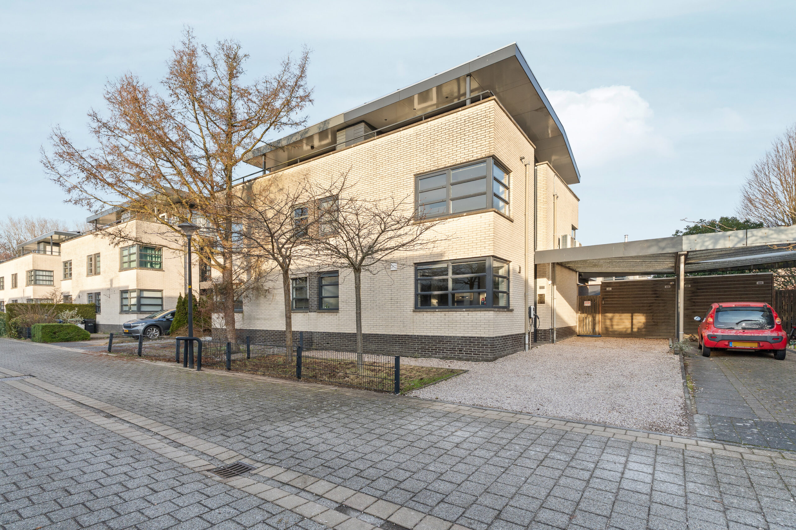 Aan de voorzijde is de woning voorzien van een royale carport met parkeergelegenheid voor meerdere voertuigen, ideaal voor zowel dagelijks gebruik als bezoek.