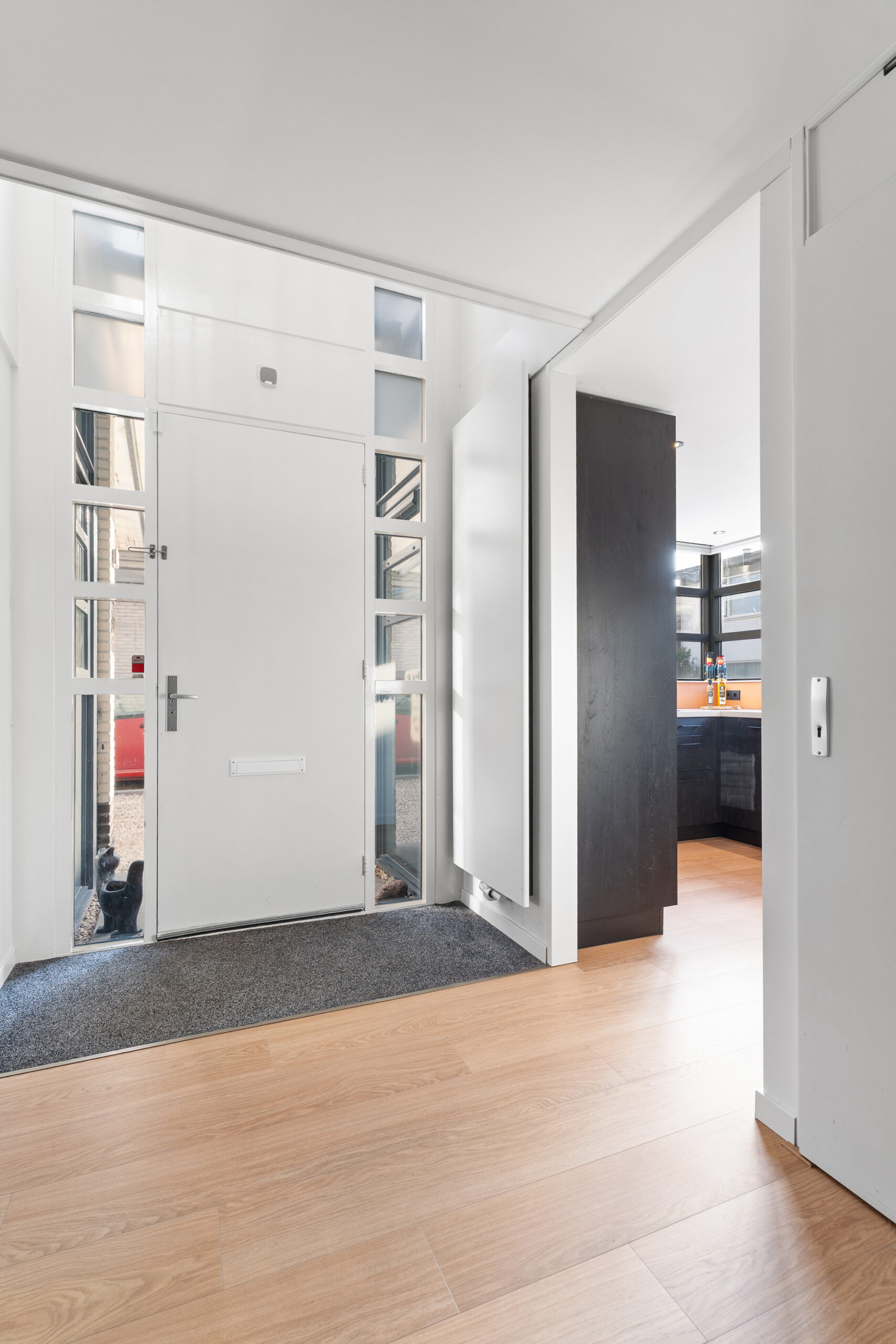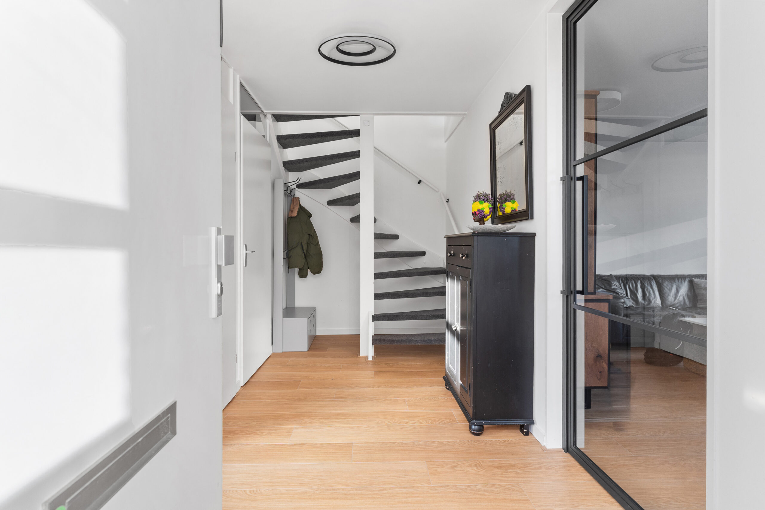 De voortuin is voorzien van een carport en parkeergelegenheid op eigen terrein. Via de entree betreed je de ruime hal, waar de vide direct zorgt voor een uitnodigende en lichte binnenkomst. Vanuit de hal zijn de meterkast, het toilet en de trap naar de eerste verdieping bereikbaar.