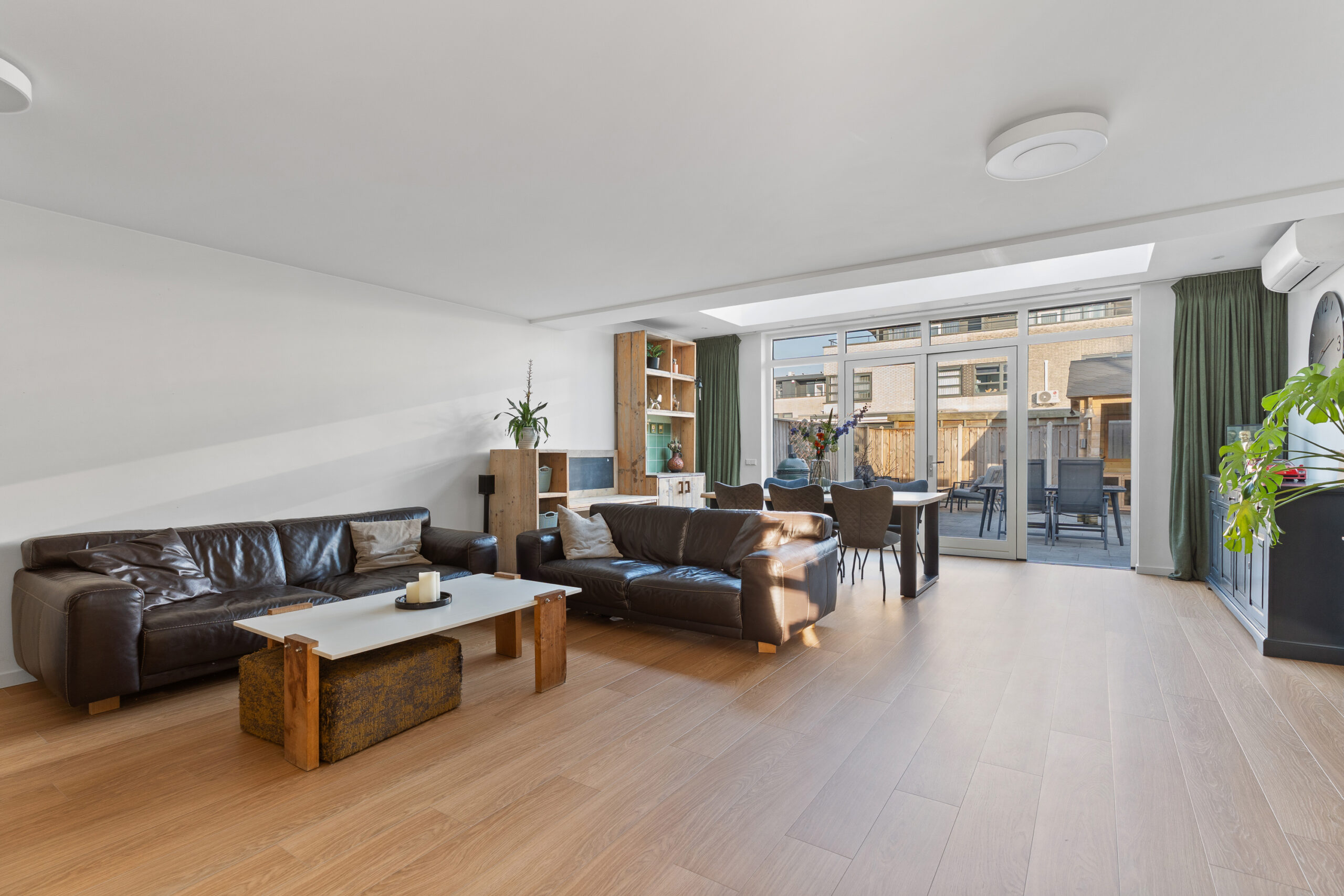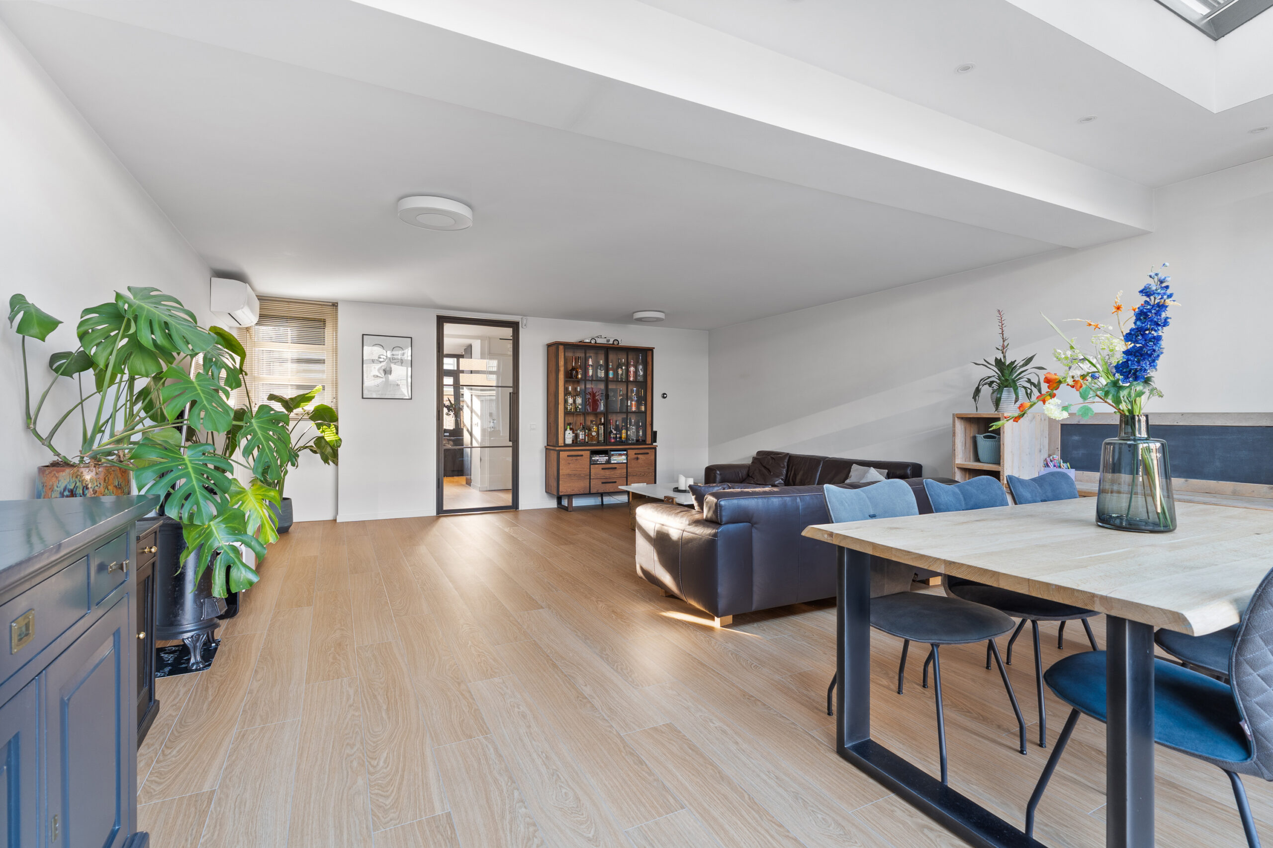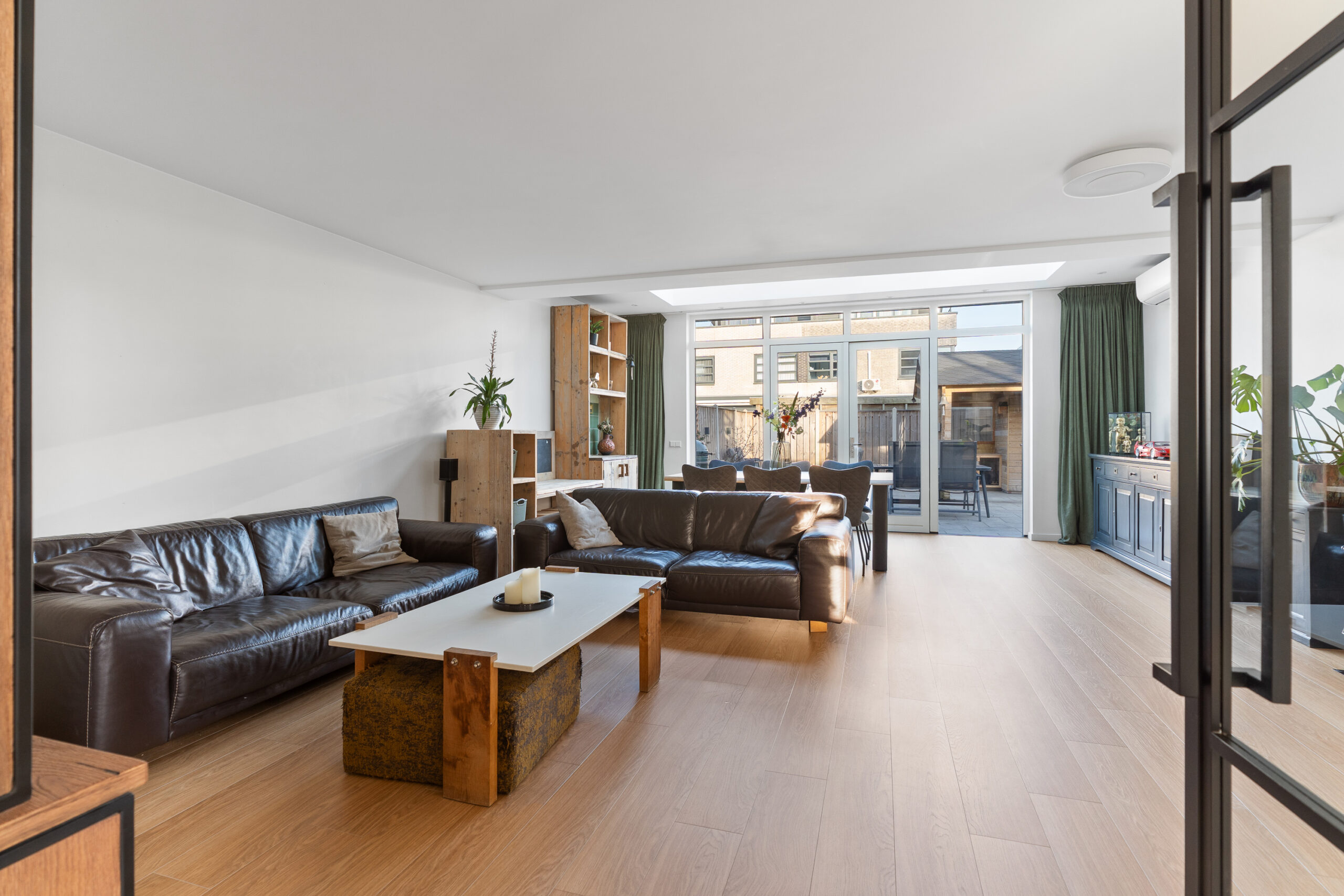 Via de stijlvolle stalen deur kom je in de uitgebouwde woonkamer, met een oppervlakte van circa 46 m², gelegen aan de achterzijde van de woning en volledig tuingericht. Dankzij de royale raampartijen en de fraaie dakramen is dit een bijzonder lichte en zonnige leefruimte. Via de openslaande deuren staat de woonkamer in directe verbinding met de tuin, wat zorgt voor een prettige binnen-buitenbeleving. De gehele begane grond is voorzien van vloerverwarming. Een heerlijke plek om te ontspannen of gezellig samen te zijn.
