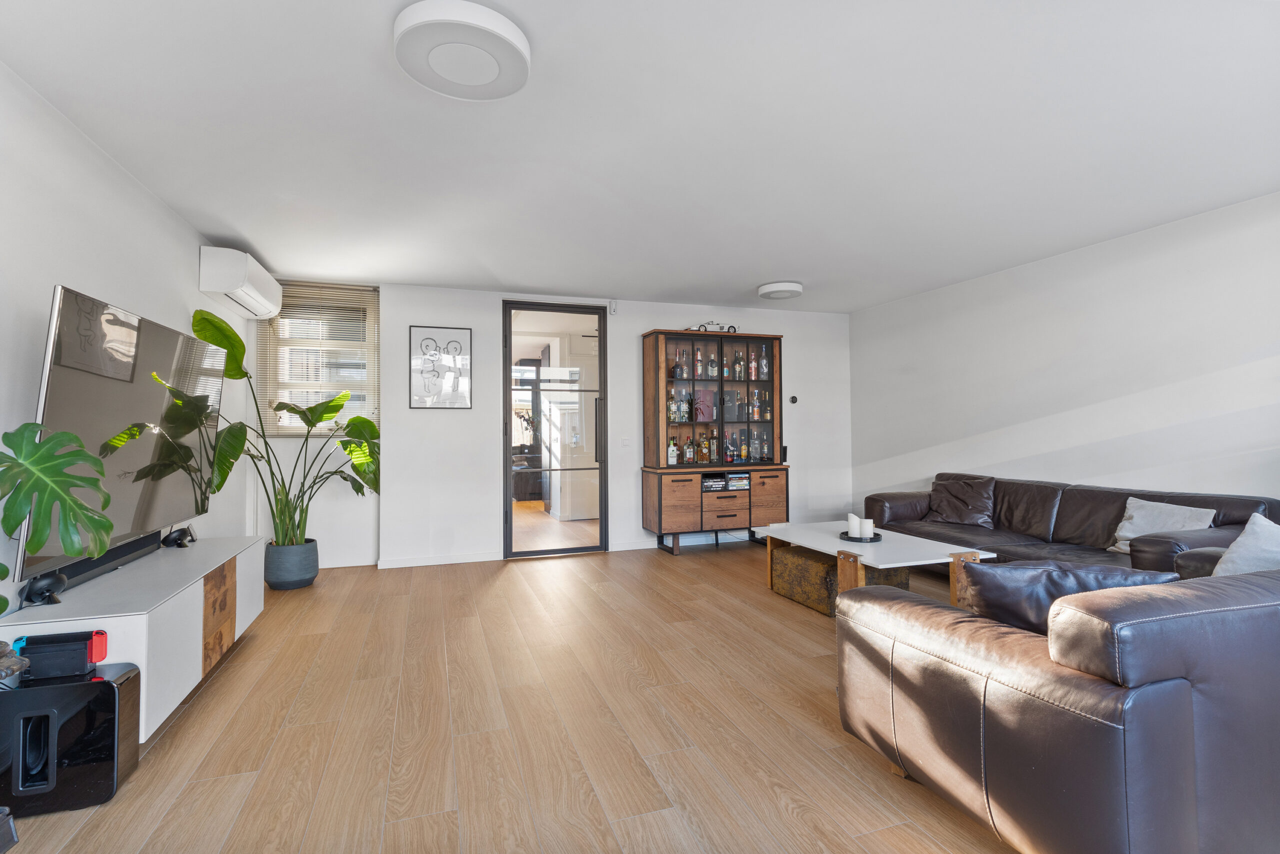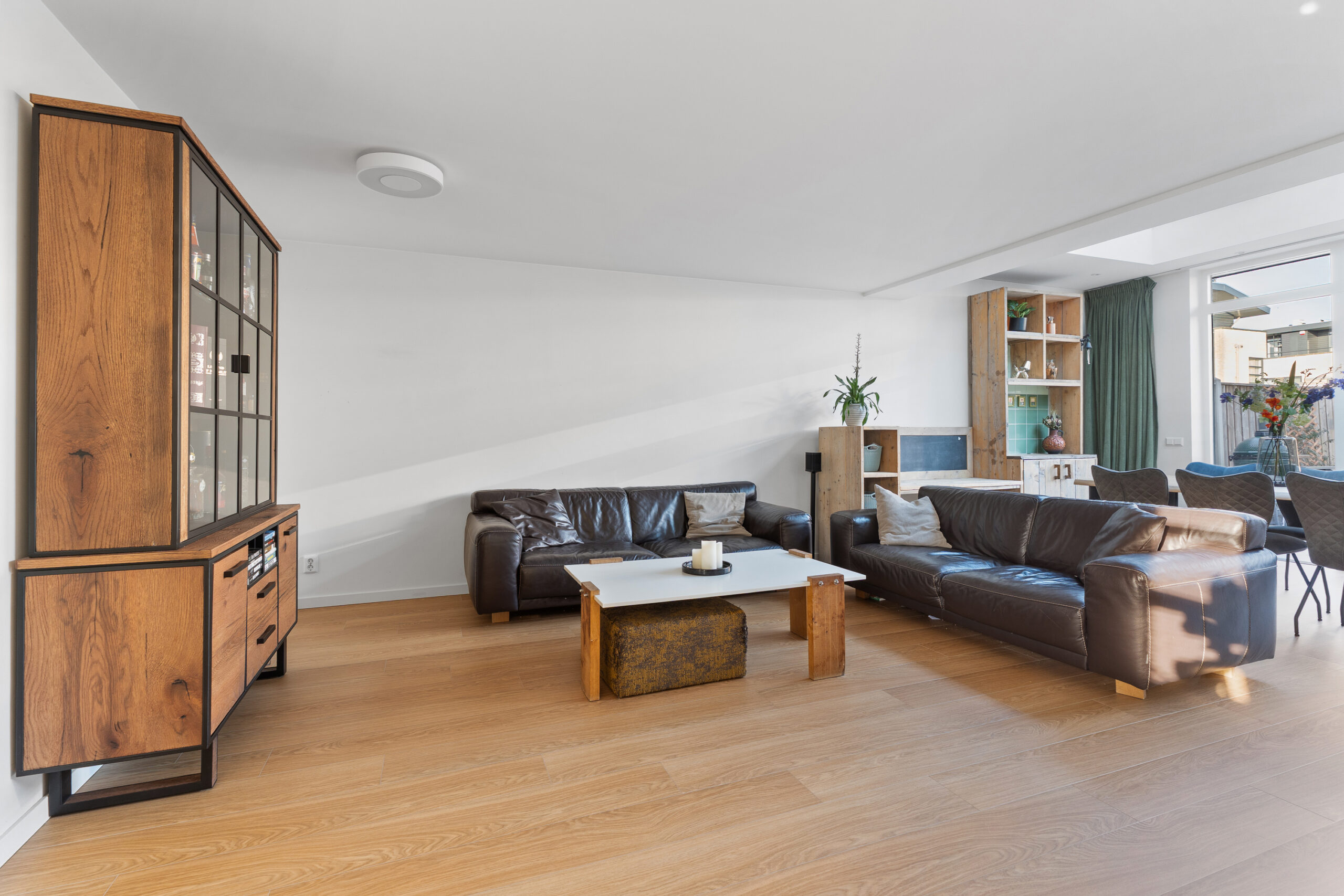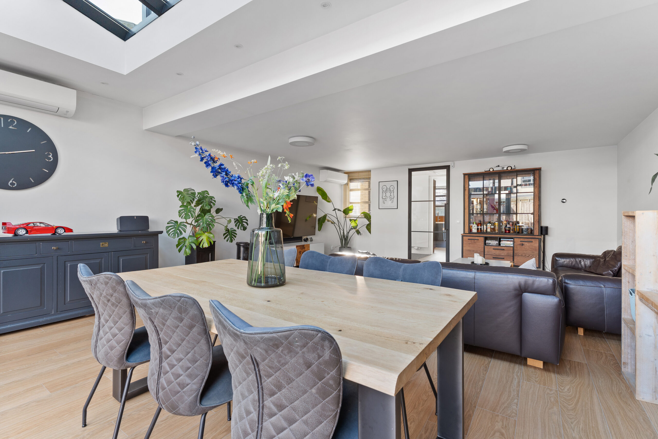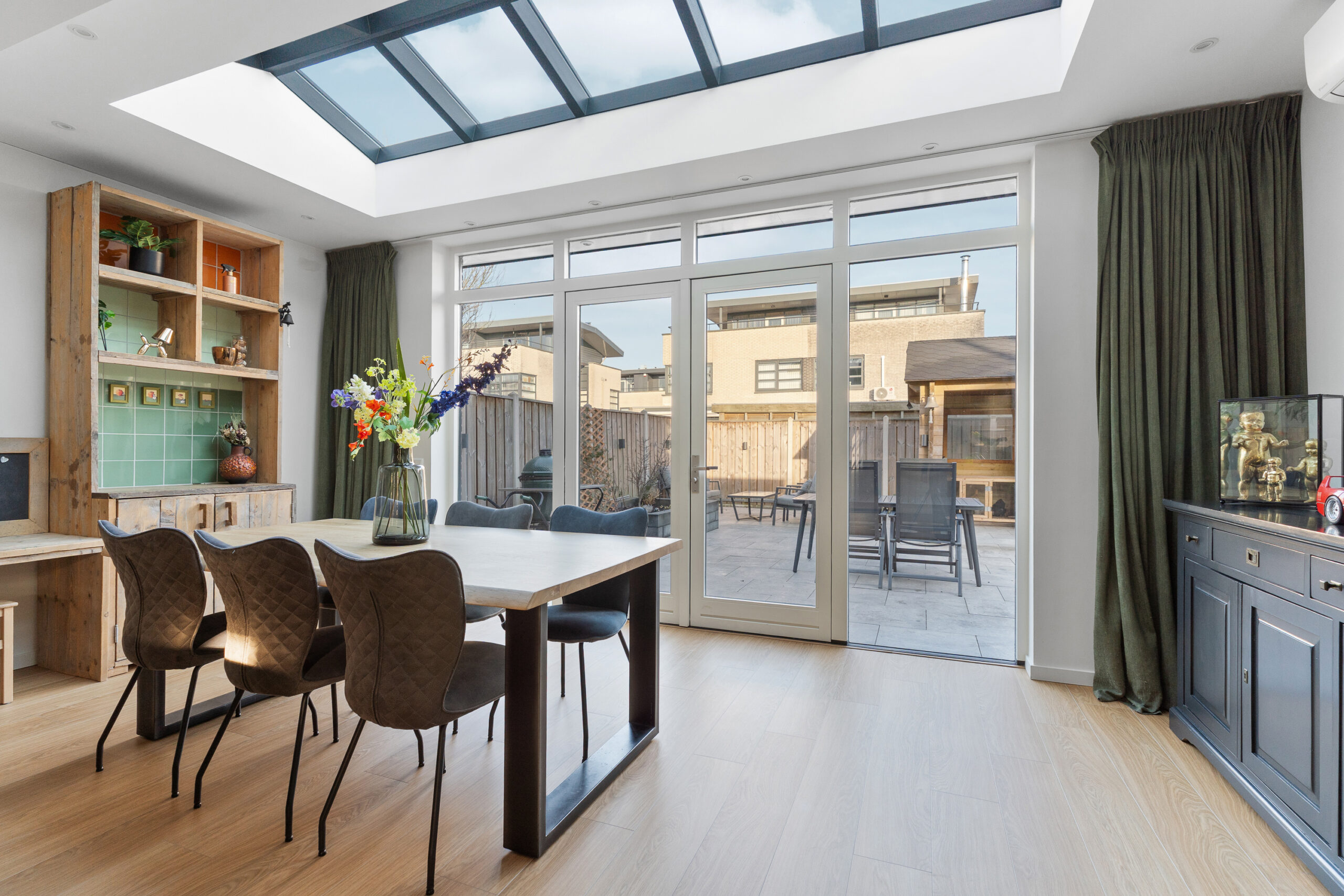 Via de stijlvolle stalen deur kom je in de uitgebouwde woonkamer, met een oppervlakte van circa 46 m², gelegen aan de achterzijde van de woning en volledig tuingericht. Dankzij de royale raampartijen en de fraaie dakramen is dit een bijzonder lichte en zonnige leefruimte. Via de openslaande deuren staat de woonkamer in directe verbinding met de tuin, wat zorgt voor een prettige binnen-buitenbeleving. De gehele begane grond is voorzien van vloerverwarming. Een heerlijke plek om te ontspannen of gezellig samen te zijn.