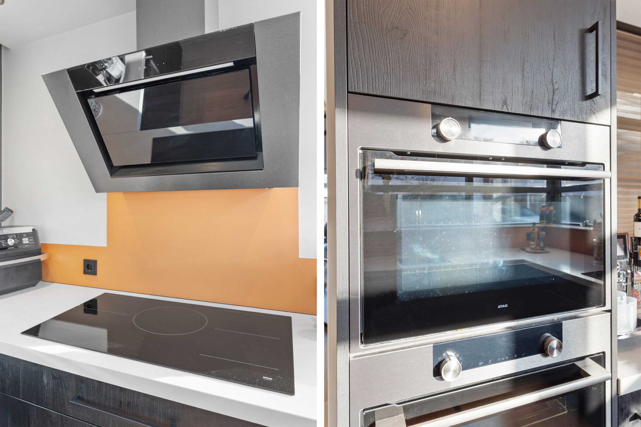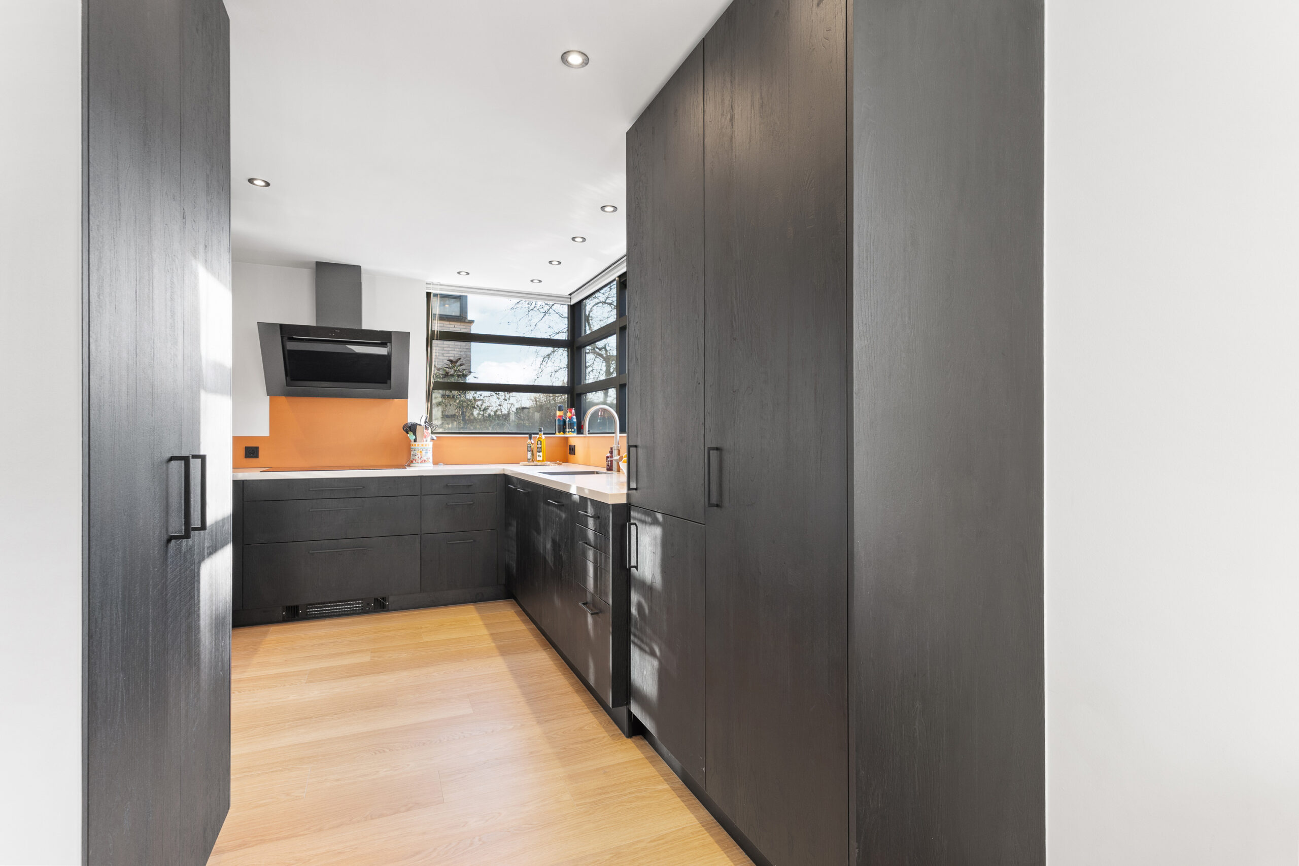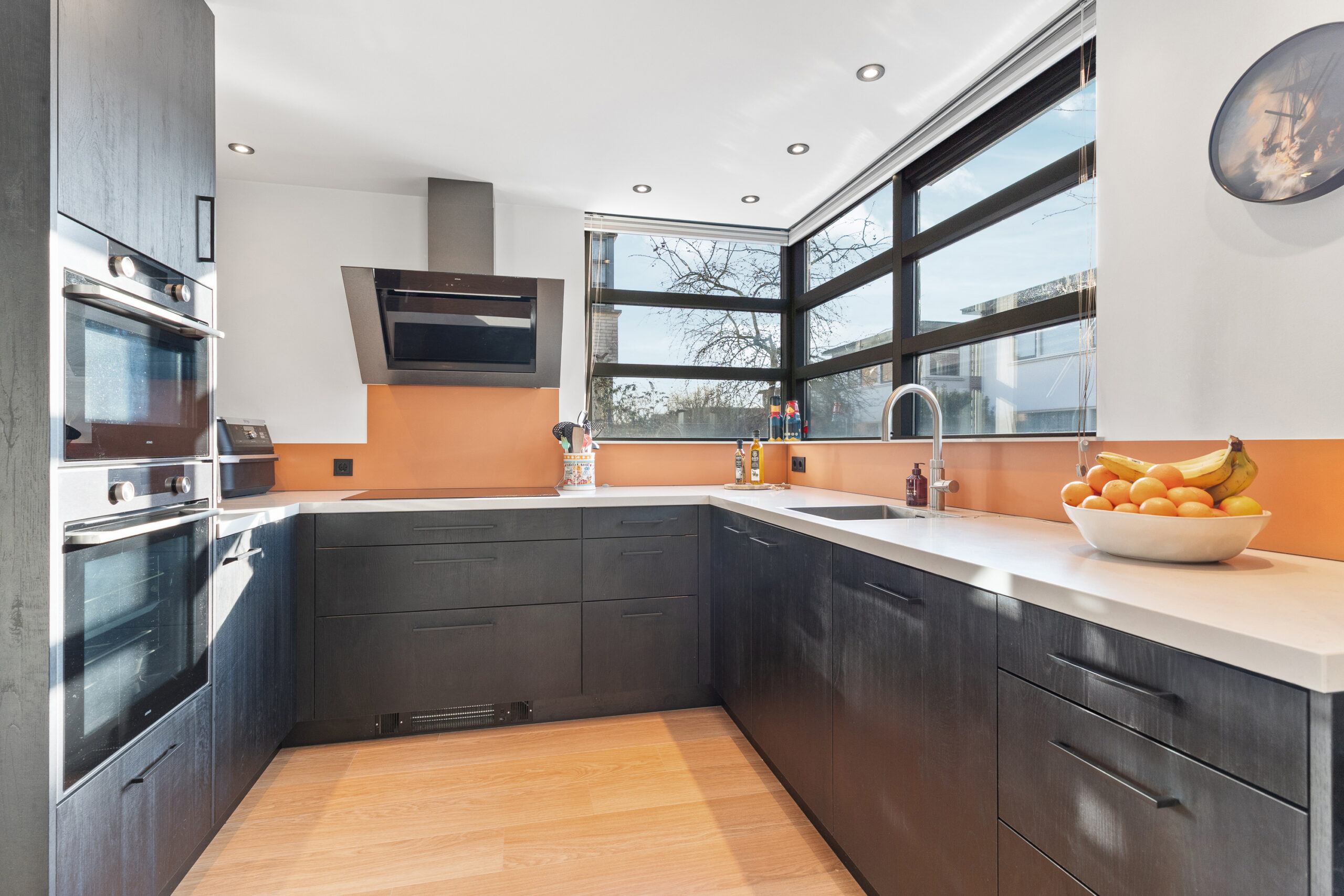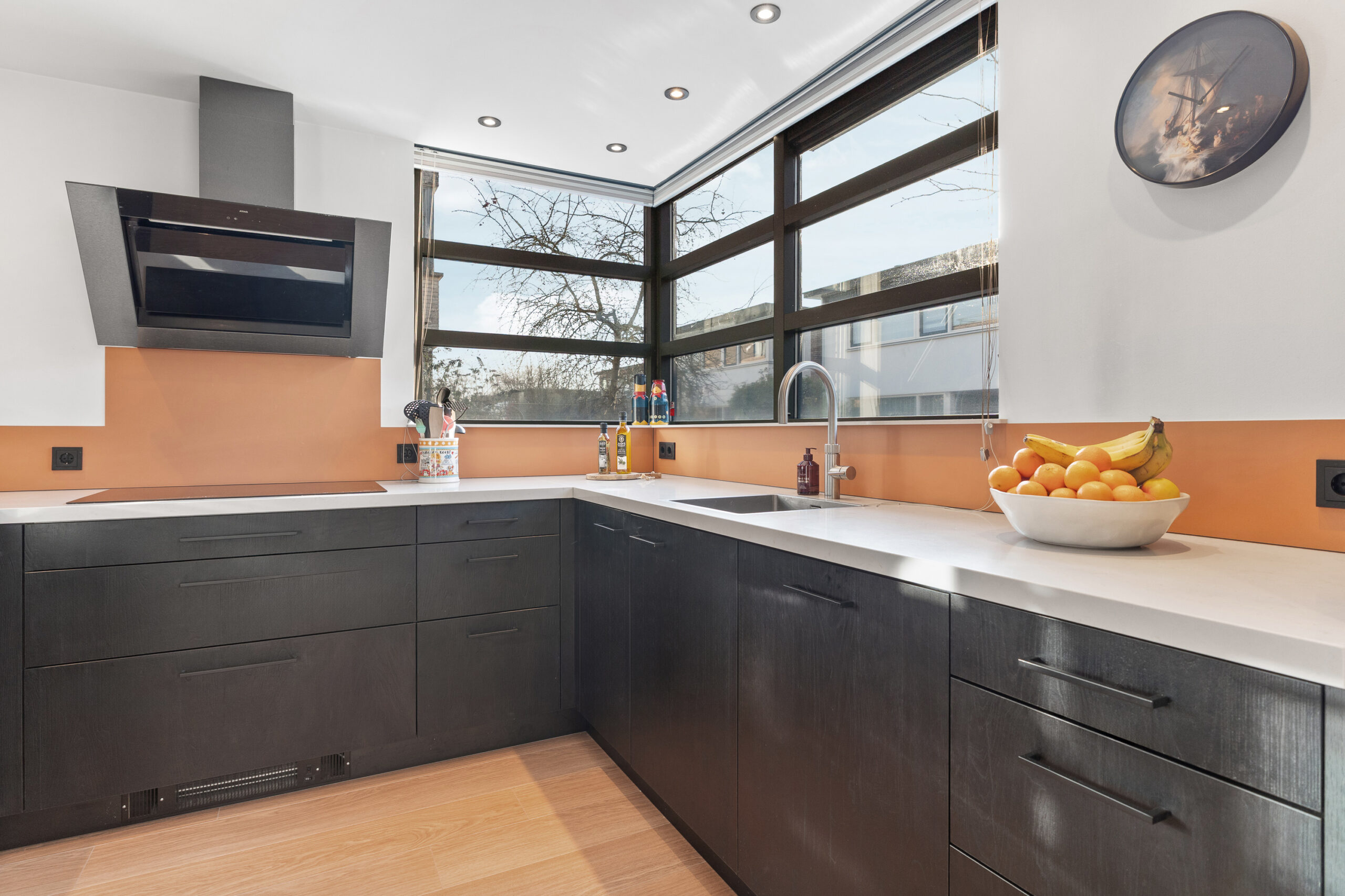 De moderne keuken is afgesloten van de woonkamer en uitgevoerd in een stijlvolle donkere kleurstelling met een praktische hoekopstelling. De keuken biedt veel werk- en bergruimte en is voorzien van diverse inbouwapparatuur. Dankzij de grote raampartijen is de ruimte prettig licht en heb je fijn zicht naar buiten. Ook hier is een leuke hoek aanwezig die zich uitstekend leent voor het creëren van een gezellige bar of een knusse zithoek. Een ideale plek voor een kop koffie in de ochtend of om tijdens het koken gezellig samen te zijn in de woonkeuken.