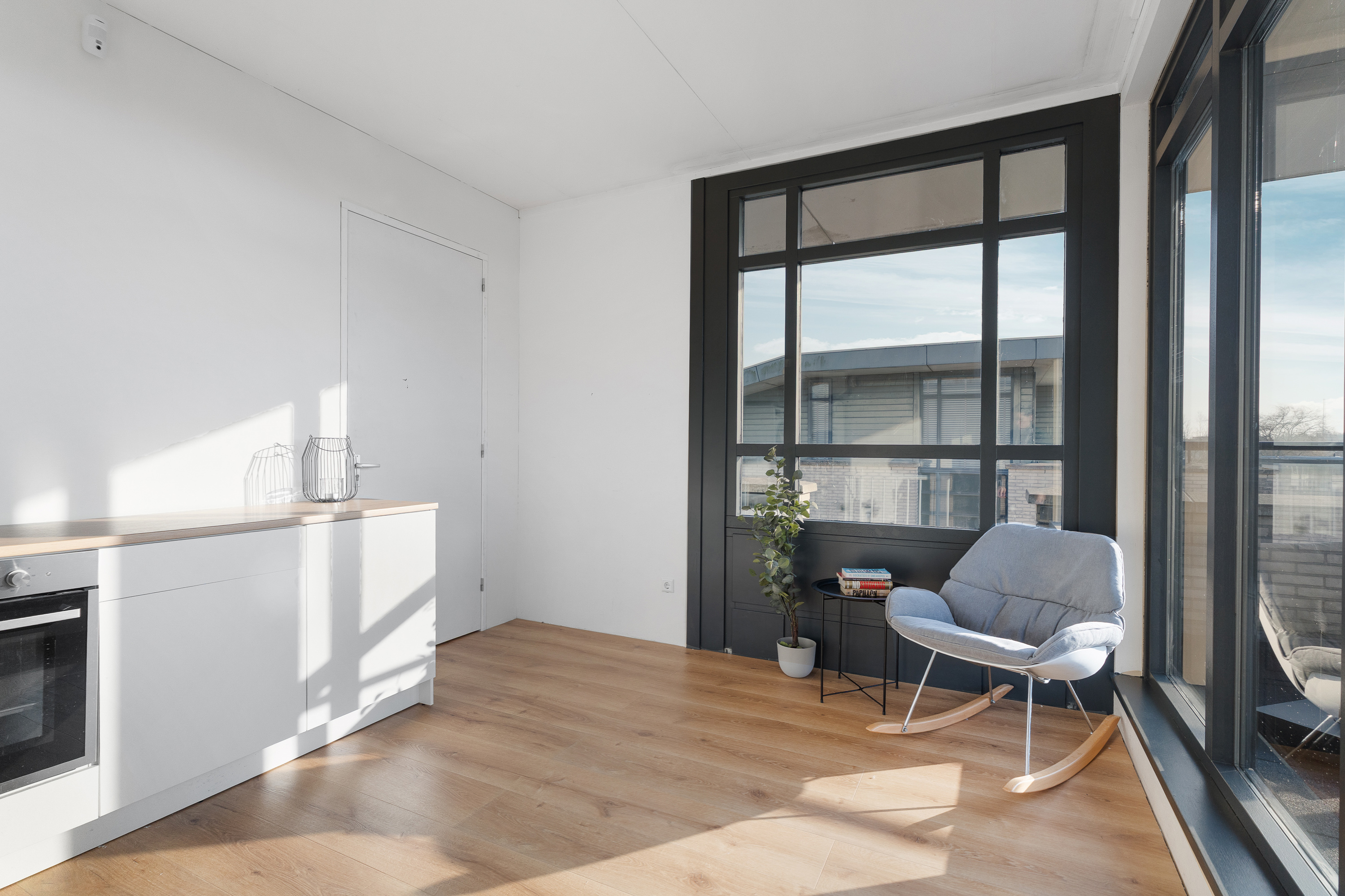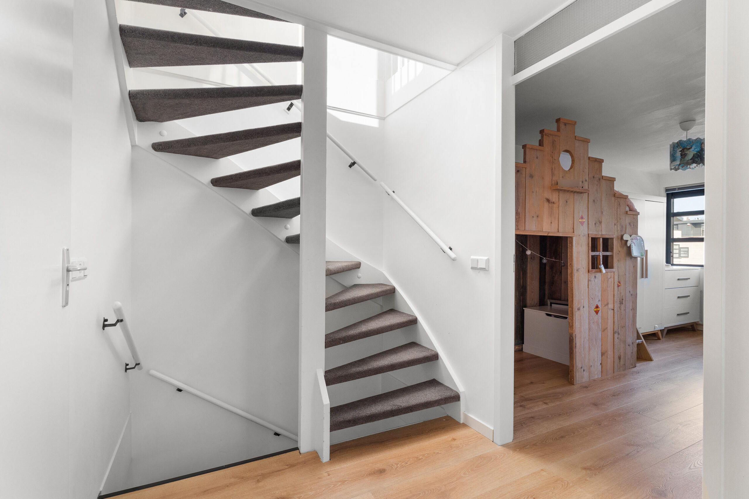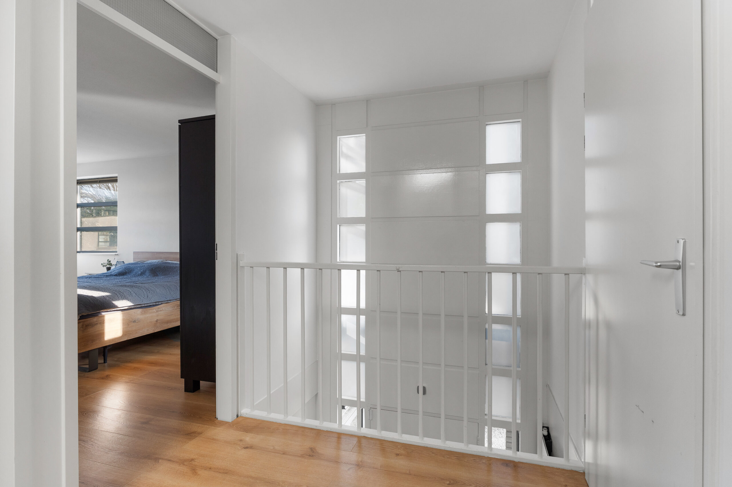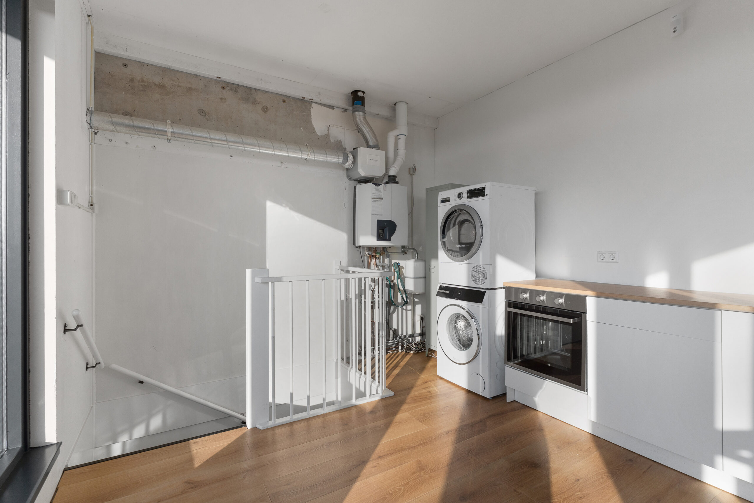 Aangrenzend aan de slaapkamer ligt een royale overloop. Hier bevinden zich de opstelplaats voor de wasmachine, de cv-ketel en extra bergruimte. Dankzij het formaat en de indeling leent deze ruimte zich ook uitstekend voor het creëren van een leuke zithoek of bijvoorbeeld een compacte keuken, zodat je optimaal kunt genieten van het aangrenzende dakterras. Aansluiting voor water en afvoer zijn al aanwezig.
