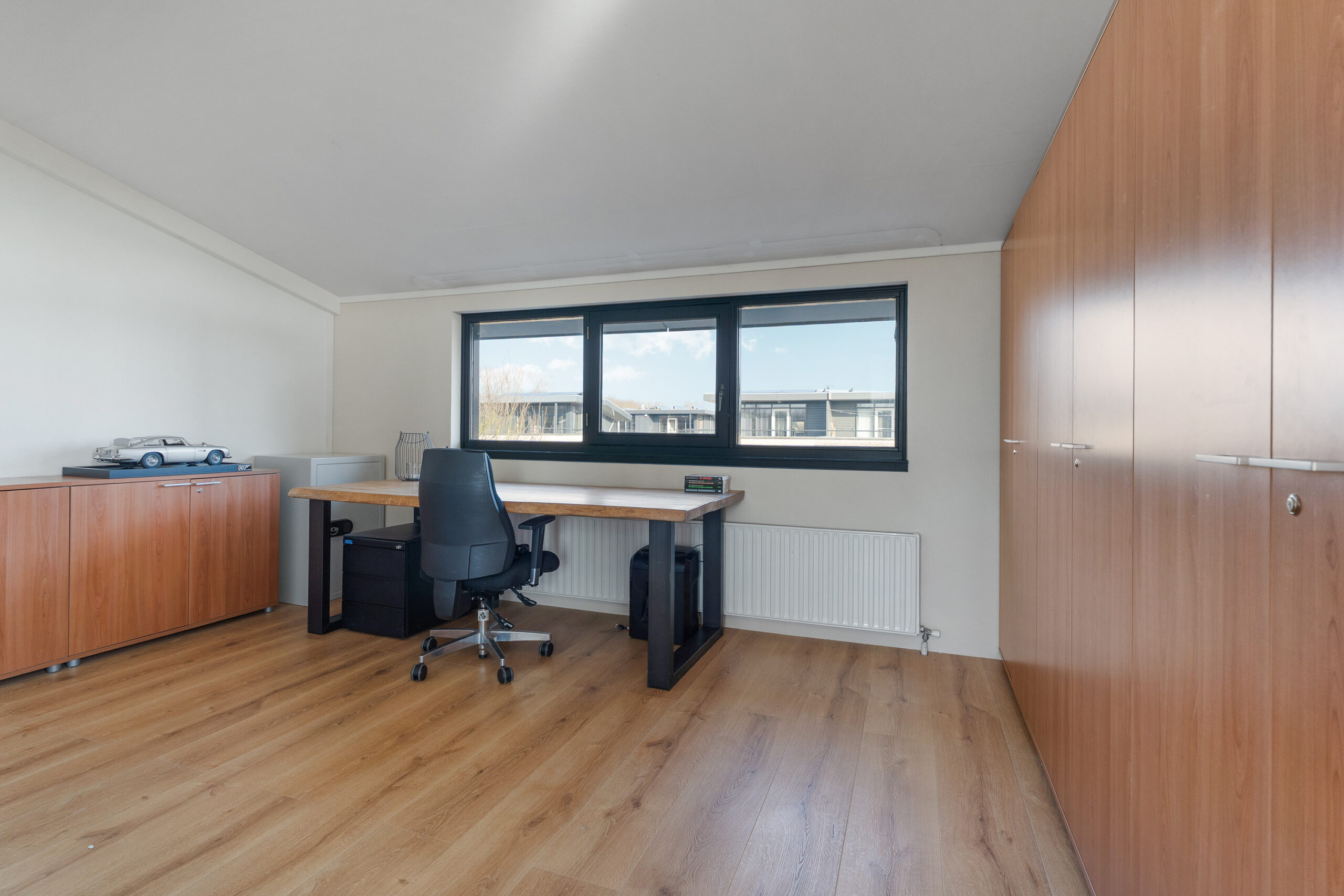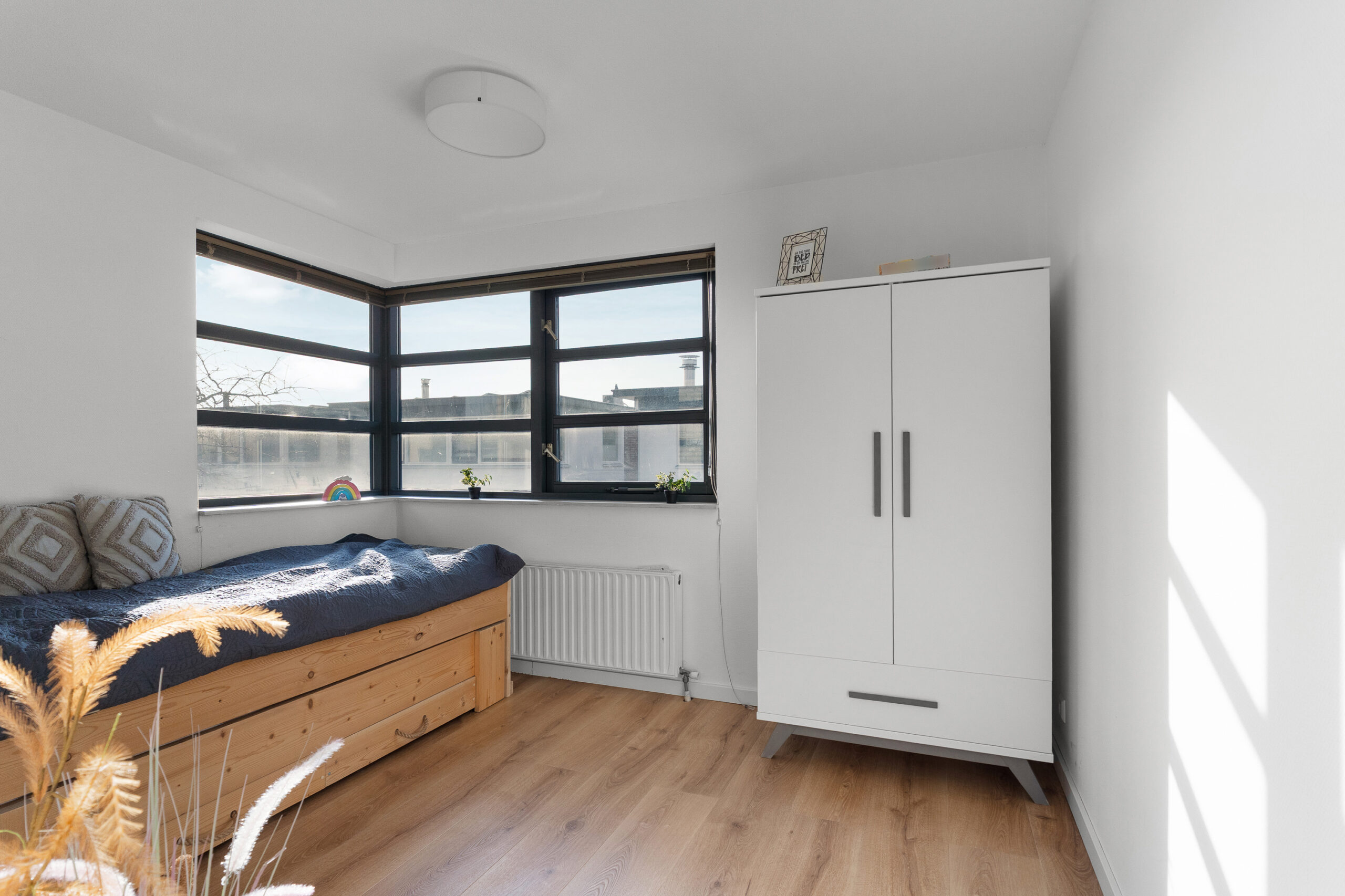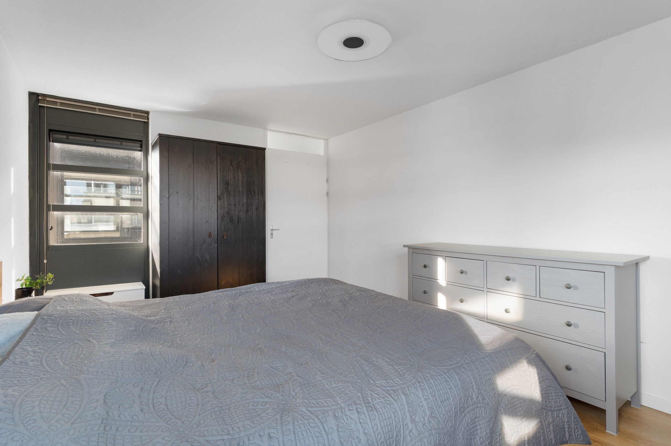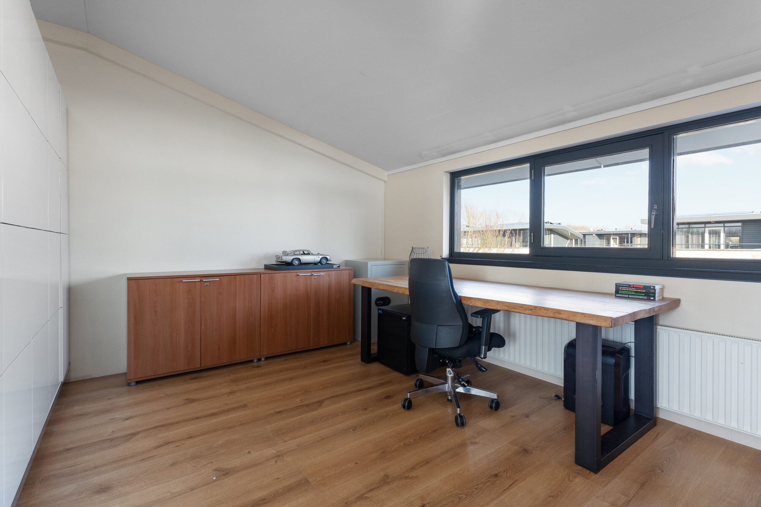 Aangrenzend aan de slaapkamer ligt een royale overloop. Hier bevinden zich de opstelplaats voor de wasmachine, de cv-ketel en extra bergruimte. Dankzij het formaat en de indeling leent deze ruimte zich ook uitstekend voor het creëren van een leuke zithoek of bijvoorbeeld een compacte keuken, zodat je optimaal kunt genieten van het aangrenzende dakterras. Aansluiting voor water en afvoer zijn al aanwezig.
