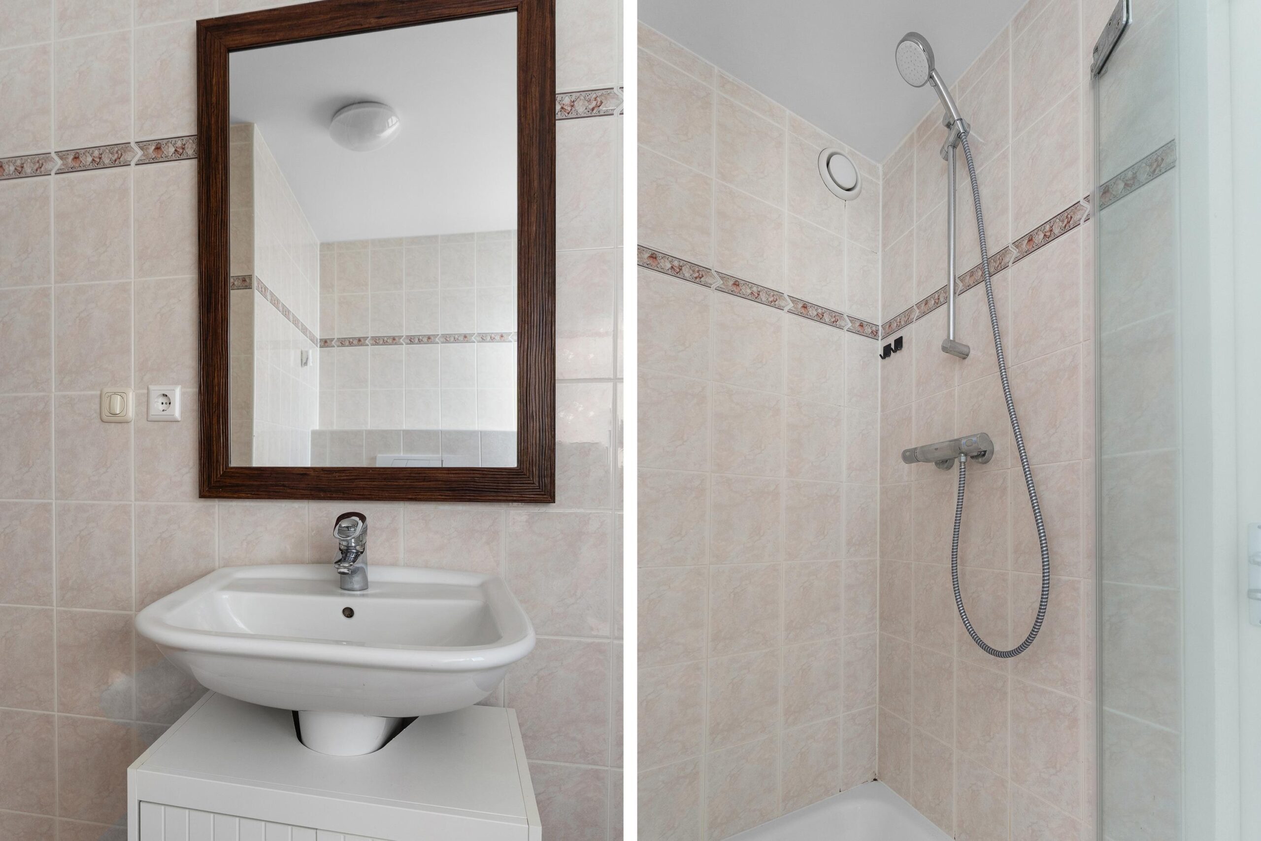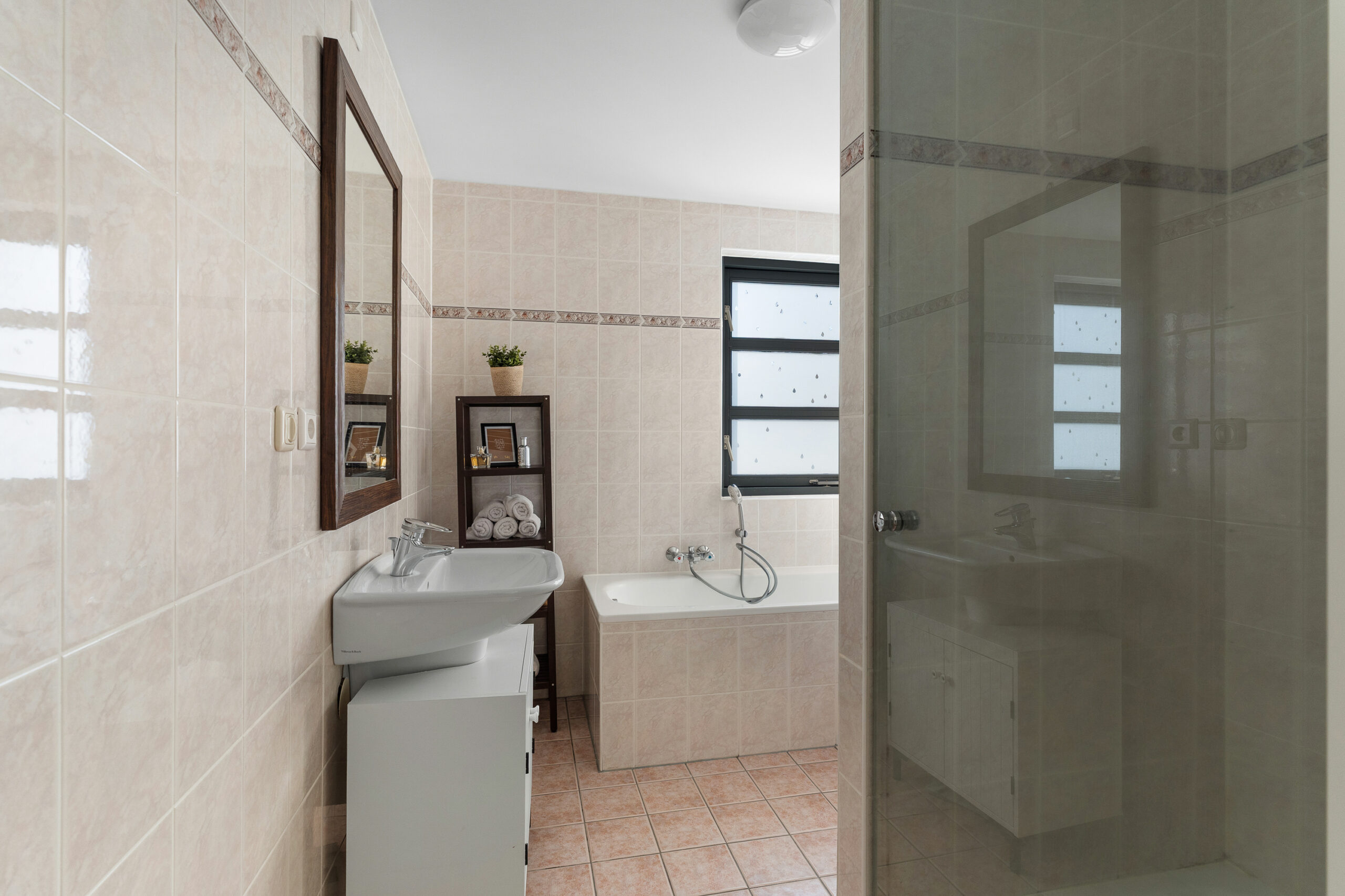 De badkamer is volledig betegeld in een lichte, neutrale kleurstelling en beschikt over een prettige indeling. De ruimte is voorzien van een ligbad, een aparte douche, een wastafel met meubel en een toilet. Dankzij het raam is er natuurlijke lichtinval en de mogelijkheid tot ventilatie, wat zorgt voor een frisse en aangename ruimte.