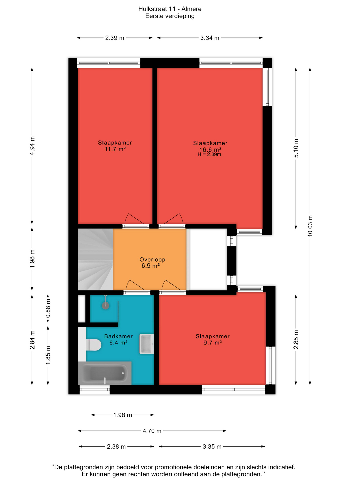 Via de vaste trap bereik je de eerste verdieping, waar zich drie slaapkamers en de badkamer bevinden. De grootste slaapkamer heeft een oppervlakte van circa 16,6 m² en biedt volop ruimte voor een tweepersoonsbed en een kastenwand. De tweede slaapkamer is circa 11,7 m² groot en eveneens geschikt als volwaardige slaapkamer. De derde slaapkamer, met een oppervlakte van circa 9,7 m², is ideaal te gebruiken als kinder-, werk- of logeerkamer.
