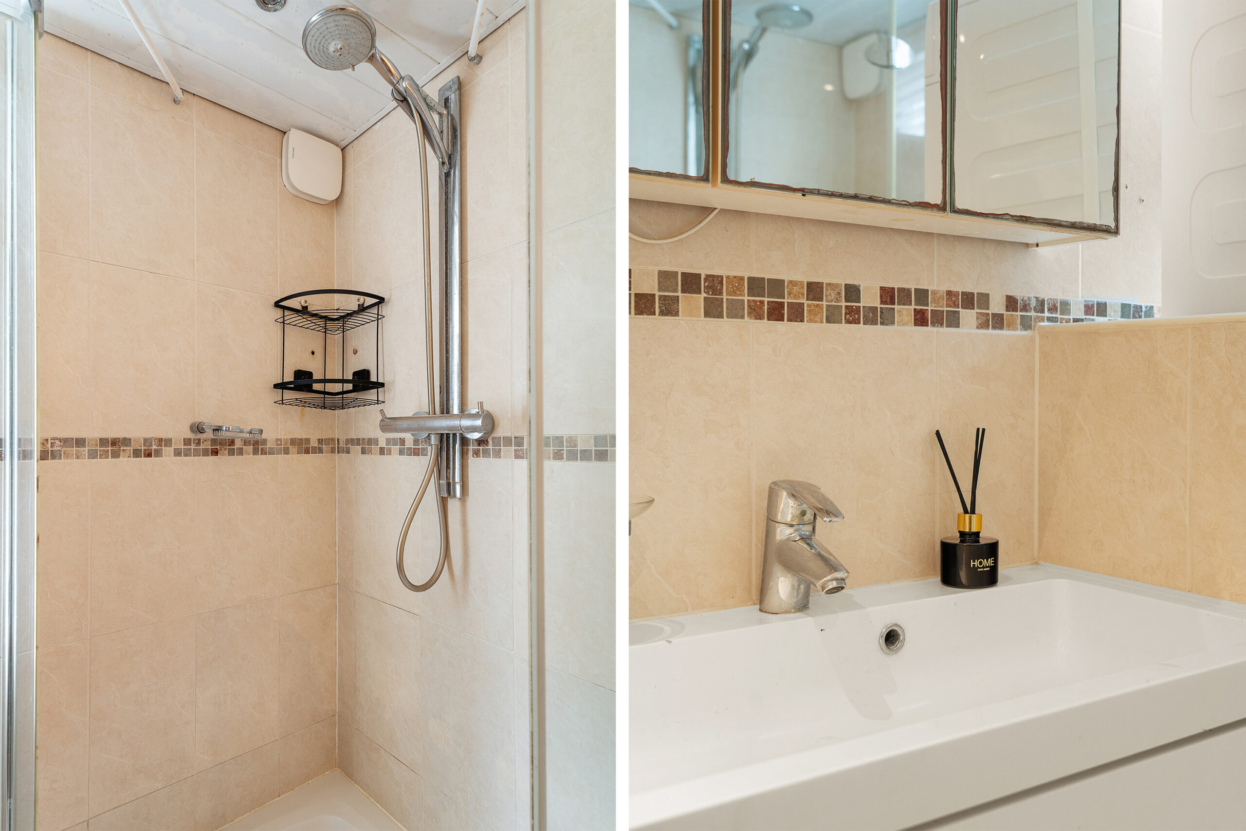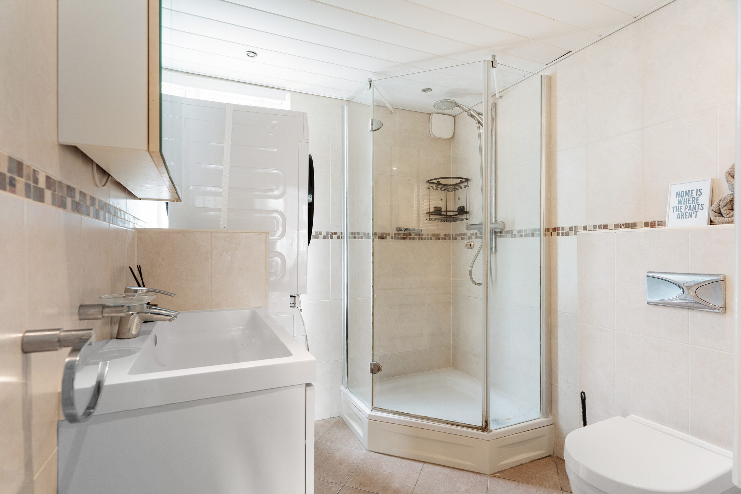De badkamer van ca. 4 m² is uitgevoerd met een douchecabine, een stijlvol wastafelmeubel, een vrij hangend toilet en een designradiator. Het verlaagde plafond is voorzien van ingebouwde verlichting, wat zorgt voor een strakke en verzorgde uitstraling. Dankzij het aanwezige raam geniet je hier van natuurlijk licht en extra ventilatie, prettig en praktisch tegelijk.