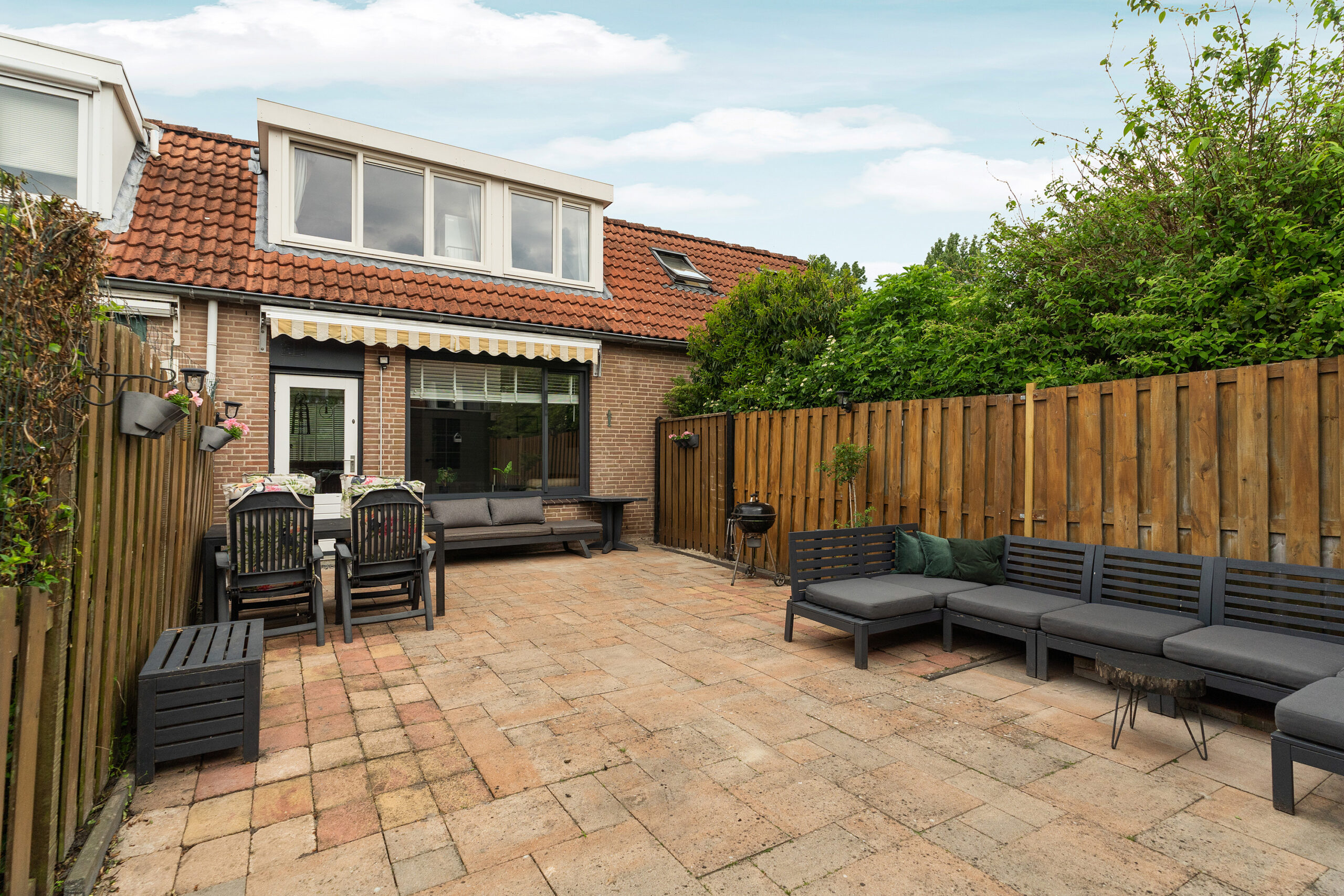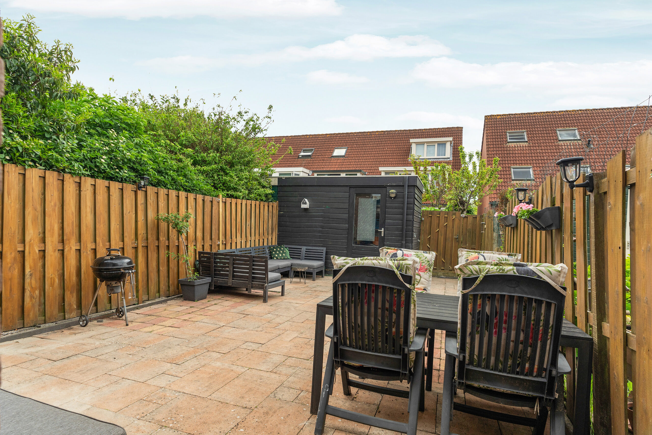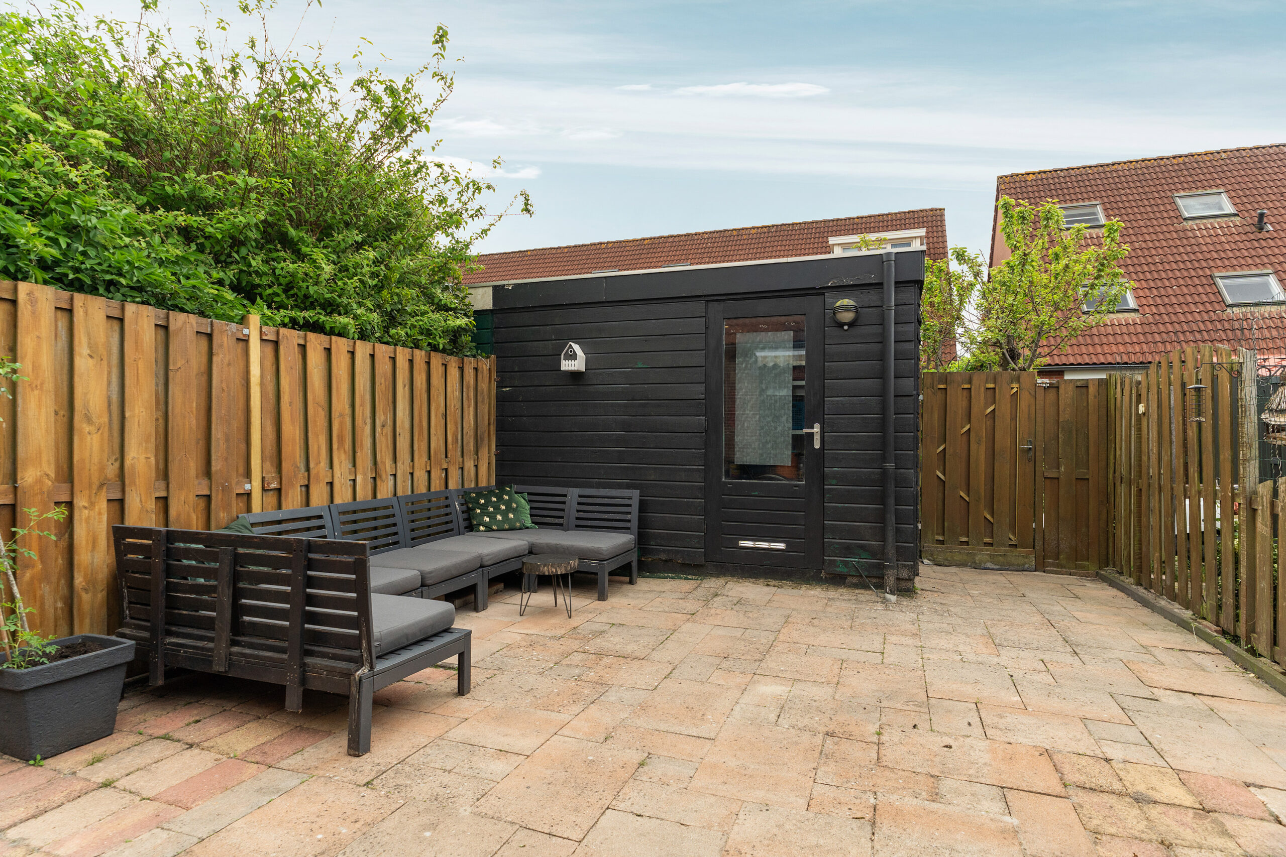 De zonnige achtertuin, gelegen op het zuidoosten, is een heerlijke plek om van het buitenleven te genieten. Dankzij het zonnescherm kun je zowel in de volle zon als in de schaduw ontspannen. De tuin is verder goed verzorgd en biedt voldoende ruimte om verschillende zitjes te creëren, perfect voor zowel rustige momenten als gezellige bijeenkomsten. Er is tevens een wateraansluiting en een achterom, wat extra gemak biedt. Achterin de tuin staat een geïsoleerde berging van ca. 7 m², die voorheen als praktijkruimte werd gebruikt, ideaal voor diverse doeleinden, zoals een hobbyruimte of extra opbergruimte.