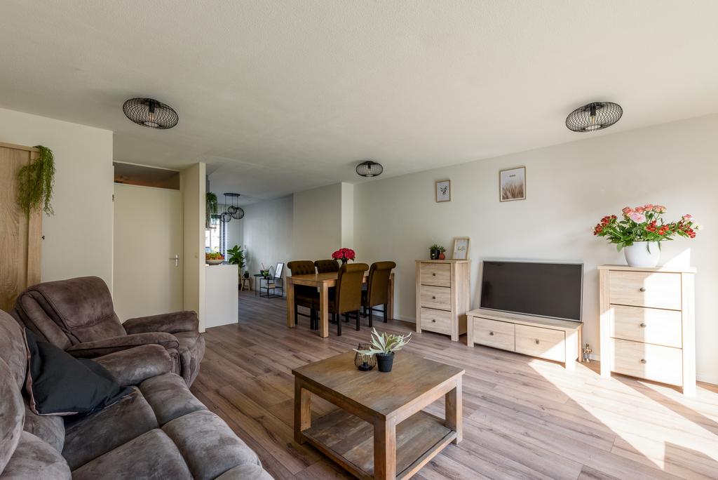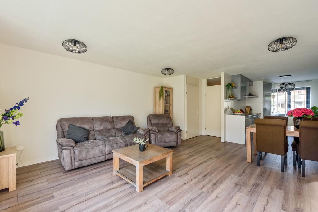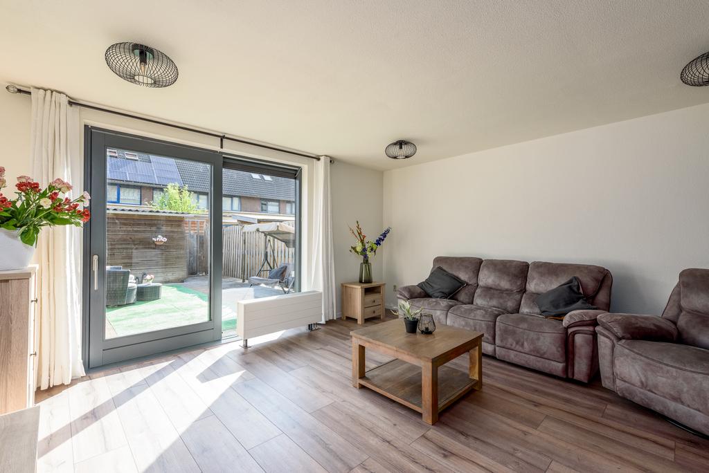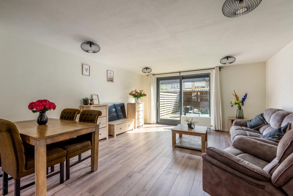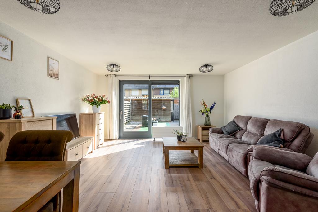 Betreed de ruime en modern afgewerkte woonkamer, waar veel natuurlijk licht door de grote schuifpui naar binnen stroomt. Deze tuingerichte woonkamer is voorzien van een mooie laminaatvloer en beschikt tevens over een praktische provisieruimte onder de trap.