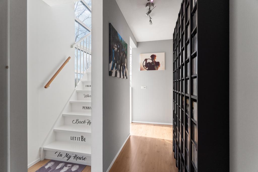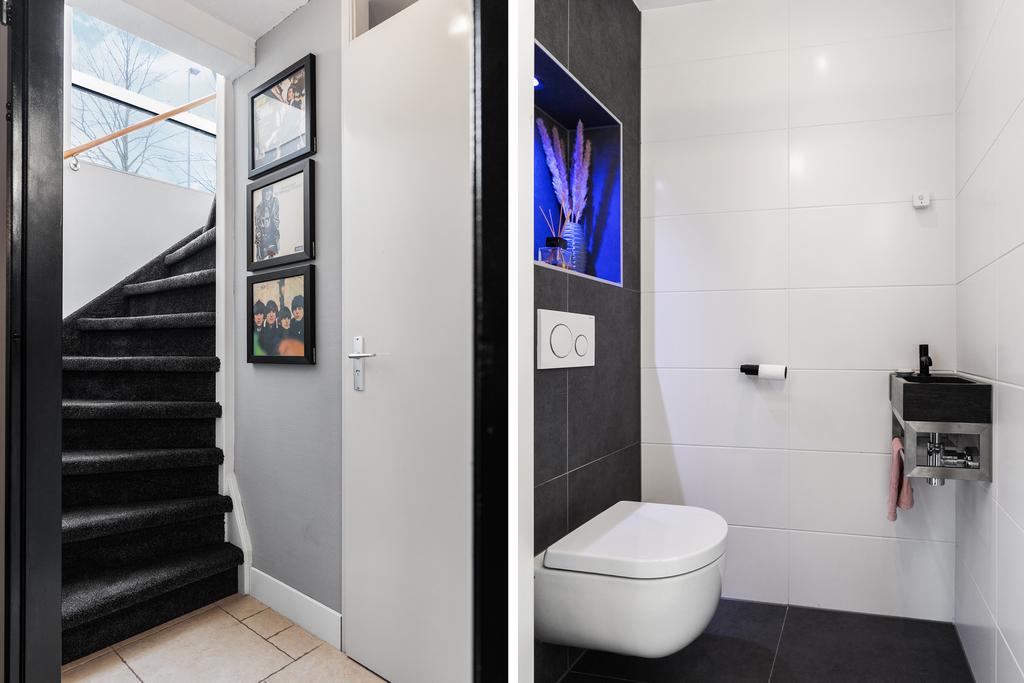 In de tweede hal vind je een eigentijds toilet, voorzien van een vrijhangend closet, betegeling tot aan het plafond en een fraai nisje. Via deze hal betreed je het prachtige en unieke trappenhuis, waar de verrassende lichtinval direct opvalt! Dit is met name een van de unieke kenmerken van de woning die je in het echt zal willen zien.