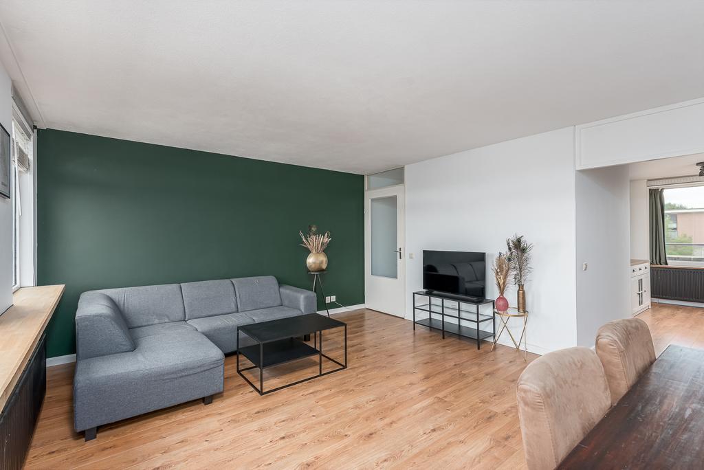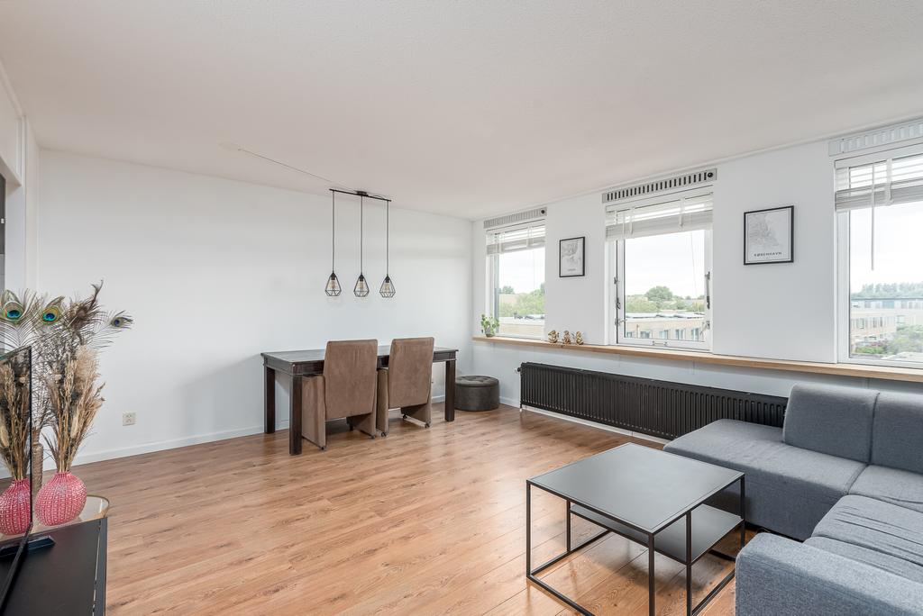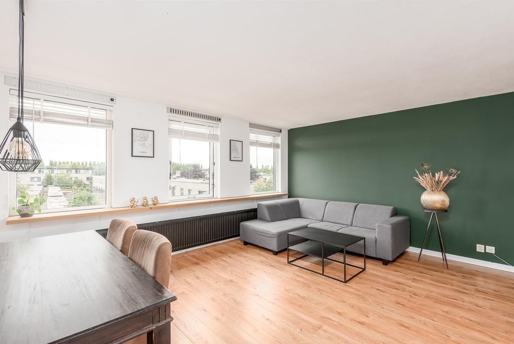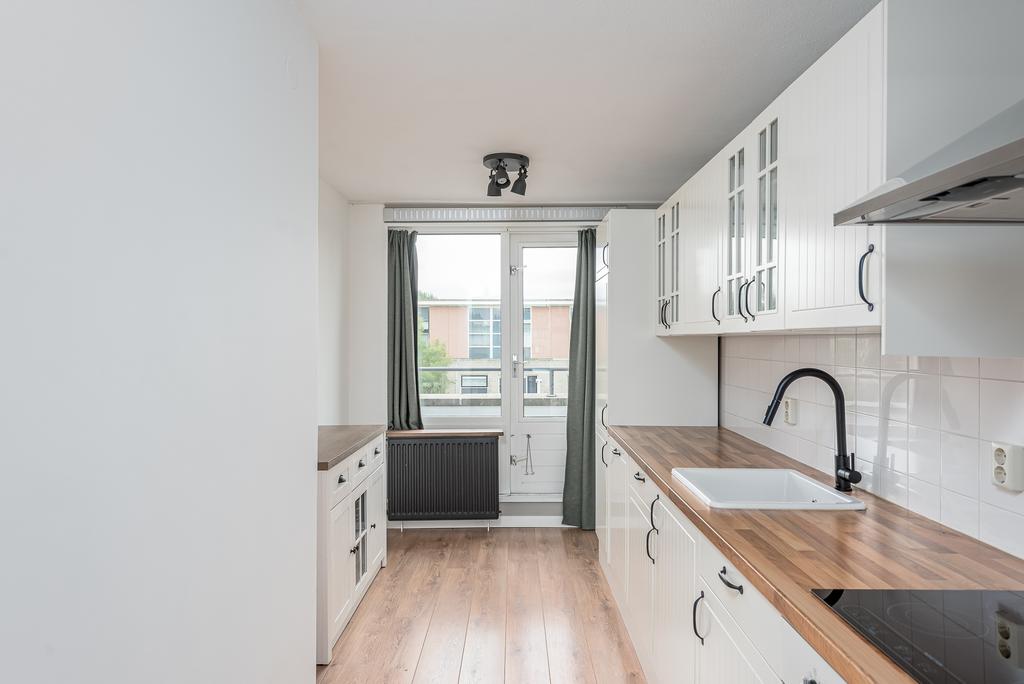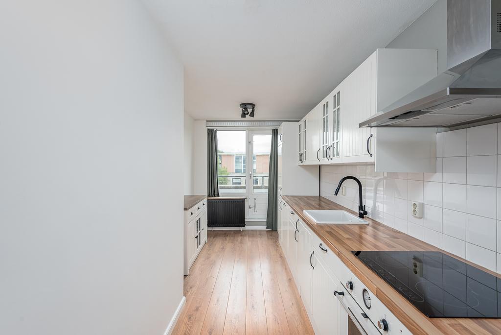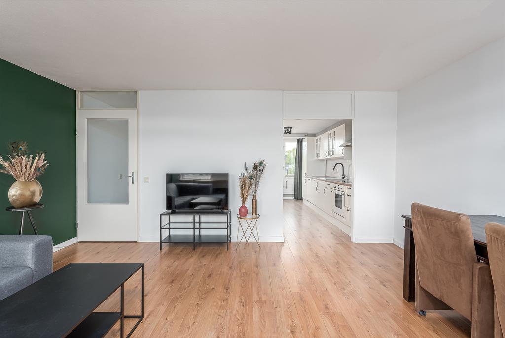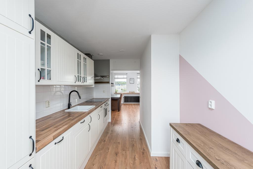 De woonkamer is voorzien van veel licht inval door de grote ramen. De moderne keuken is in lichte kleur opstelling en is voorzien van inductie kookplaat, oven, vaatwasser koel -/vries combinatie, spoelbak en RVS-afzuigkap.