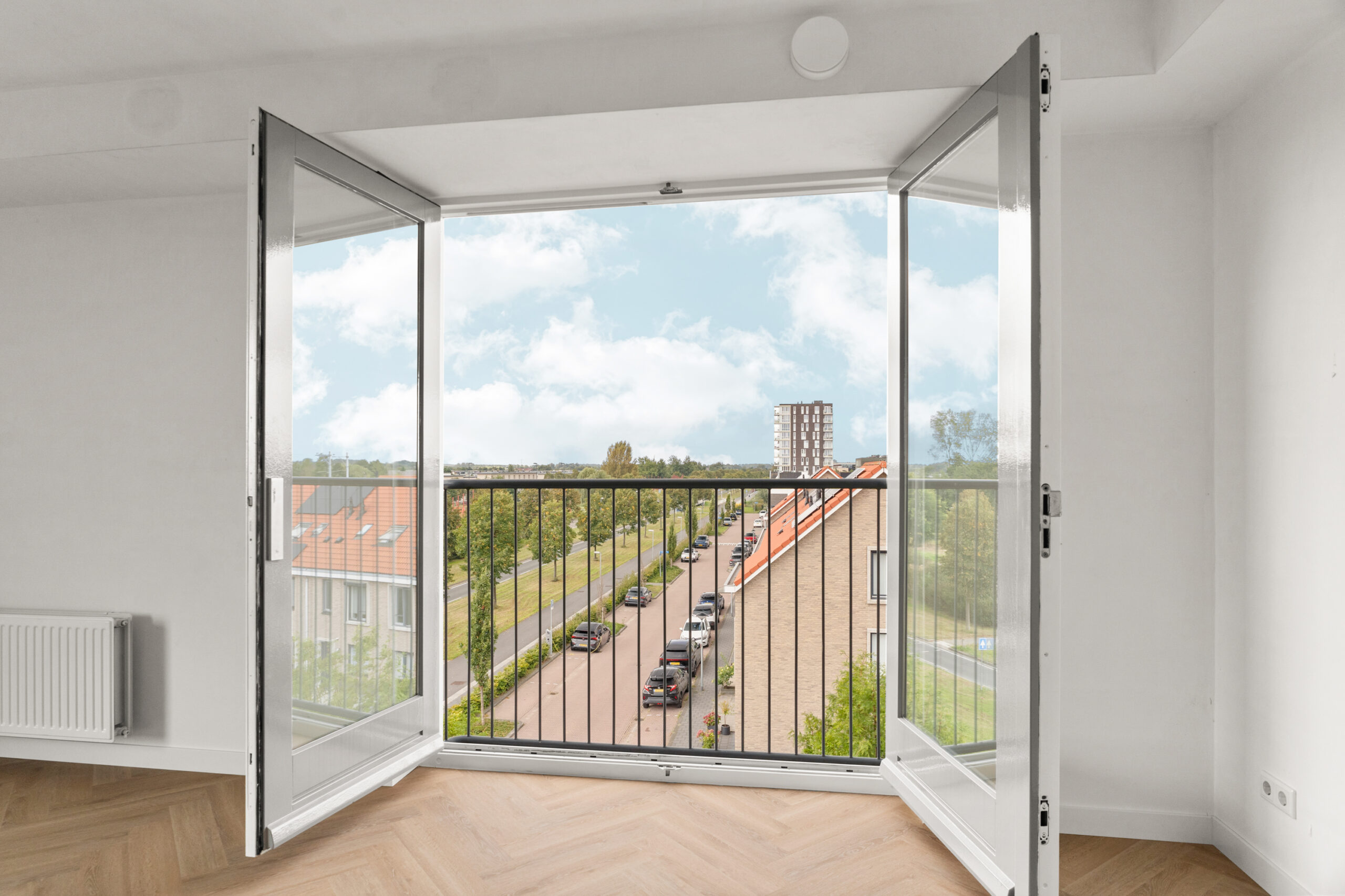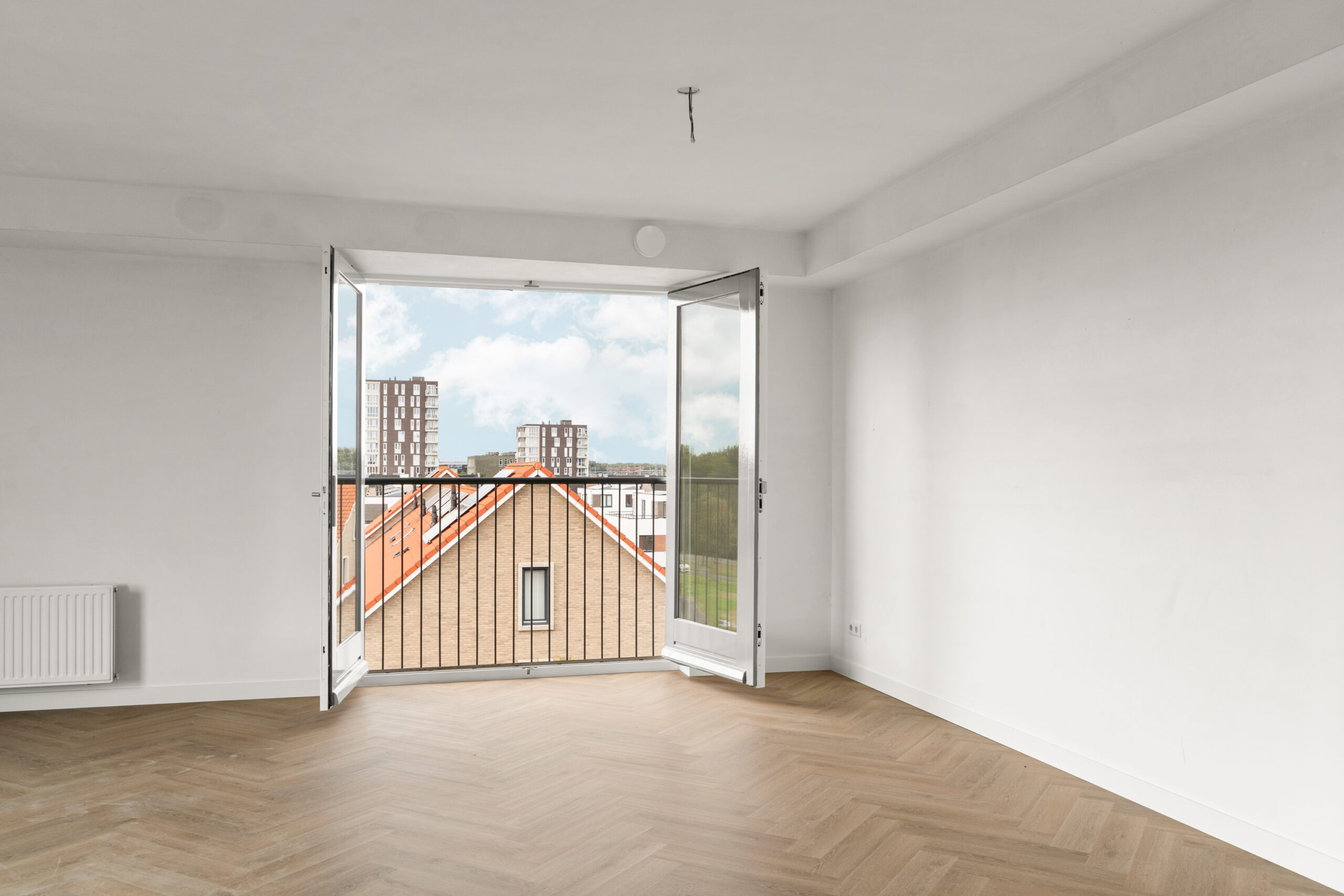 - Lichte woonkamer door de grote raampartijen en een frans balkon op het zuidwesten.