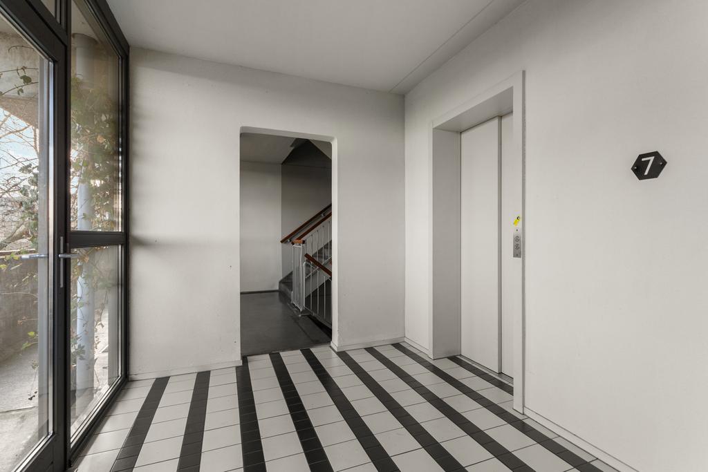 Even before you step into this fantastic apartment, you experience the benefits of the location; right next to the elevator, on the seventh floor, and also the corner. Expansive views and privacy. The spacious hall houses the meter cupboard and wardrobe; your storage paradise for coats, bags, shoes, and more!
