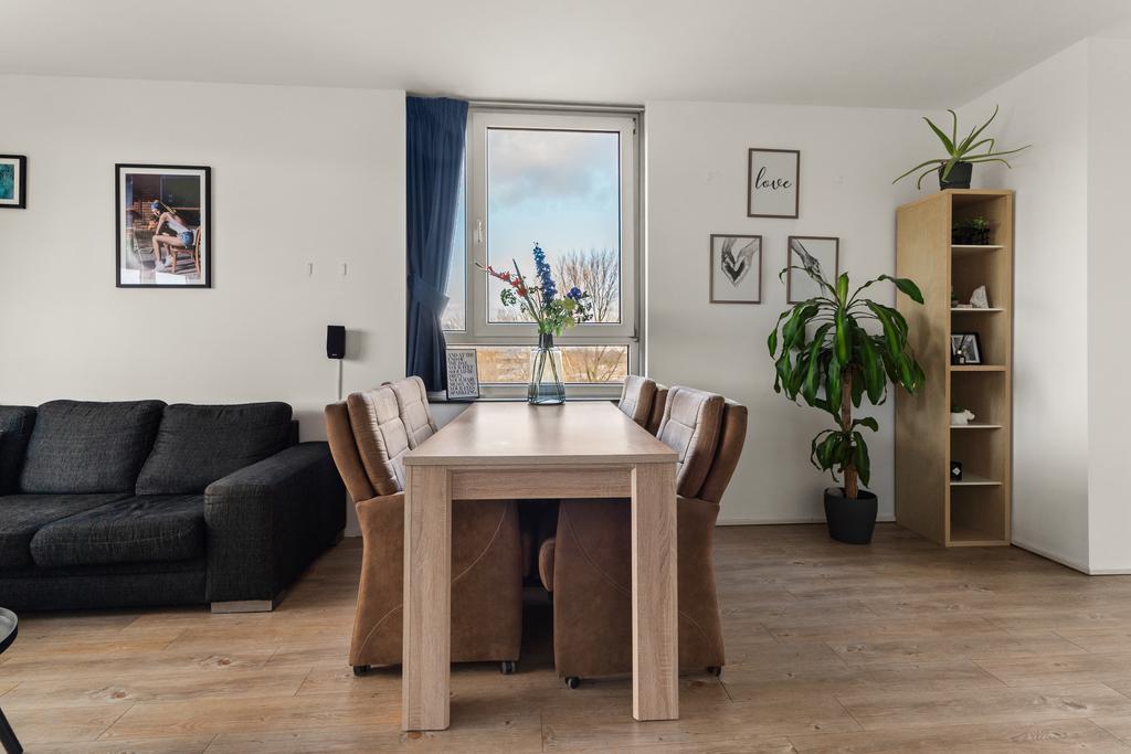 Bij binnenkomst omarmt de lichte en balkongerichte woonkamer je direct, profiterend van extra lichtinval door de gunstige hoekligging. Ruimte genoeg voor een grote eettafel bij de raampartij, zodat je tijdens het tafelen volop kunt genieten van het prachtige uitzicht over het park en de wijk. De zithoek grenst aan het ruime balkon (N-W) dat middels een openslaande deur is te betreden. De ruimte biedt eventueel zelfs ruimte voor een werkhoek.