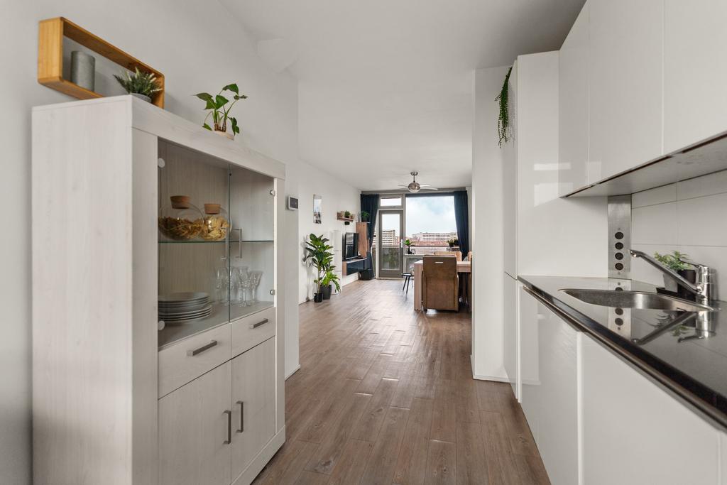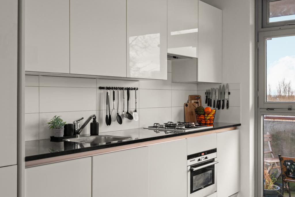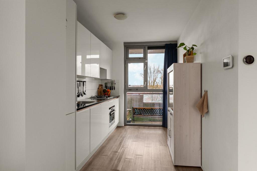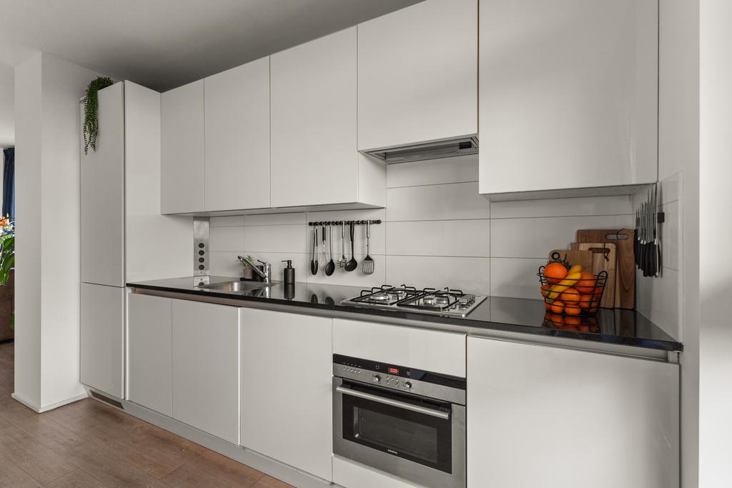 De moderne open keuken in lichte kleurstelling is gelegen aan de voorzijde van het appartement en beschikt over veel kastruimte en diverse inbouwapparatuur zoals: een 4-pits gaskookplaat, afzuigkap, combi-oven magnetron, vaatwasser en een koel-vriescombinatie.