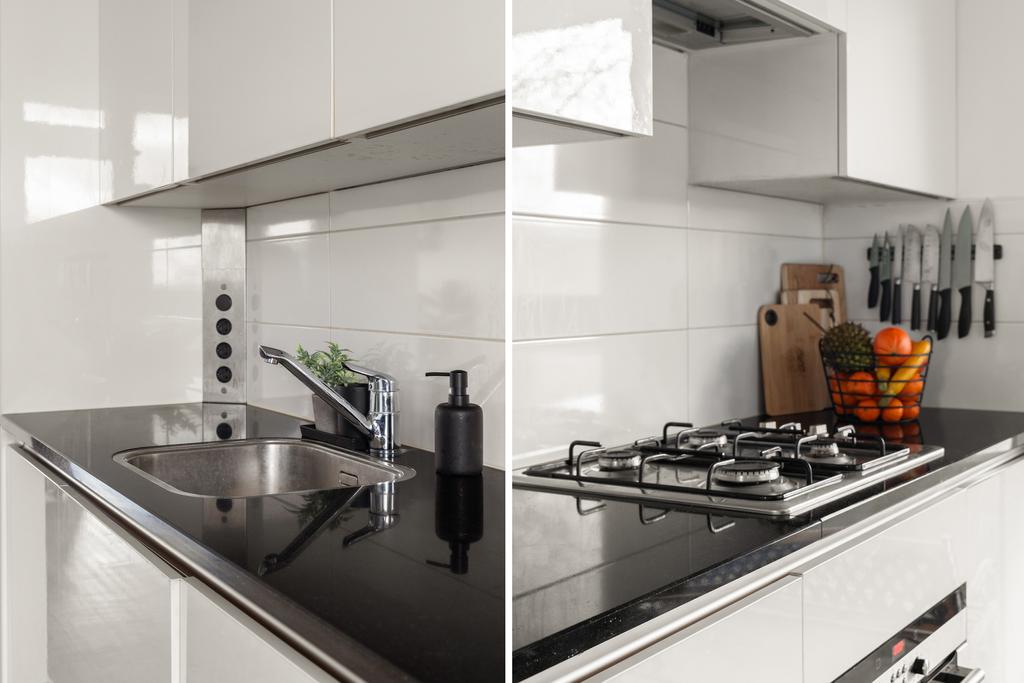The modern open kitchen in a light color scheme is located at the front of the apartment and has plenty of cupboard space and various built-in appliances such as a 4-burner gas hob, extractor hood, combi-oven microwave, dishwasher, and a fridge-freezer.