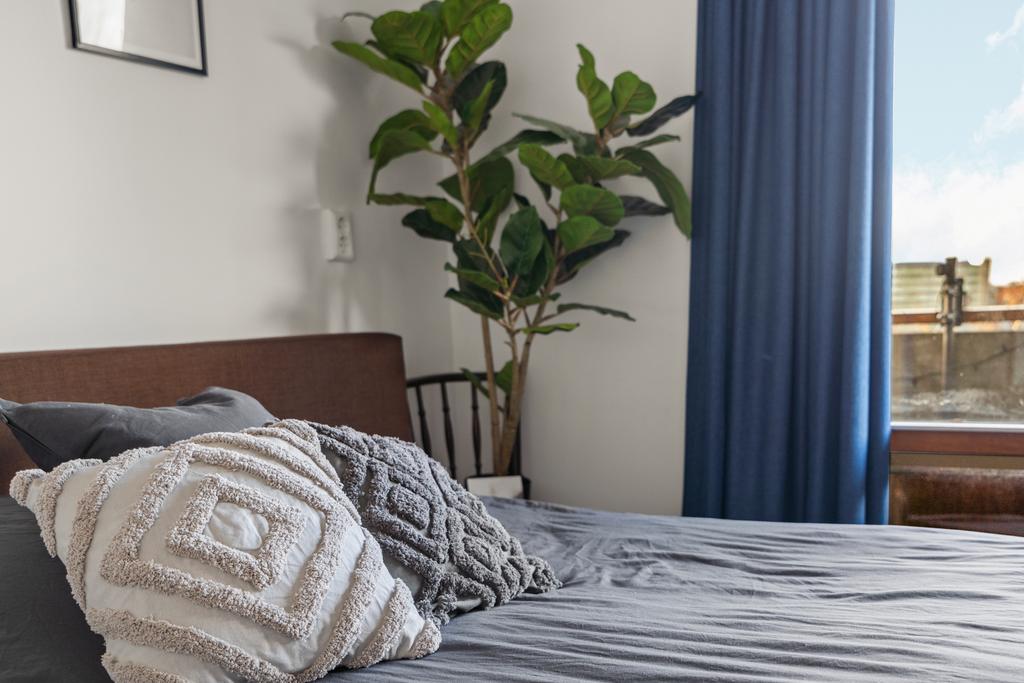 De ruime slaapkamer (circa. 12m²) bevindt zich aan de achterzijde en geeft directe toegang tot het balkon. In deze slaapkamer is voldoende ruimte voor een tweepersoonsbed en een grote kledingkast. De opstelling voor de wasmachine/droger bevindt zich in een aparte kamer, bereikbaar vanuit de slaapkamer.